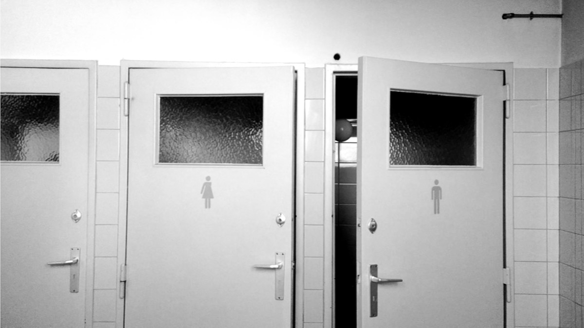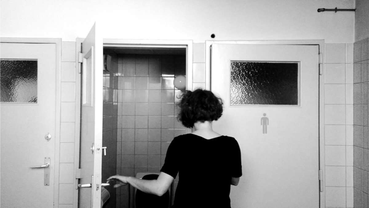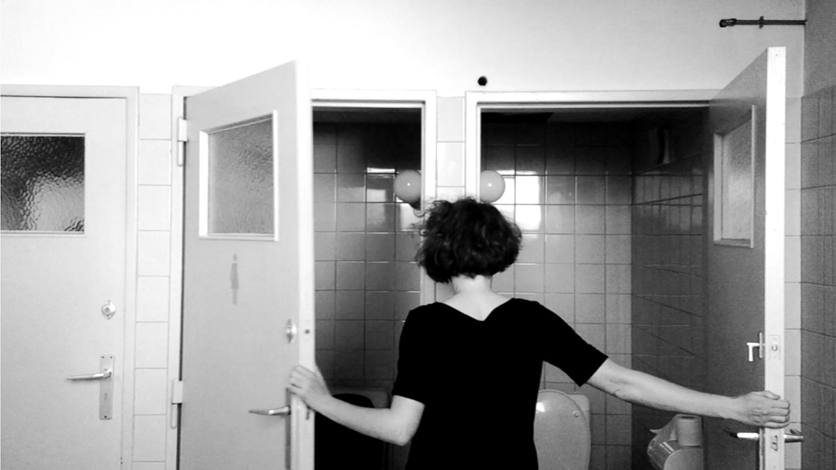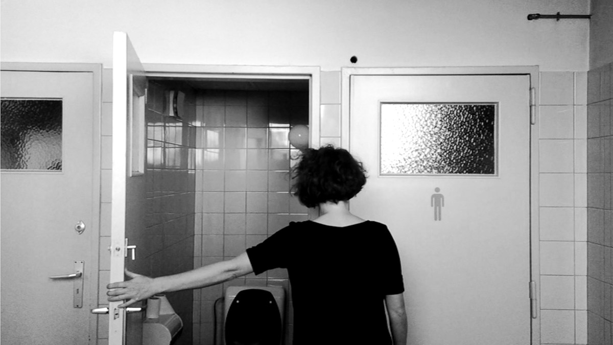 Videoperformance6:40 min Actus II - Residency in La Fabrique de Theatre, BelgiumSite-specific Videoperformance with the two toilet doors which make grand noise and speak to each other. A conversation.