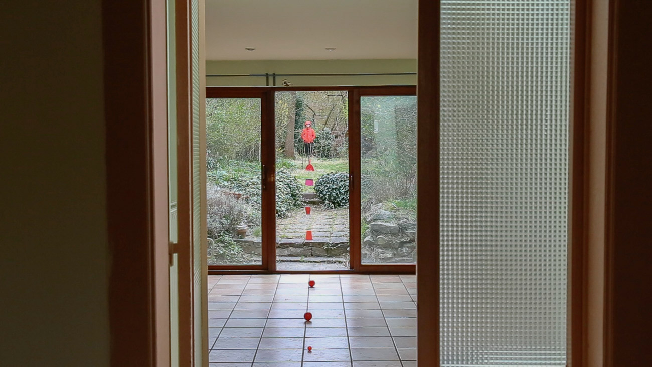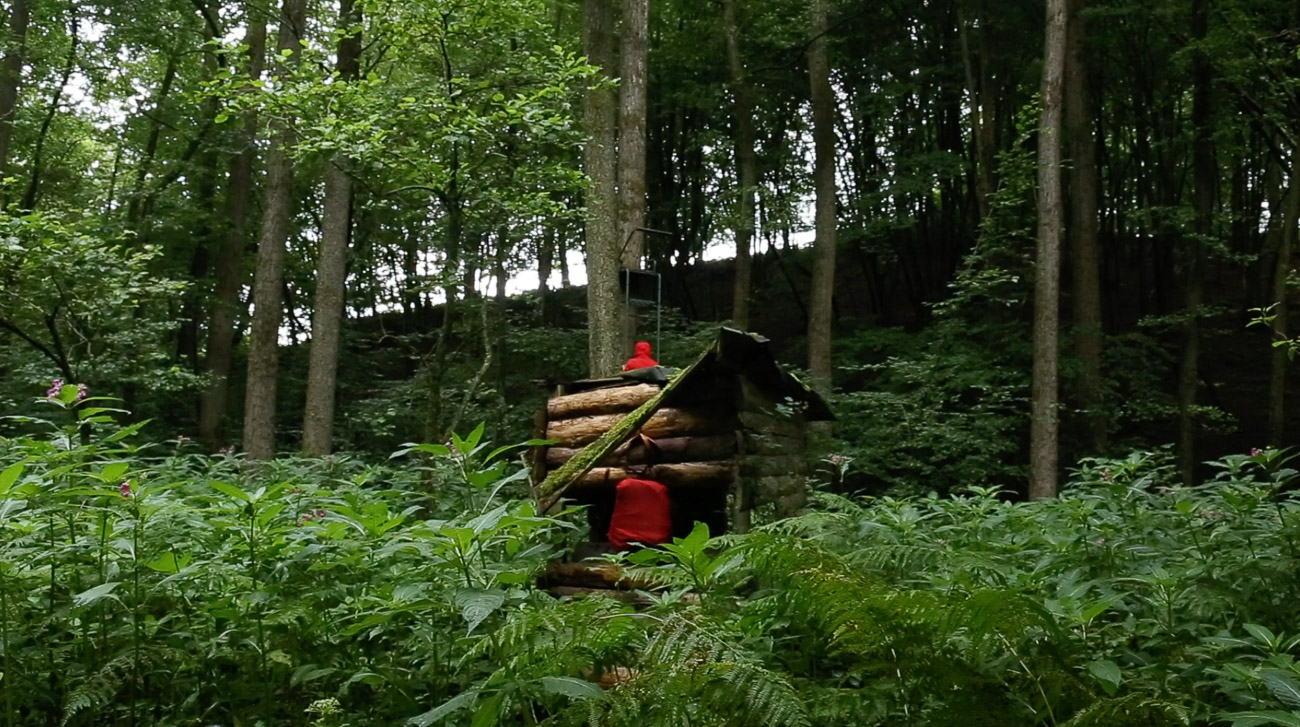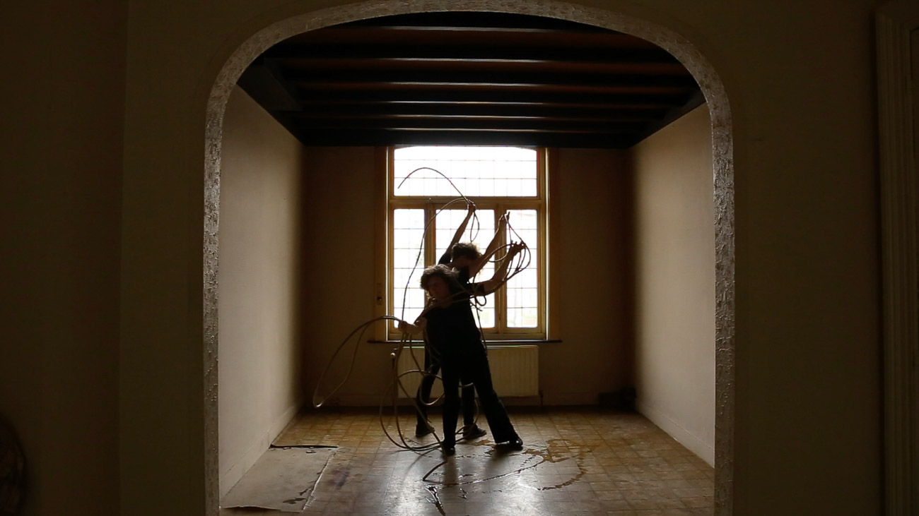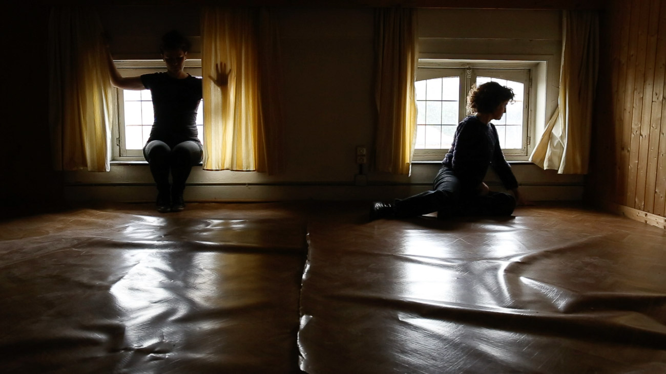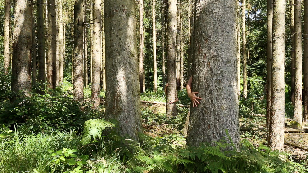 ICI=HIER is a collection of video performances, solos made during lockdown and duos made during two residencies. We enjoy to make clear and simple choices of actions, we blend into the space, using our skin to create a dialogue with the wood (of the trees or the beams). In others, we chose a colourful object linking our bodies and interacting with the space by creating contrasts. Our actions are playful, sometimes sensual, sometimes absurd, like magicians whose tricks are almost trivial, yet poetic.