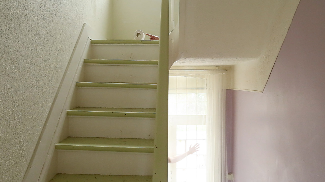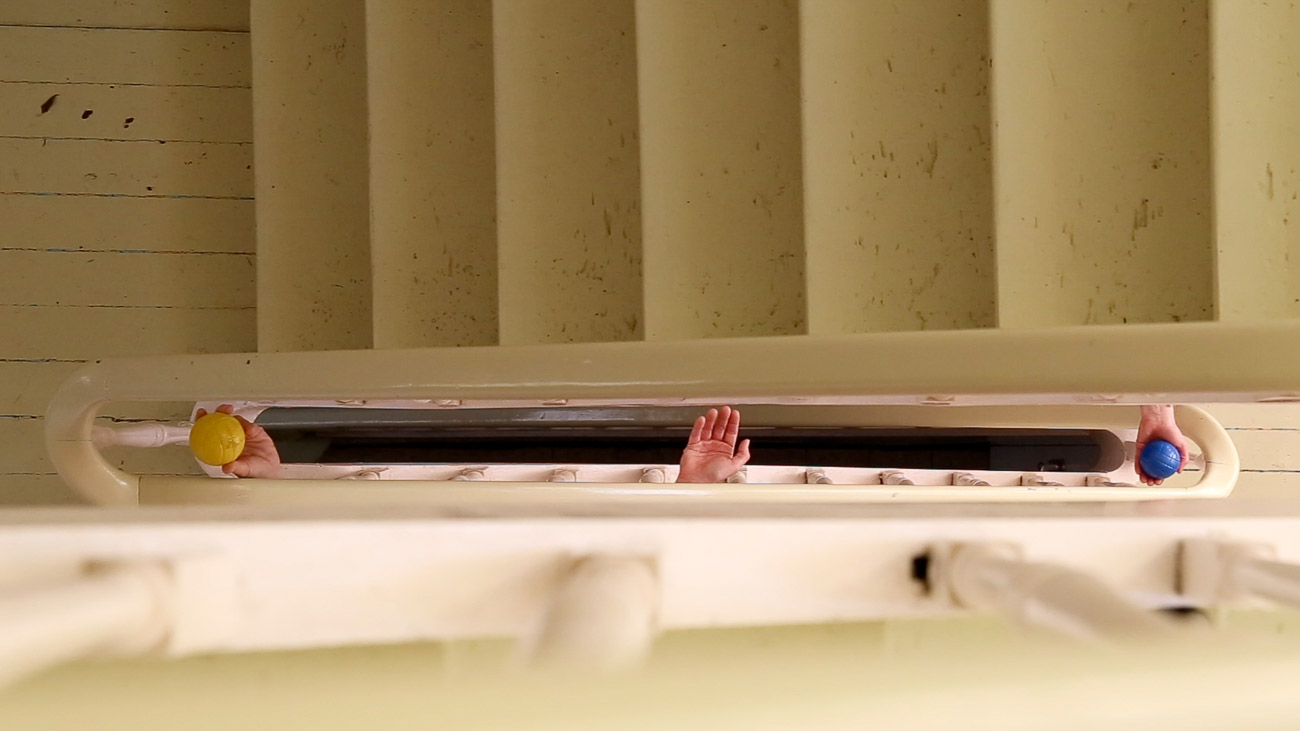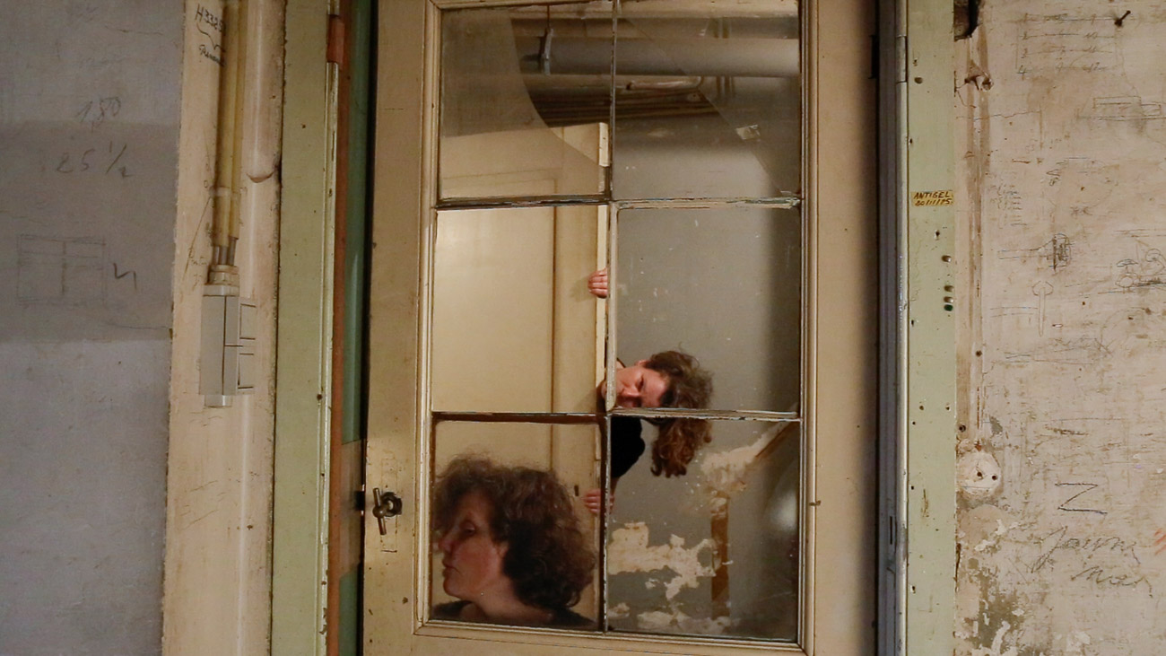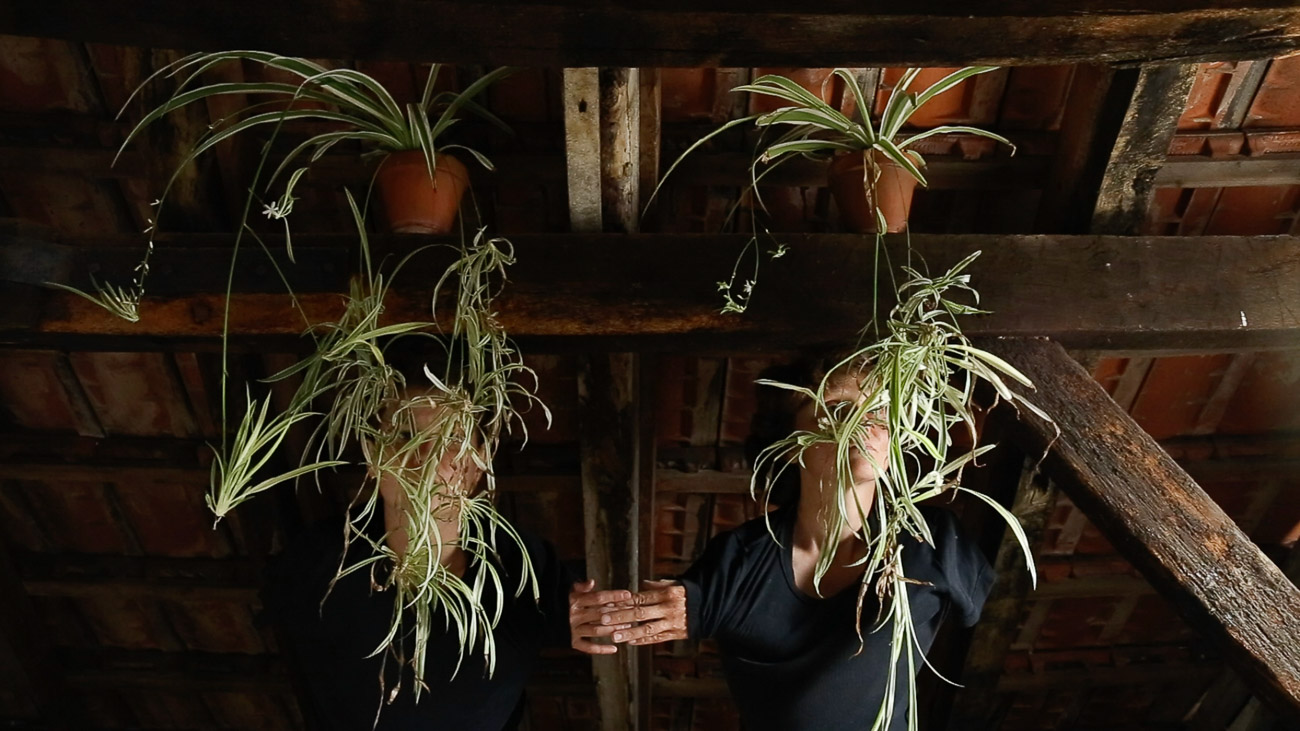 ICI=HIER is a collection of video performances, solos made during lockdown and duos made during two residencies. We enjoy to make clear and simple choices of actions, we blend into the space, using our skin to create a dialogue with the wood (of the trees or the beams). In others, we chose a colourful object linking our bodies and interacting with the space by creating contrasts. Our actions are playful, sometimes sensual, sometimes absurd, like magicians whose tricks are almost trivial, yet poetic.