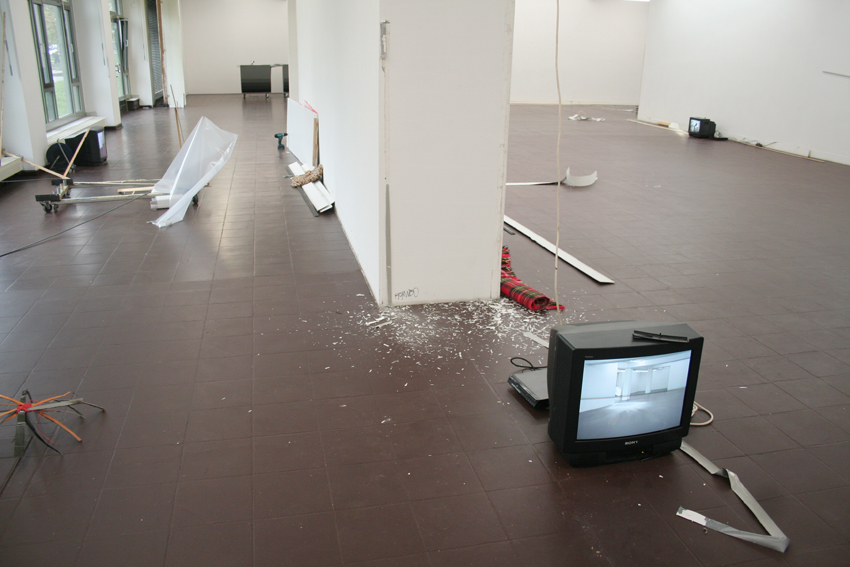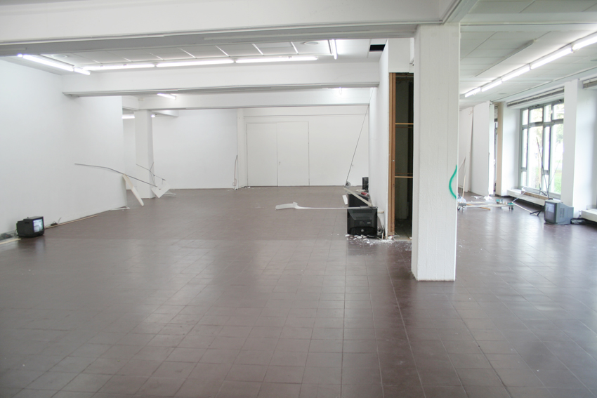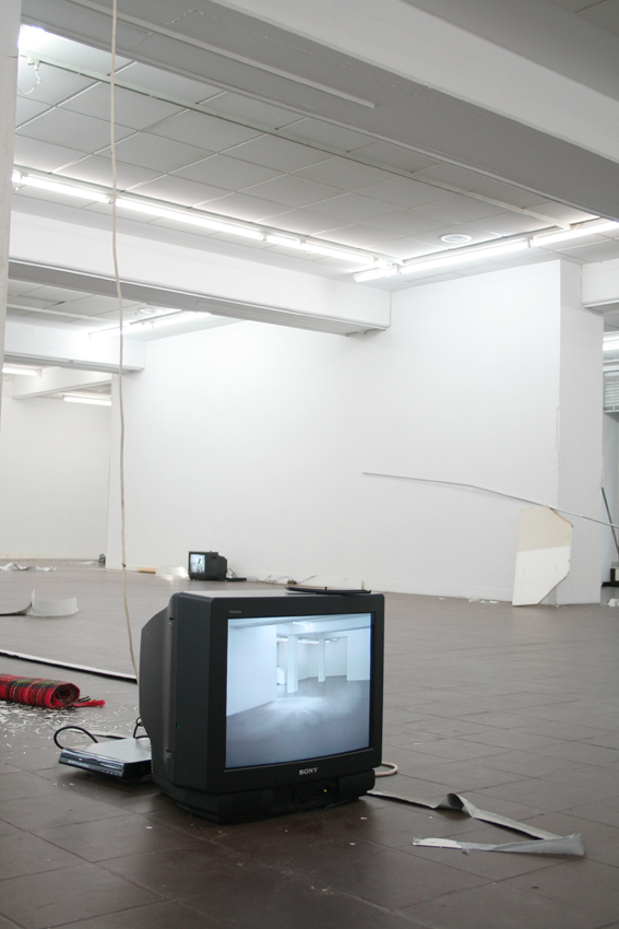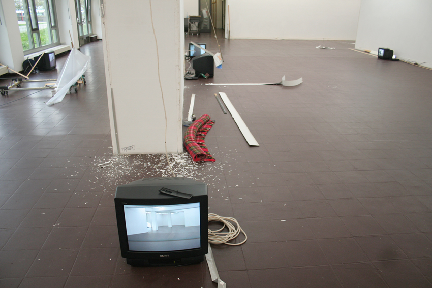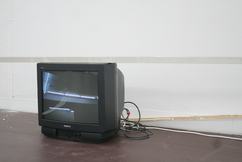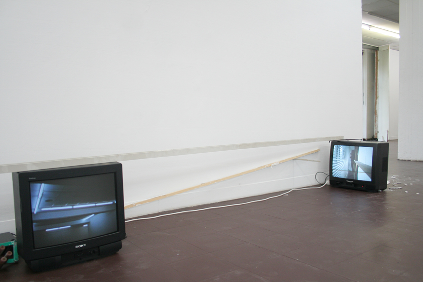 The video "Rollotango" shows the play of me and the blinds. It is a game of light. Next to it the video "Light", as well shot on Super8mm, shows the lights of the space switched on and off. A rhythmic light-choreography. In the videoperformance "Wasserstand" I react to the flood marks in the space. In the videoperformance "GummiGummi" I interact with one column of the space, trying to run into the space but beeing pulled back of the strong elastic ribbon around my waste. A Sisyphus-work. "Mehlhand" shows the performance of being in another liminal space, throwing one kilo of flower into the space from the hollow ceiling of the space. The interaction of the monitors with the videoperformances and the space-deformation of Marcel Hiller.