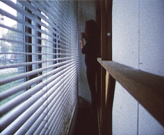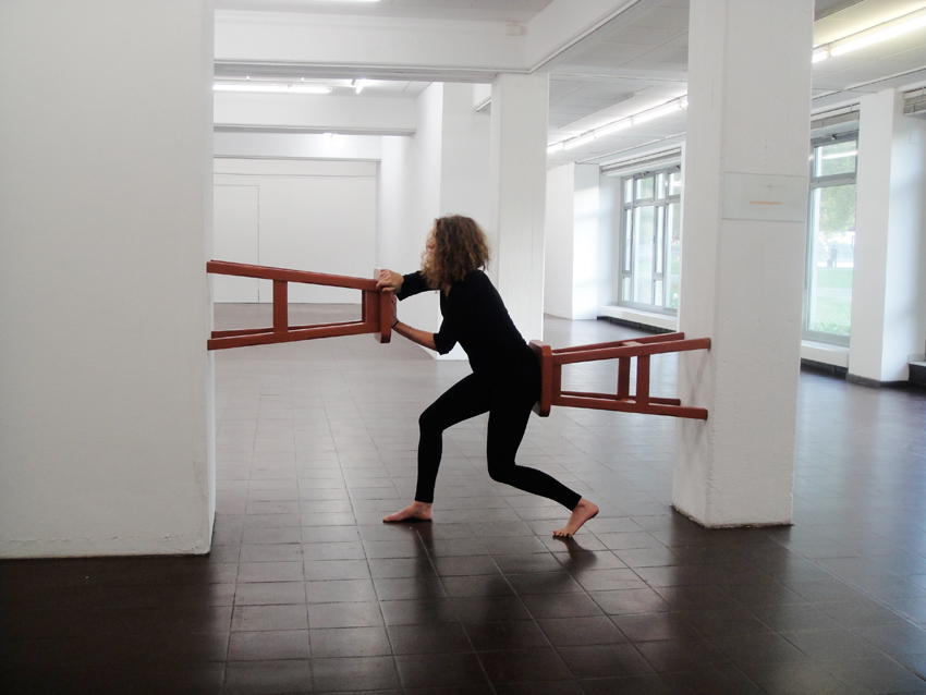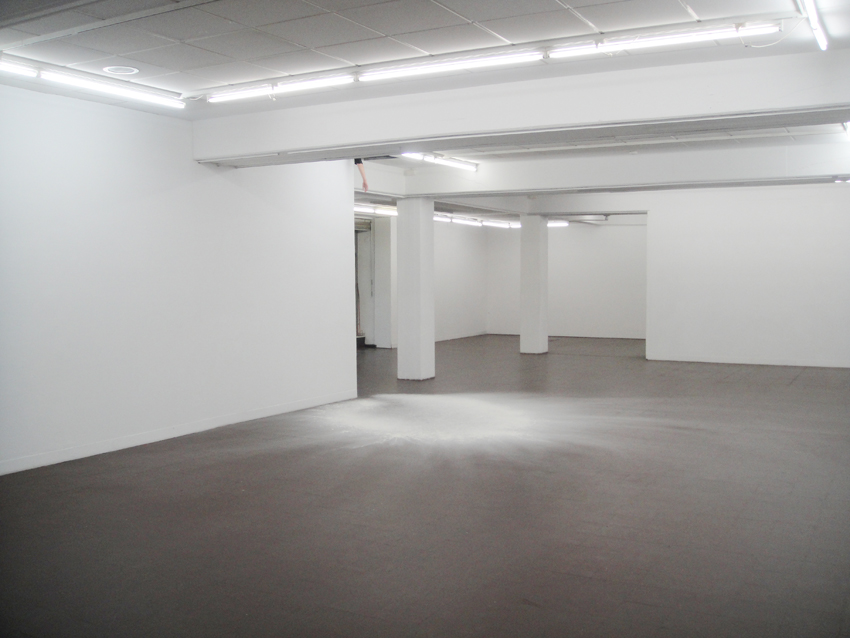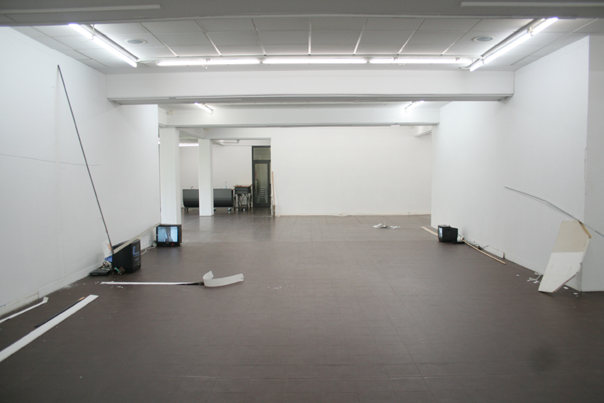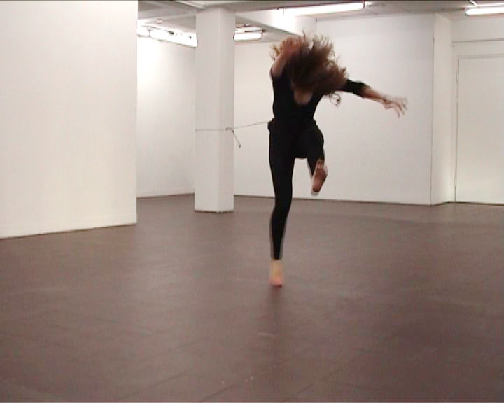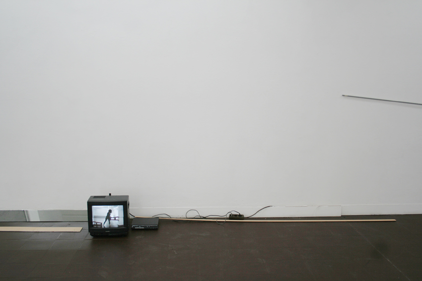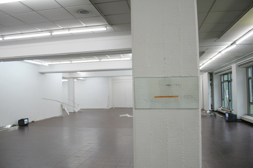 The video "Rollotango" shows the play of me and the blinds. It is a game of light. Next to it the video "Light", as well shot on Super8mm, shows the lights of the space switched on and off. A rhythmic light-choreography. In the videoperformance "Wasserstand" I react to the flood marks in the space. In the videoperformance "GummiGummi" I interact with one column of the space, trying to run into the space but beeing pulled back of the strong elastic ribbon around my waste. A Sisyphus-work. "Mehlhand" shows the performance of being in another liminal space, throwing one kilo of flower into the space from the hollow ceiling of the space. The interaction of the monitors with the videoperformances and the space-deformation of Marcel Hiller.