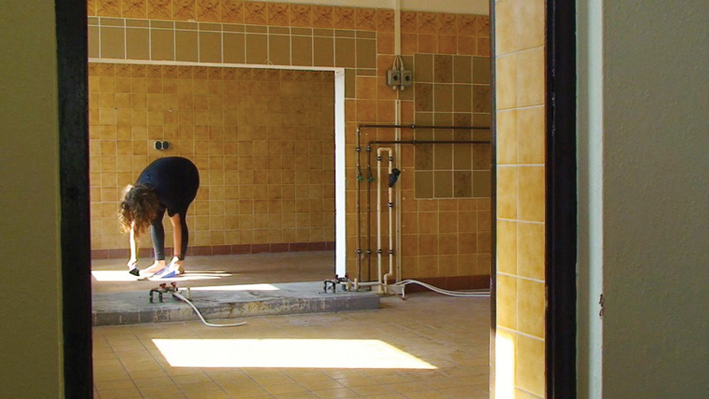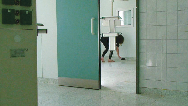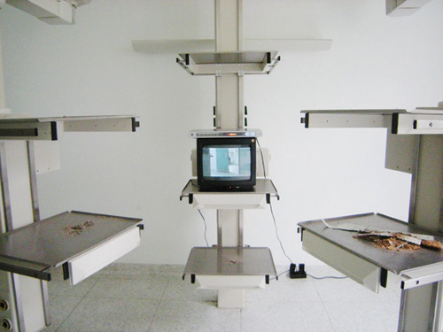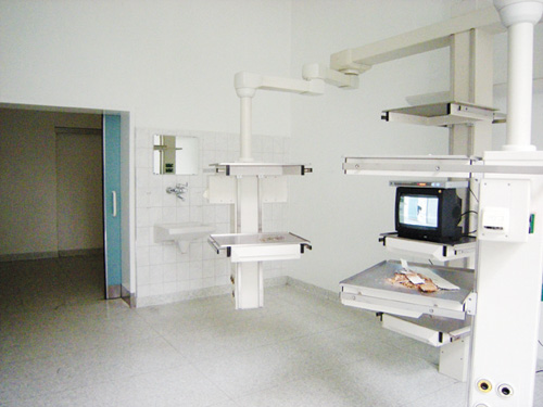 I sweep 5 floors of the empty hospital. The Installation of the dust in a room in the formerly intensive care unit. The platforms for the emergency monitors and hospital machines show the different amounts of dust. In the center the monitor is placed.