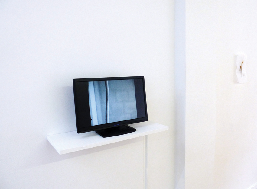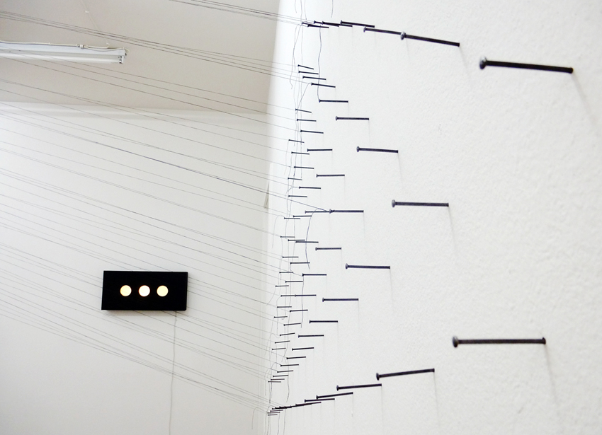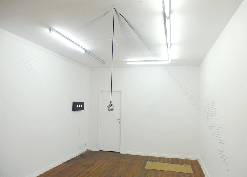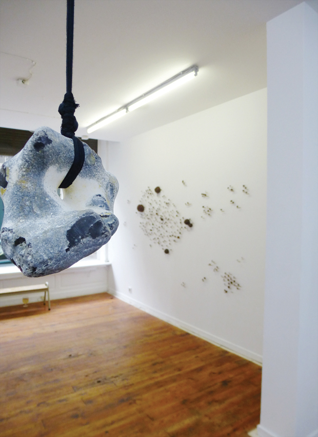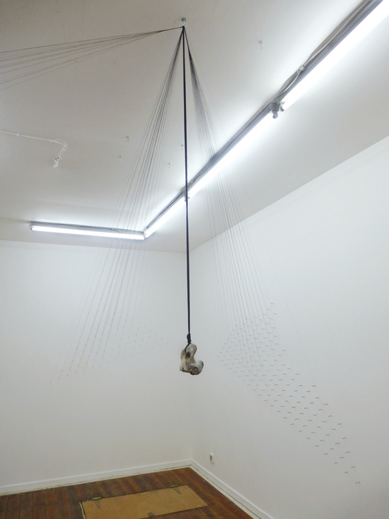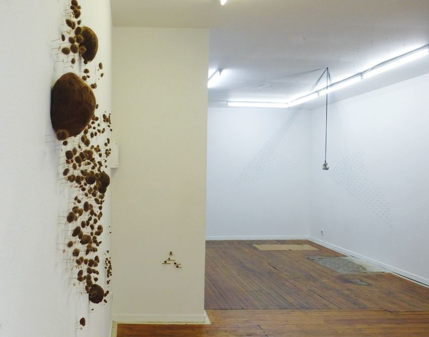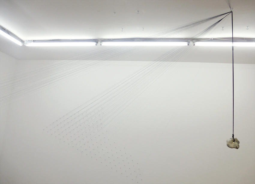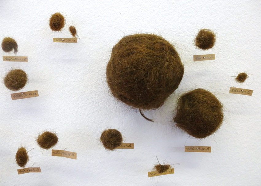 Installation with hairballs I collect everytime I wash my hair. The collection started in 2011 and is ongoing. A contiuous durational performance. The installation with a flint-stone with an "lucky-eye". It is a continuation of the idea of the Performance Steinmusik I in 2012. 1 kilometer of black sewing silk is lead through the lucky-eye. A box with 3 lasered altar breads luminated from the back. It shows lactiferous glands of women. The film Michael was at home and a drawing with fire onto transparent paper. An opening Performance dealing with the space.