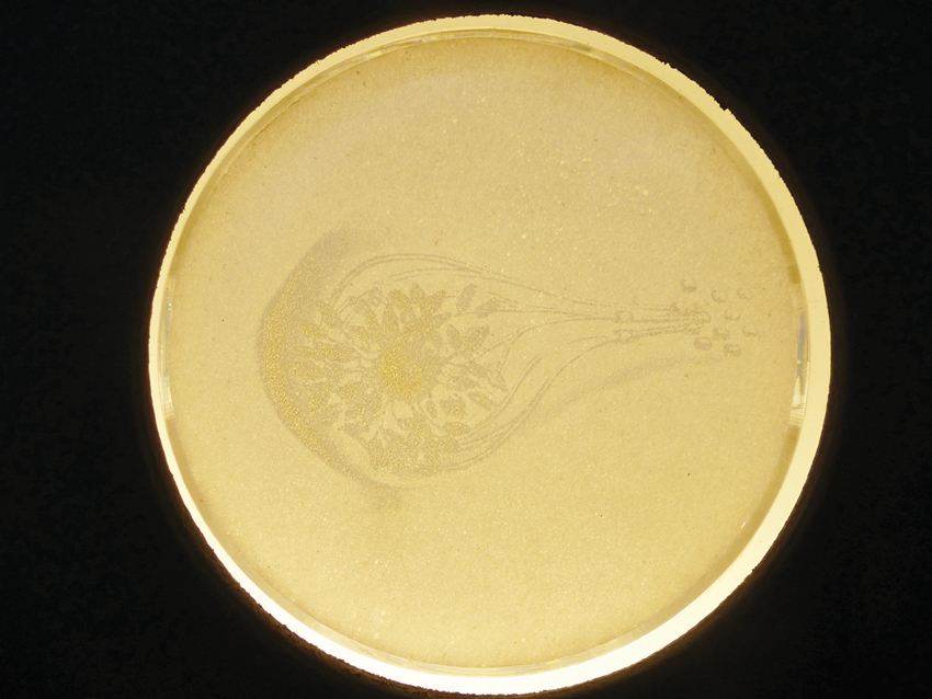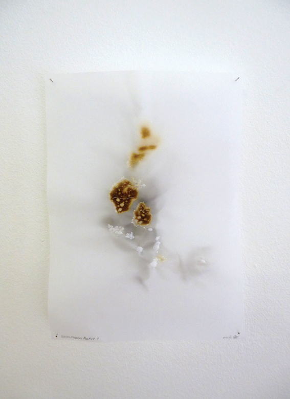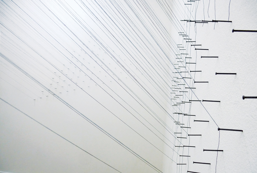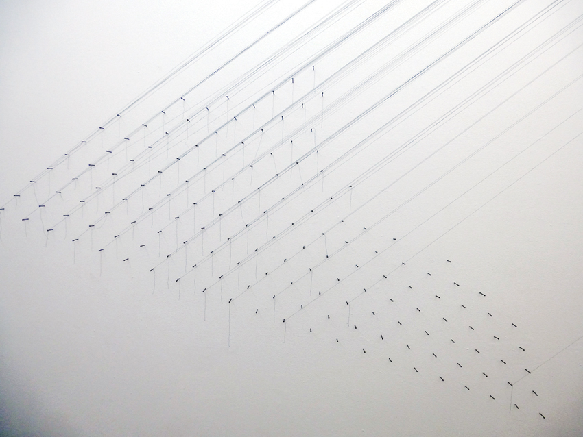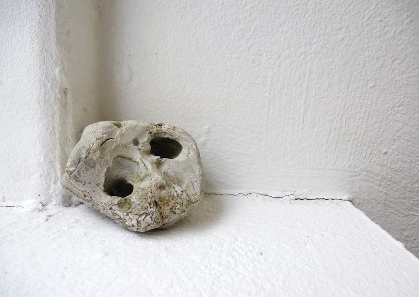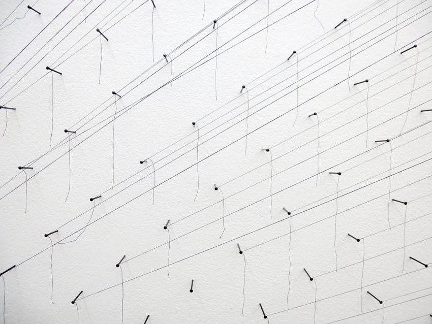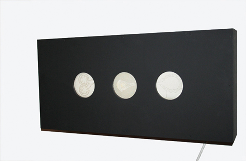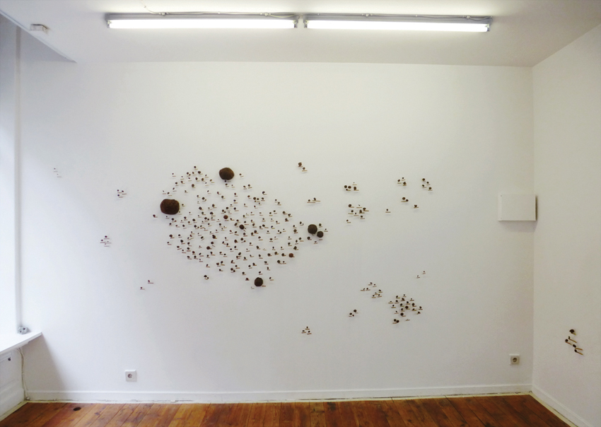 Installation with hairballs I collect everytime I wash my hair. The collection started in 2011 and is ongoing. A contiuous durational performance. The installation with a flint-stone with an "lucky-eye". It is a continuation of the idea of the Performance Steinmusik I in 2012. 1 kilometer of black sewing silk is lead through the lucky-eye. A box with 3 lasered altar breads luminated from the back. It shows lactiferous glands of women. The film Michael was at home and a drawing with fire onto transparent paper. An opening Performance dealing with the space.