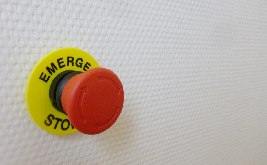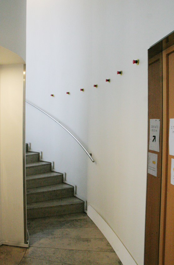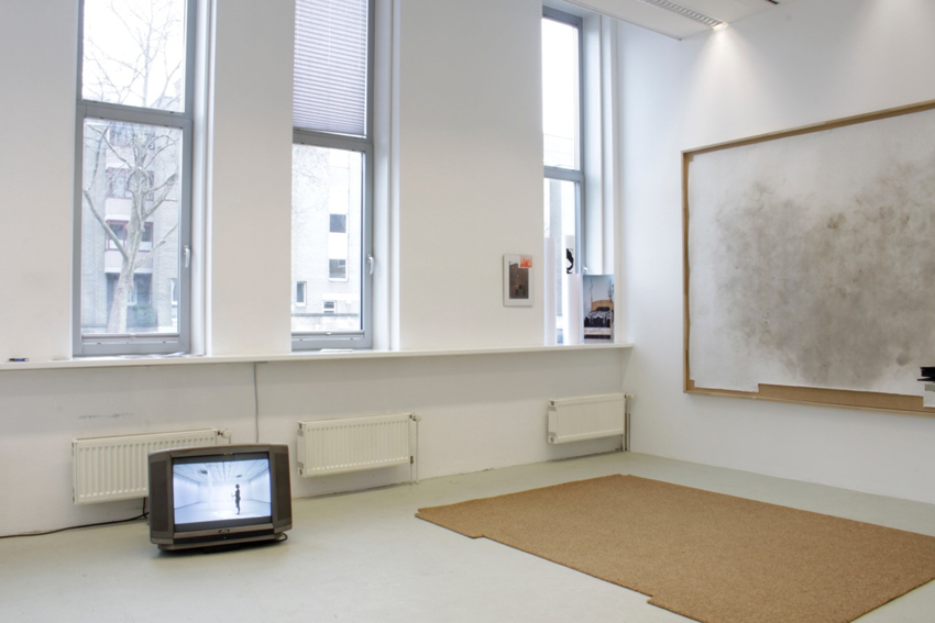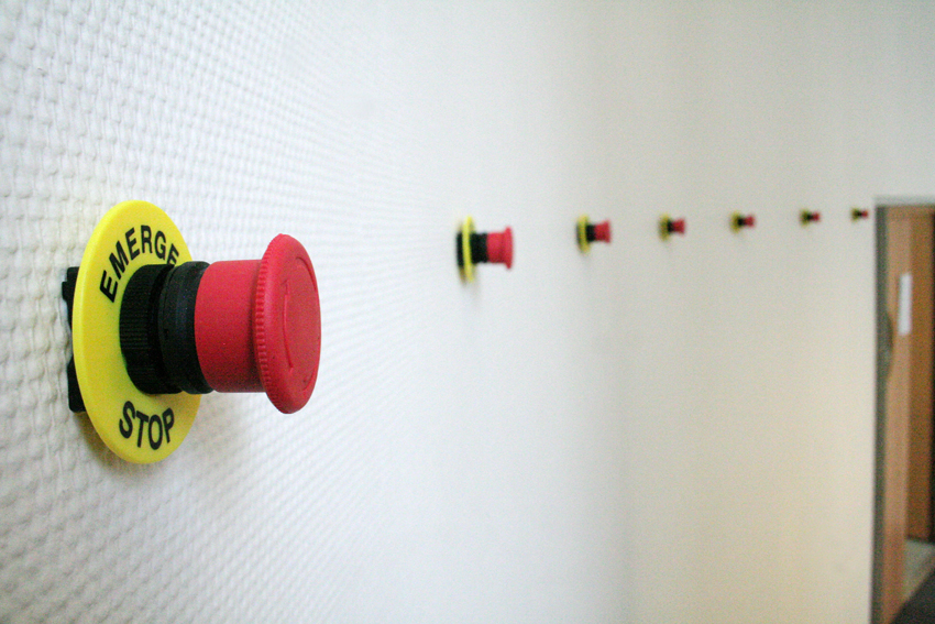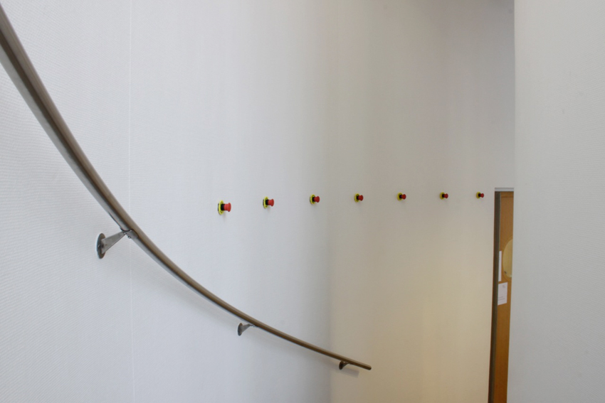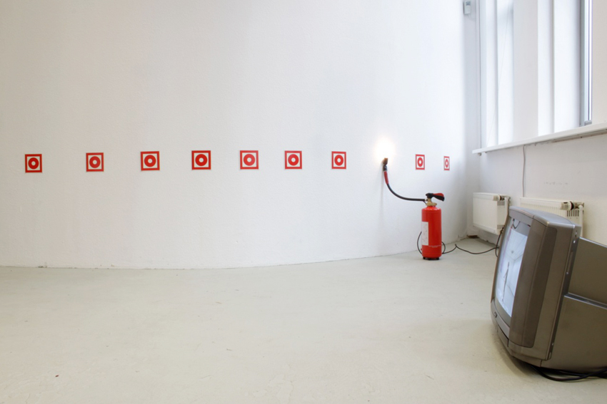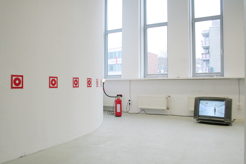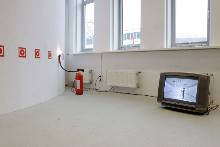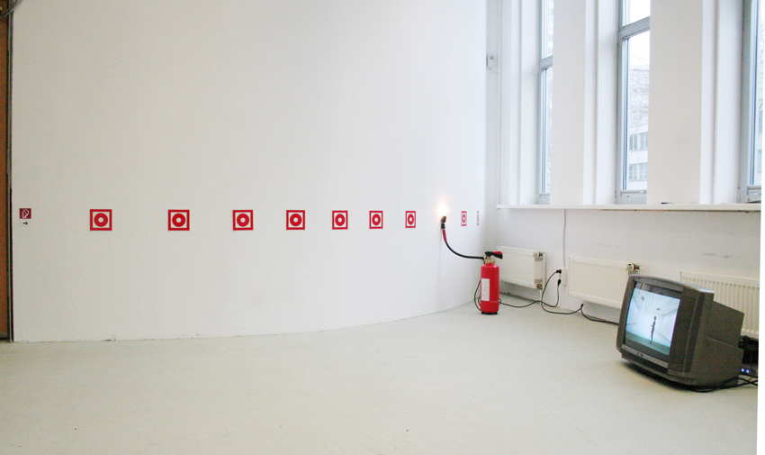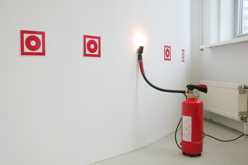Space-related installation and Videoperformance "4 Stunden putzen". The fire extinguishers are objects in the space which disturb most of the artists. Those are objects for safetly. The fire-signs are there to regulate the social behaviour. I was interested to use those objects and ideas of regulation. 10 fire-emergency signs interact with a fire extinguisher from the space which was transformed into a lamp. The user instructions are also transformed into a lamp-instruction. Only the sentece "Vorischt bei elektrischen Anlagen, Nur bis 1000V" are left. The fire extinguisher was used and emptied beforehand to shoot the videoperformance "4 Stunden putzen". On the other side of the wall in the staircase emergency stop buttons are installed. To be pushed.
