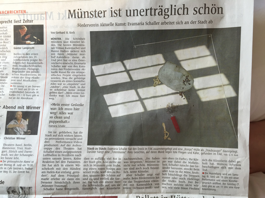 Solo exhibition from 6.6. - 3.7. 2015 in the space of FAK. Space related works, Videoperformances shot in the city of Münster or in the house of FAK. Fotoperformances and found objects.