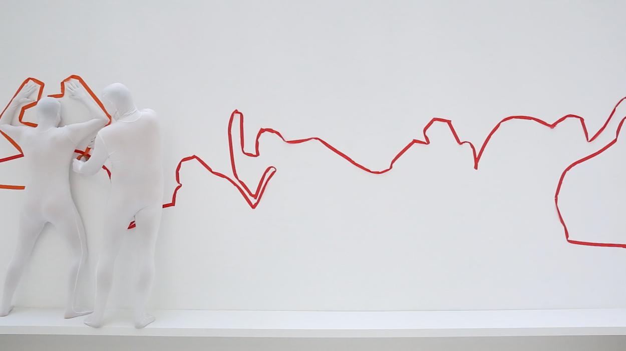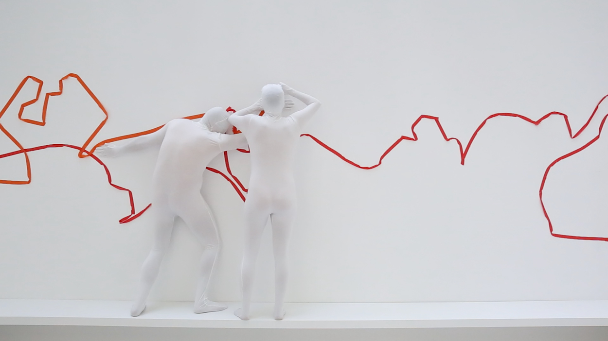 In weiße Ganzkörperanzüge gekleidet, anonymisieren wir unsere Körper und gleichzeitig verschwinden diese fast vor der weißen Wand. Wir werfen uns in verschiedene Posen. Ein grober Umriss unserer oberen Körperhälften wird mit rotem und orangenem Klebeband nachgezogen.