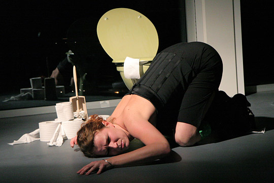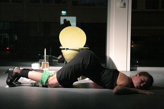 Glas Moog, Art Academy CologneDressed as a business woman working out on a toilet. Narrating about the different kinds, colors, shapes etc. of shit.