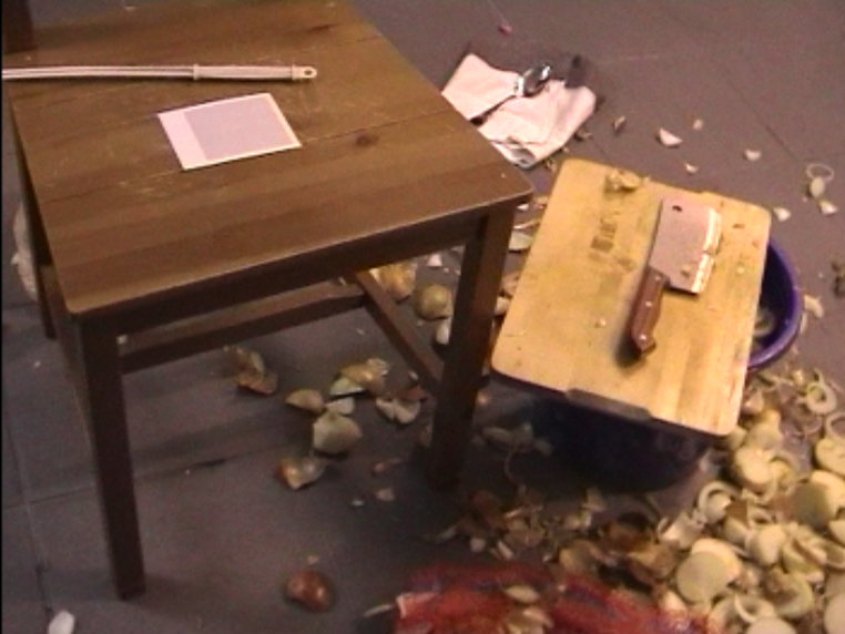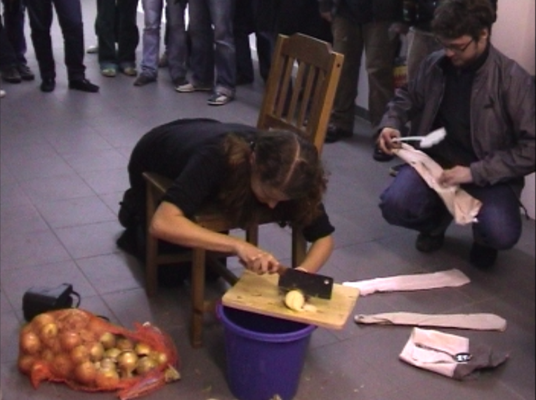 Raum Kalk, CologneChopping onions into a bucket. People of the audience hitting my backside with flyswats until all the onions are chopped. At the end a polaroid of my red whipped ass is taken.