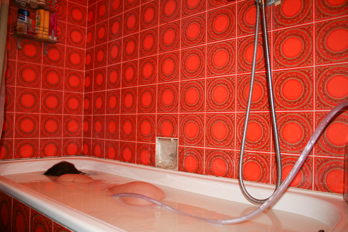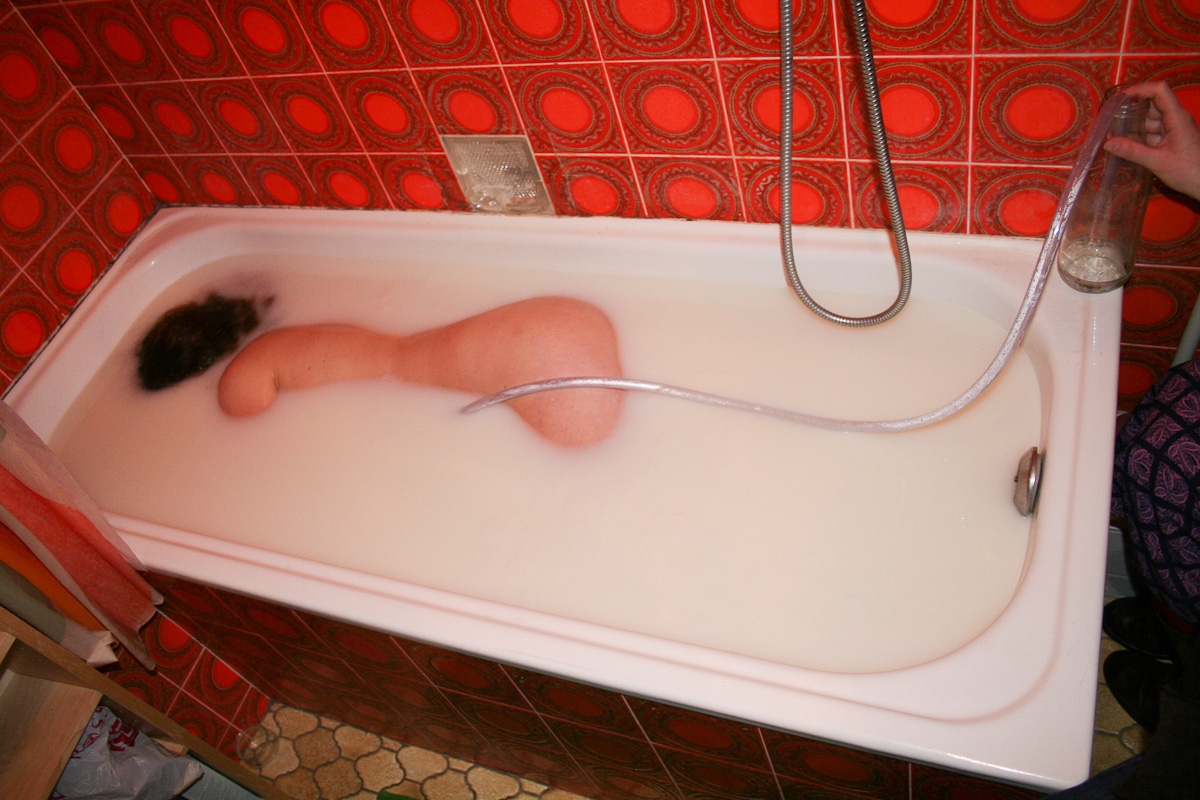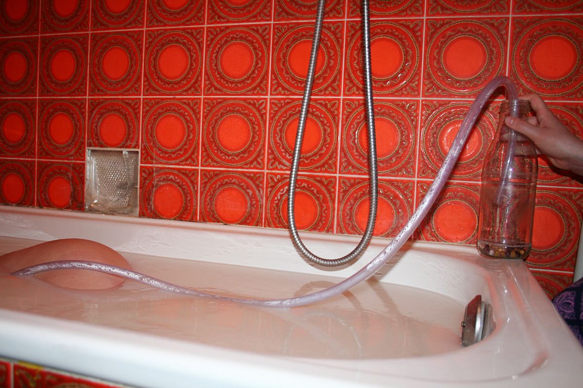 Breathing under milky water through a long plastic pipe into an empty bottle of milk. Spitting one round stone after the other into the bottle. At the end the bathtub is cleared.