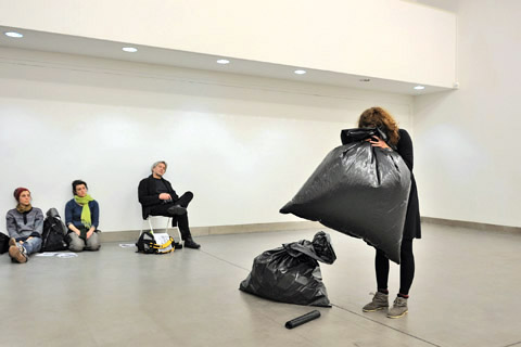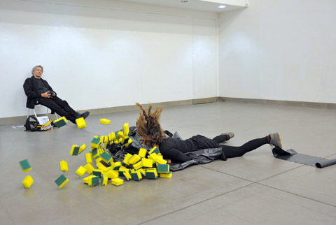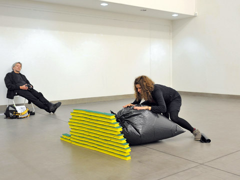 Künstlerforum BonnPerformance at a PAErsche-evening. Blowing up a black garbage bag. Building up a wall with 200 sponges. Blowing away the wall.