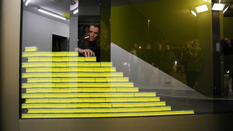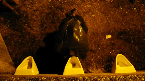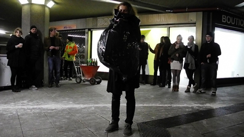3 part site-specific-performance at the exhibition MOFAHÜGEL at Boutique. Blowing up a black garbage bag. Taking nearly 200 sponges and buiding up a wall. Filling a black garbage bag with water and water the toilet-installation of Max Erbacher in urban space Ebertplatz Cologne.