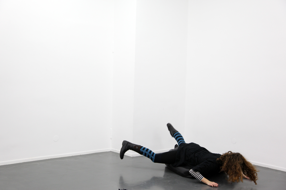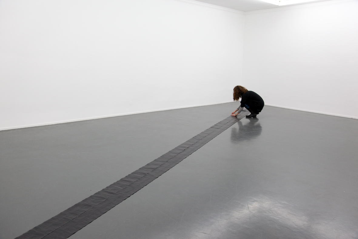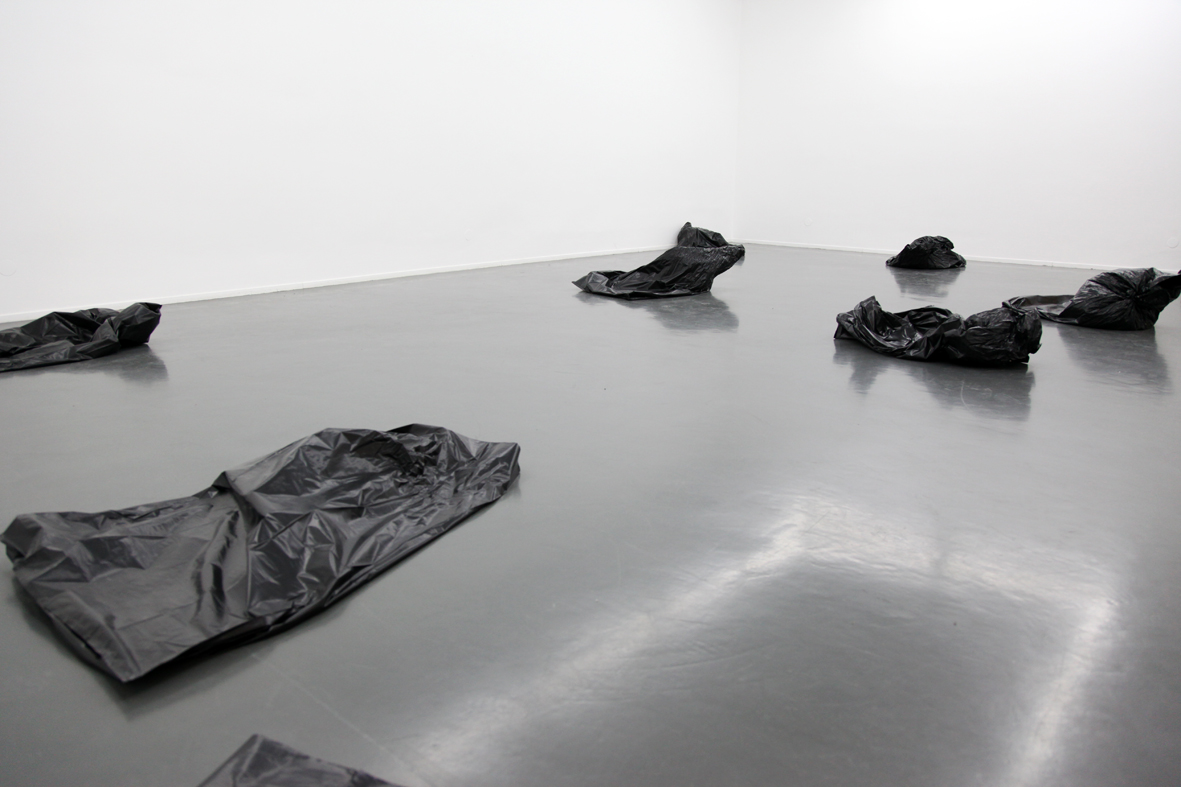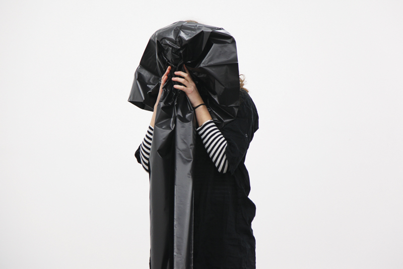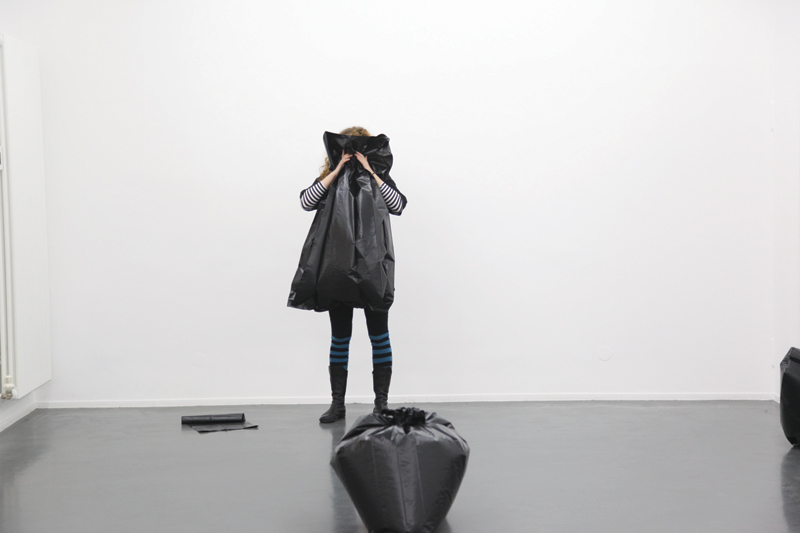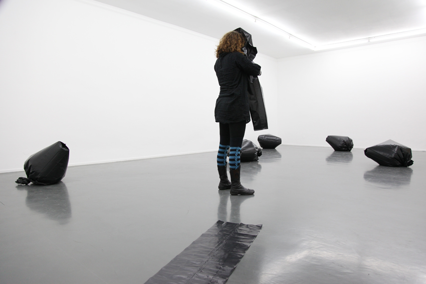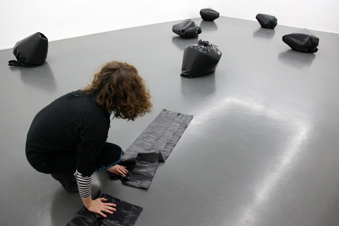 Blowing up black garbage bags for 29 minutes. When the alarm rings I start to burst all of the blown up bags. Those stay as an istallation.