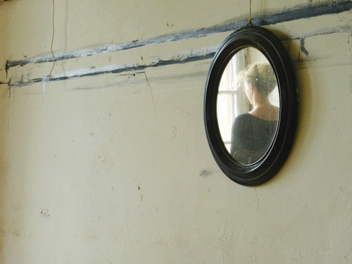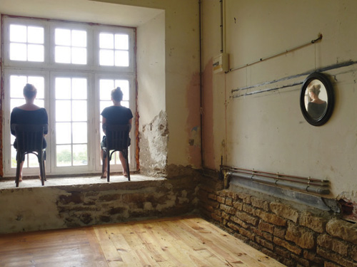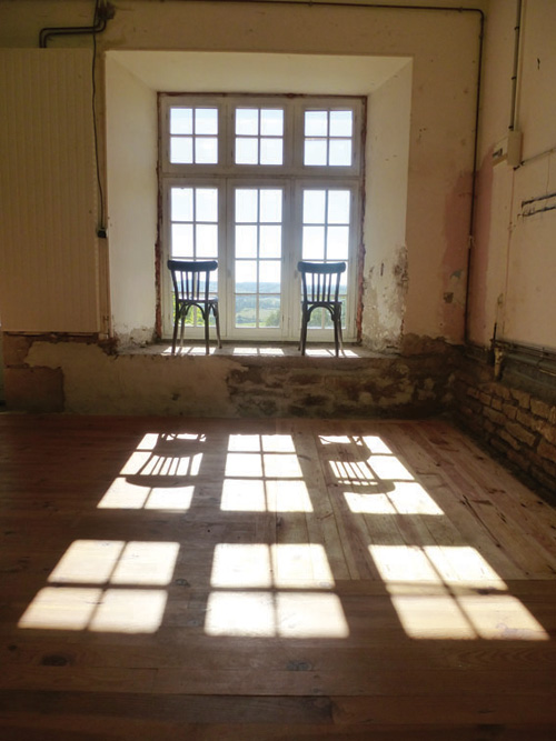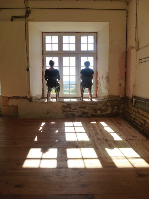 Two wooden chairs put in front of a window. View outside. The two performer start to move nearly invisible and the chairs start to squeak. A communication between the noise of chairs starts. It ends abrupt with squeaking with the teeth. The chair- communication starts again and ends silently.