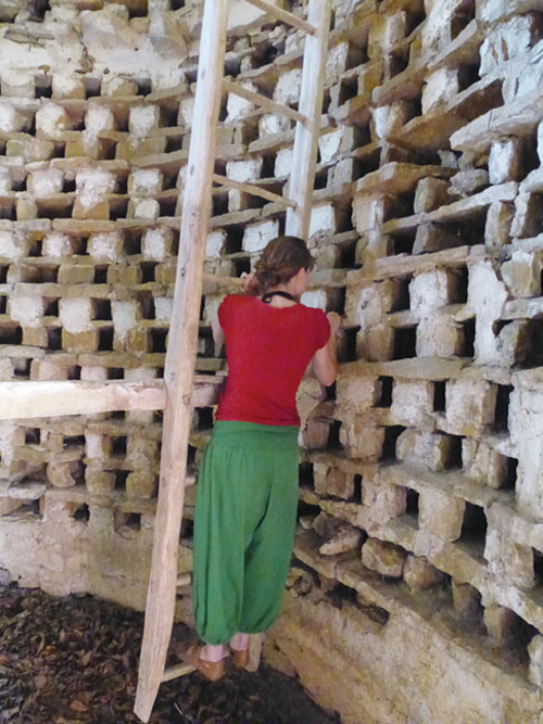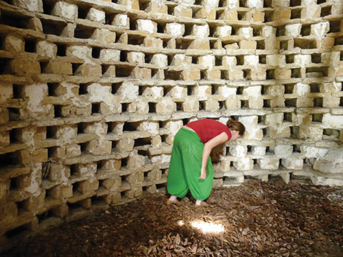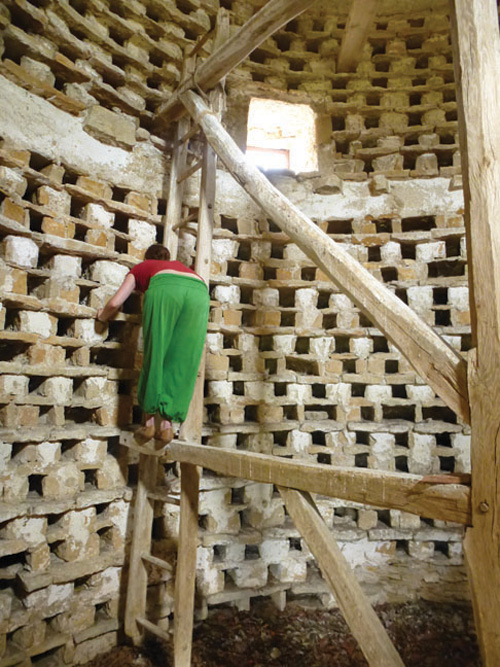 Site-Specific work: In the old Pigeon-Tower of the castle still remains the tower-carousel. Walking on the old leaves, stepping onto the carrousel which makes squeaking noises. Every movement circling in the room produces different noises. The higher I get onto the ladder the more sounds the carrousel makes.