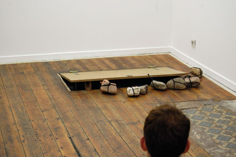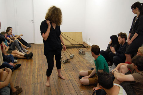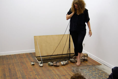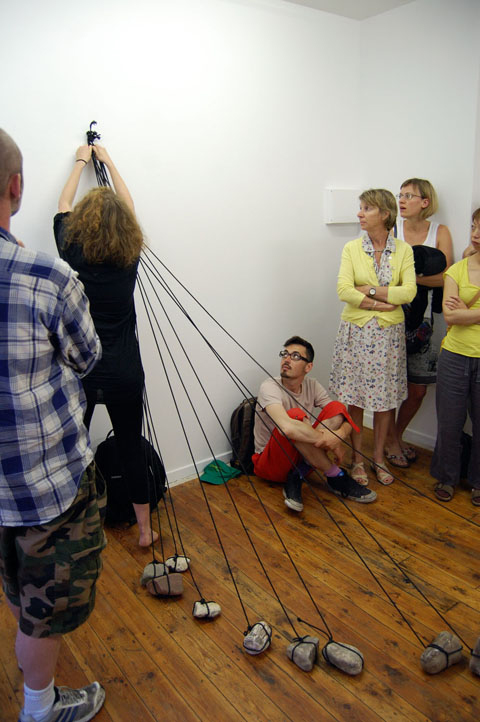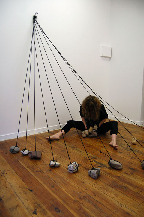 From the cellar of the gallery I put one stone after the other out of the drop bottom. I carry the stones attached to elastic straps to the other side of the space. Variable sizes and weights of the stones let them move differently. I attach the elastics onto the wall, get more stones and build a stone-tower. I try to flip the tower with the stones on elastics.