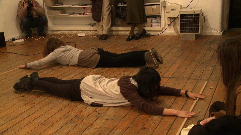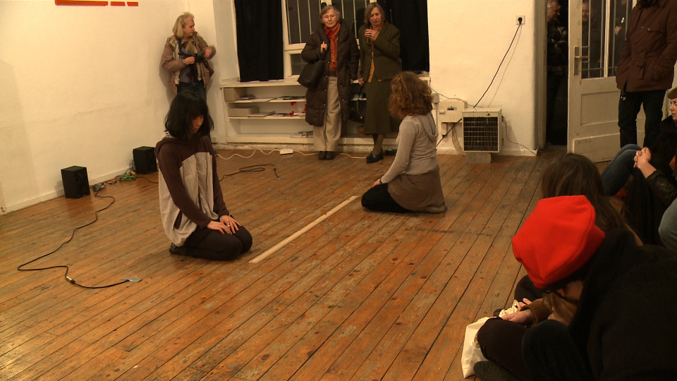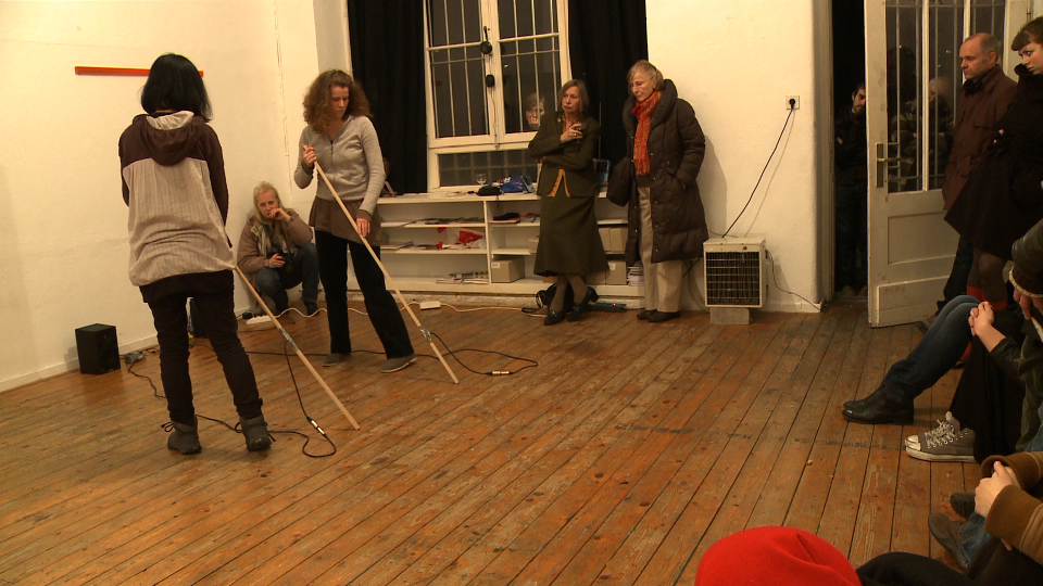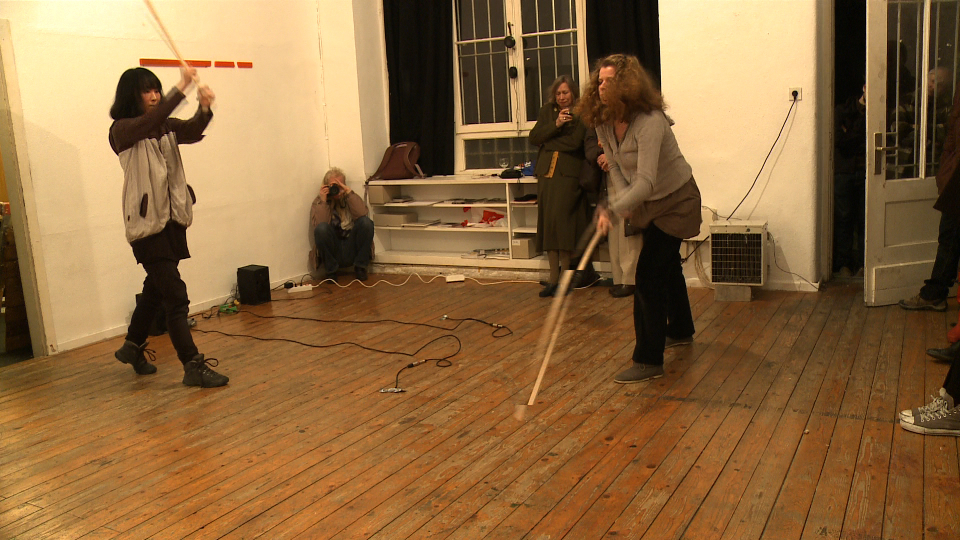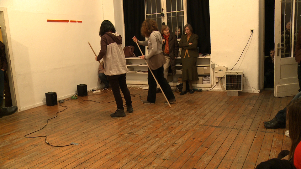 Performance with Ji Hyun Park in her exhibition Das Unvollendete. Taking 3 wood-sticks. Starting to rub them onto the floor, making analog noise with the timber piling. Getting up changing the noise because of using the end of the stick. Sticking contact microphones onto our sticks and play with them. After removal of the mics moving the sticks in the air until one of them breaks.