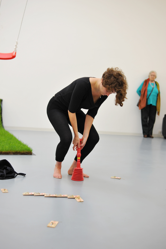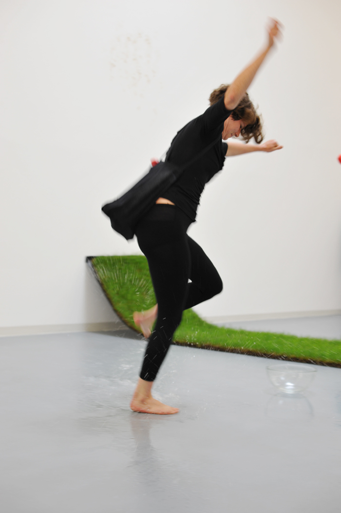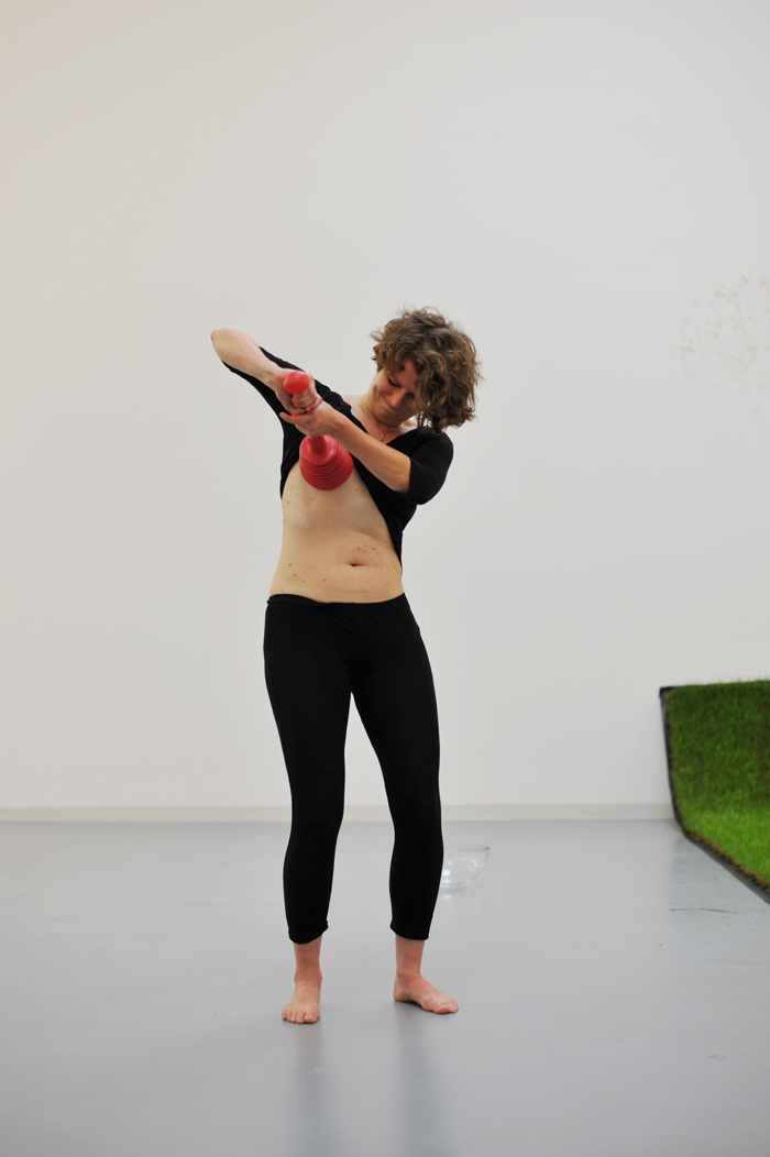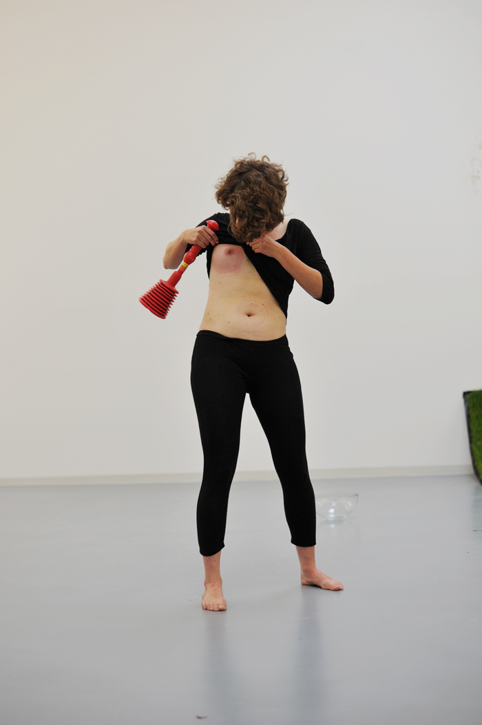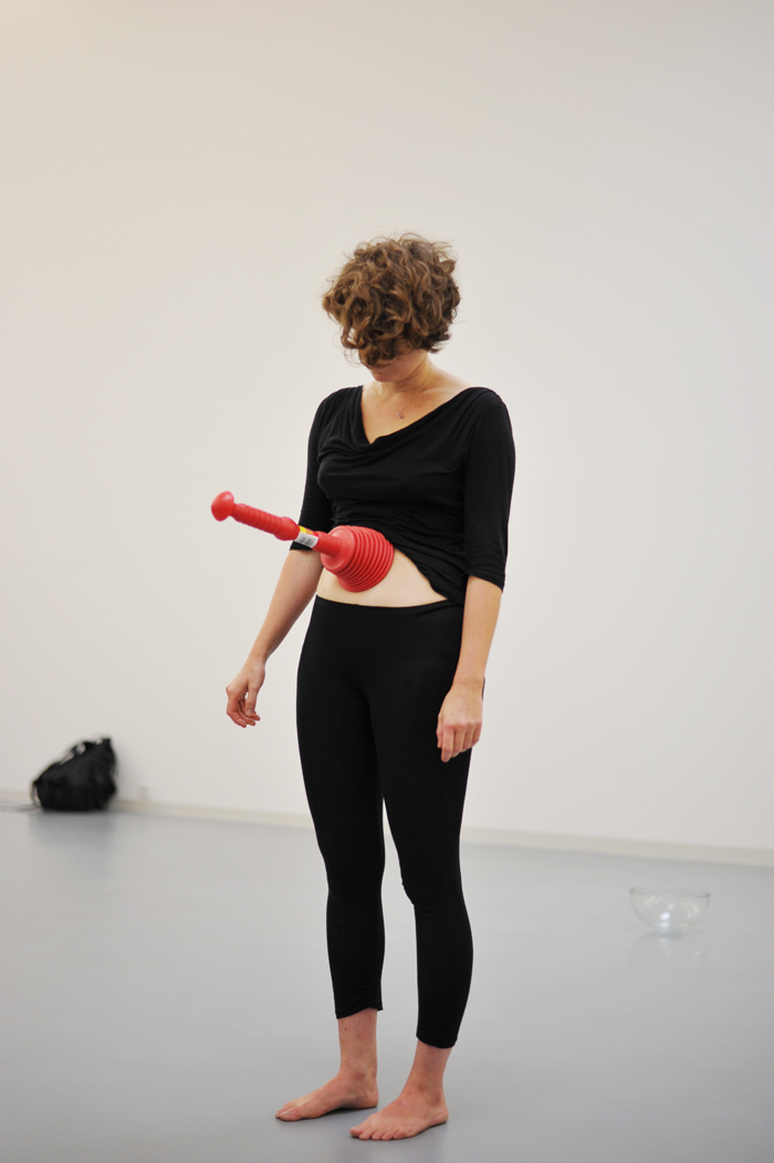 I hold a bowl with water in my hands and start to move the body until the water splashes out of the bowl. I put down the bowl and start to dance on the slippy floor, nearly falling down. I fix mouse traps and try to hit them with my finger that they snap. I start to use a sucking plunger to attach it to my body which makes noises. At the end I read out loud the material of the plunger: EVA