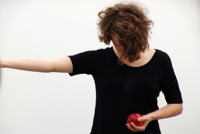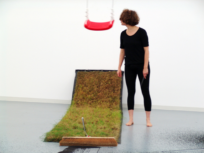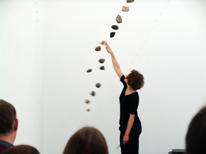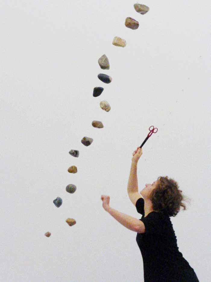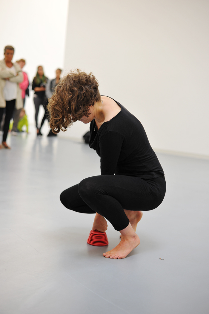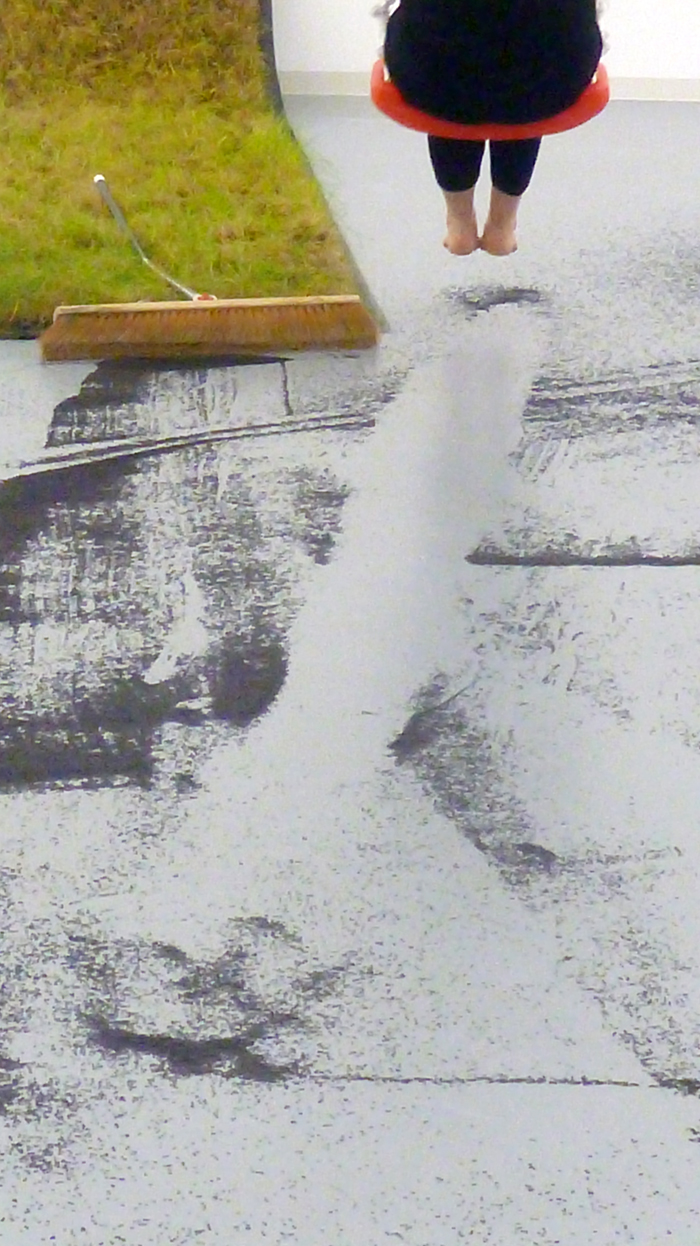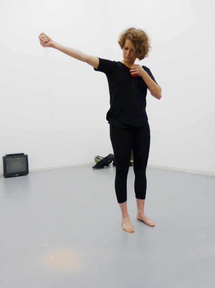 I hold a bowl with water in my hands and start to move the body until the water splashes out of the bowl. I put down the bowl and start to dance on the slippy floor, nearly falling down. I fix mouse traps and try to hit them with my finger that they snap. I start to use a sucking plunger to attach it to my body which makes noises. At the end I read out loud the material of the plunger: EVA