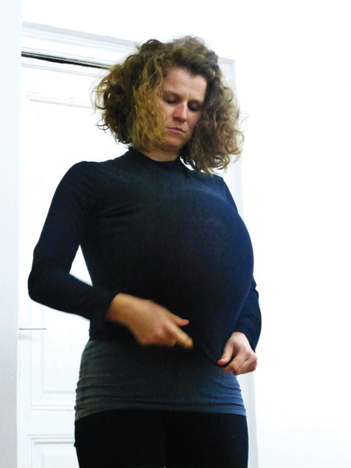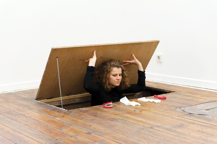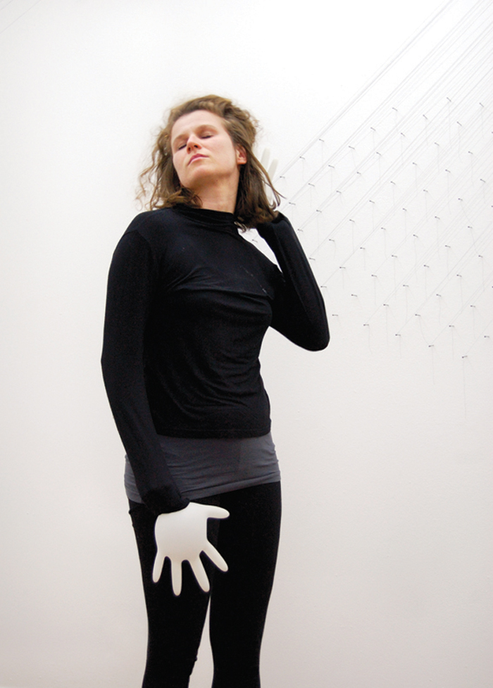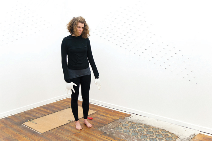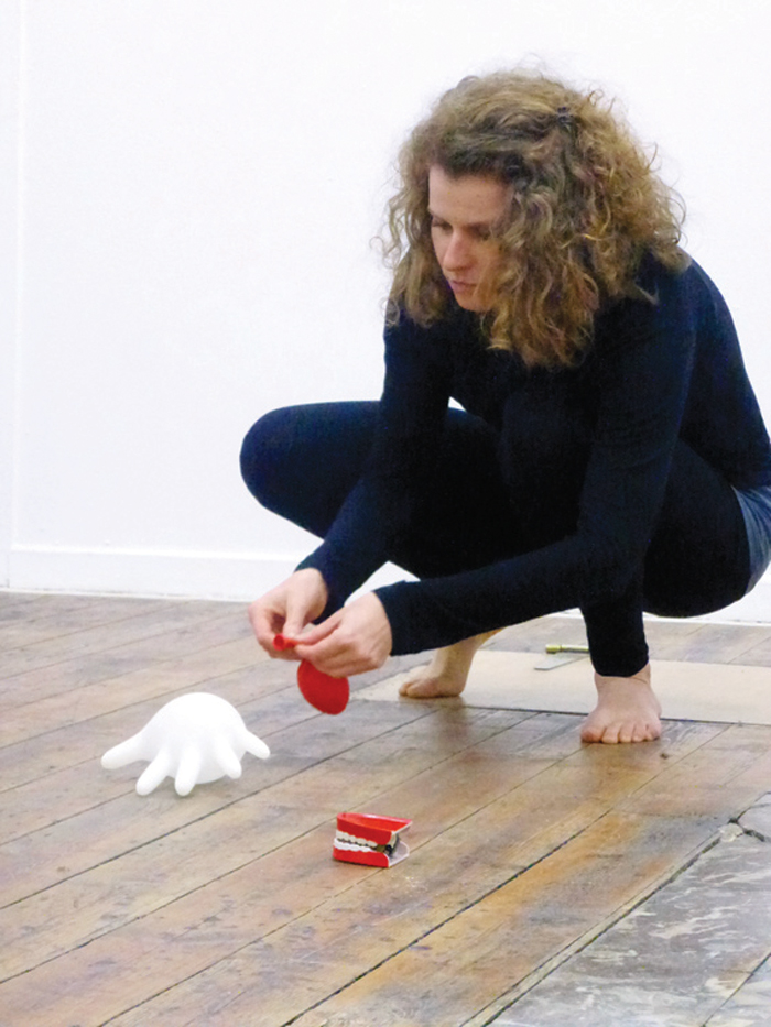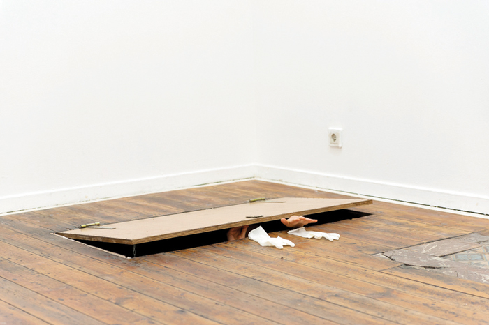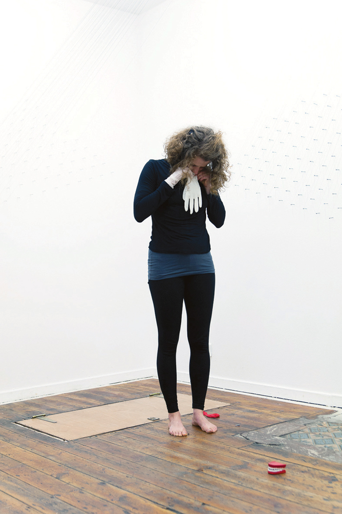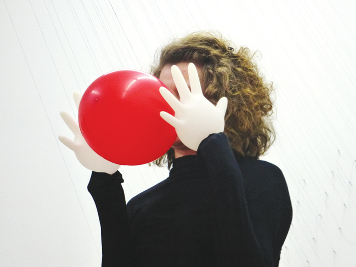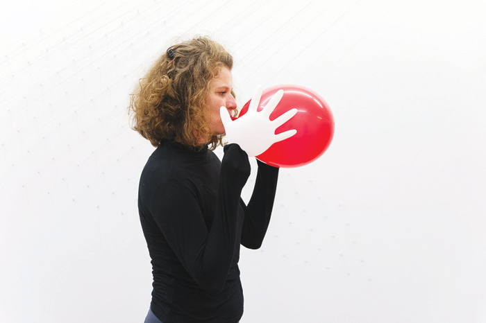 From the cellar the gallery I put out white plastic-gloves, a red balloon and an artificial set of teeth which I wind up and let clatter. I blow up the gloves and use them as my hands. I try to grab the balloon with my artificial hands and blow it up. The two gloves fall to the floor. Through the air of the balloon I try to let the gloves make a racing duel. The loser-glove got bitten. At the end I blow up a balloon put it under the pullover and run against the wall until it burst.