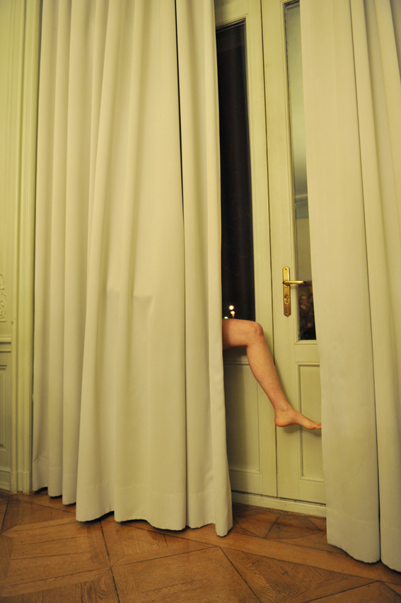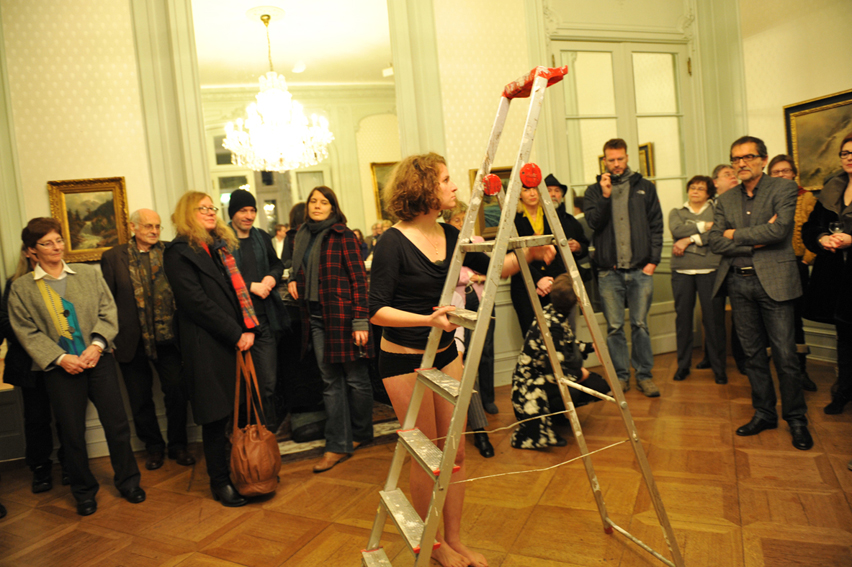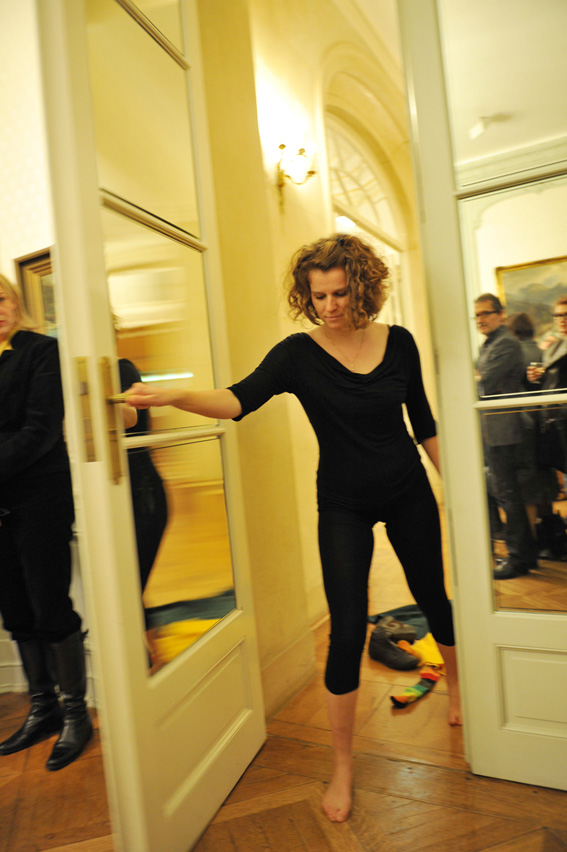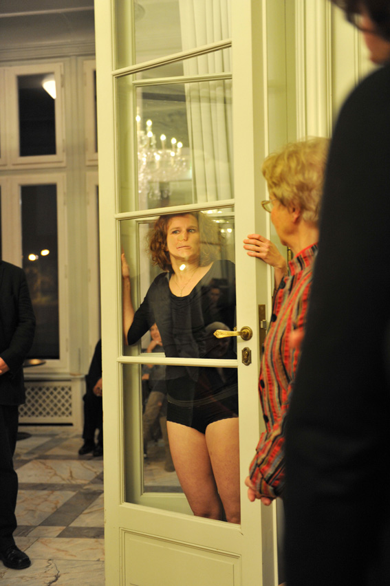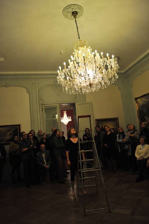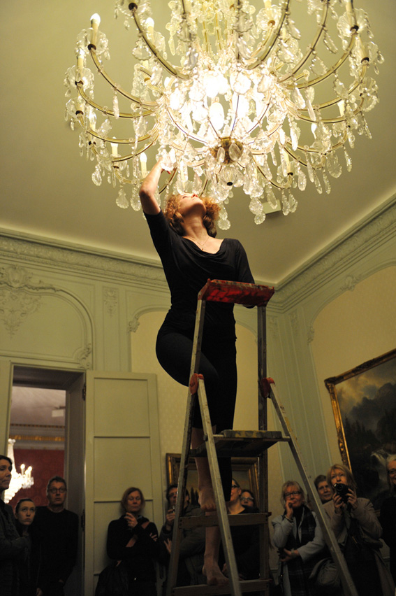 A performance for the finissage of "Salonstuecke Reloaded" in Villa Zanders, Bergisch Gladbach. The green salon used as material. First open one door which is squeeking, trying to squeek rhythmically. The mirrored door reflects the space. Using the ladder of the house to walk from outside into the space. Climb up to the chandelier, jingle with the glass and rocking the changelier that squeeks. Jumping up to the big mirror over the ex-fireplace and breath upon the mirror. Afterwards opening and closing the curtains of the space. Walking through the people to the door opposite of the big mirror and rubbing the face on the glass. With spit squeaking on the window. Afterwards walking again with the ladder, climbing up and knock over the door.