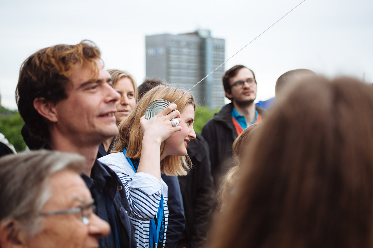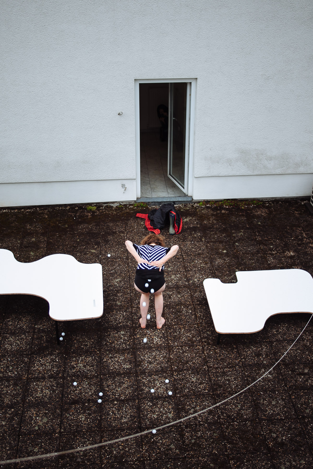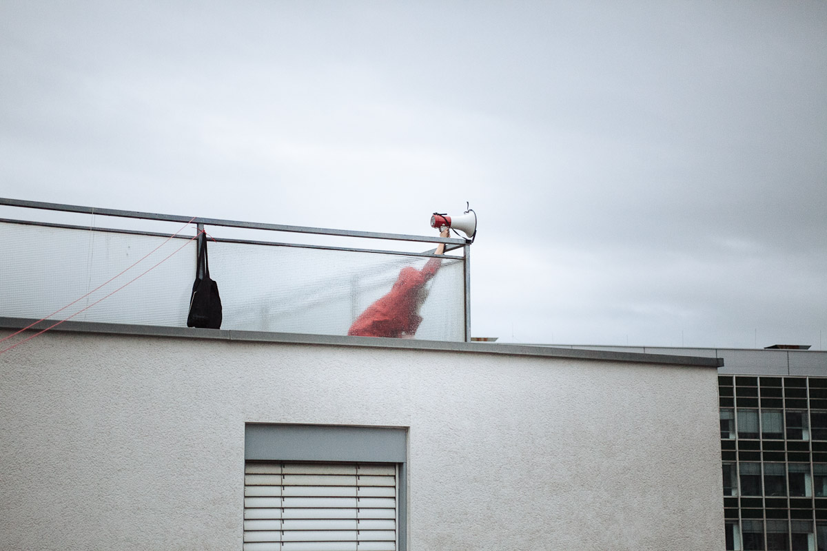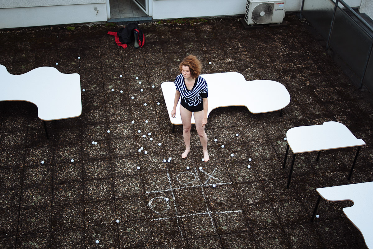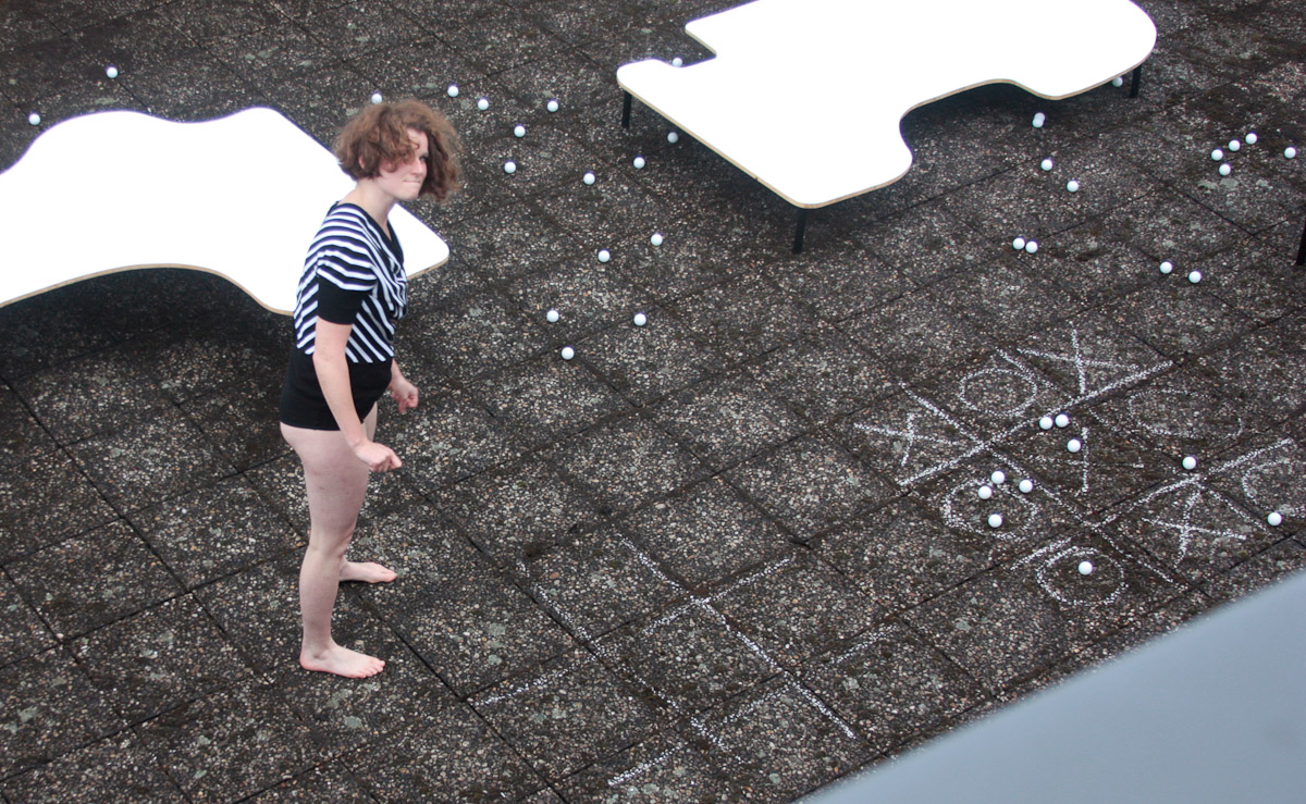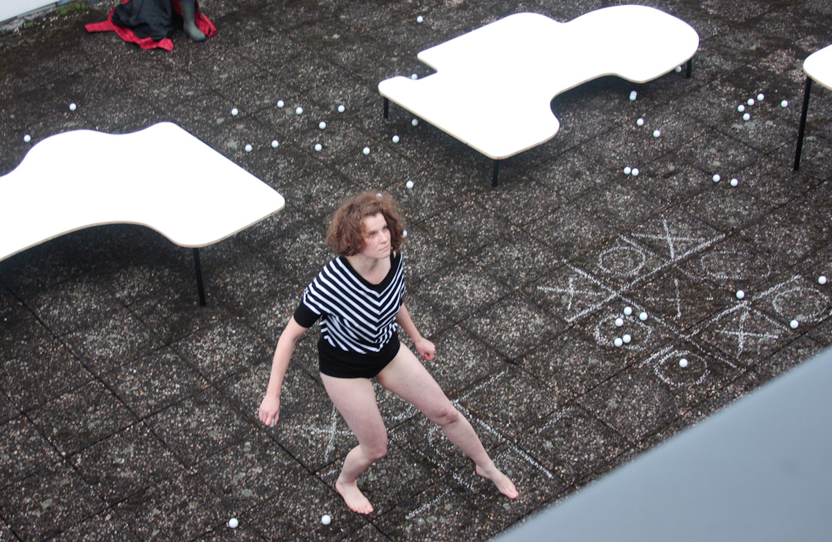 Performance on the opposite building. Communication through a tin can string telephone which does not work over the distance. Playing Tic Tac Toe with the audience using table tennis balls.