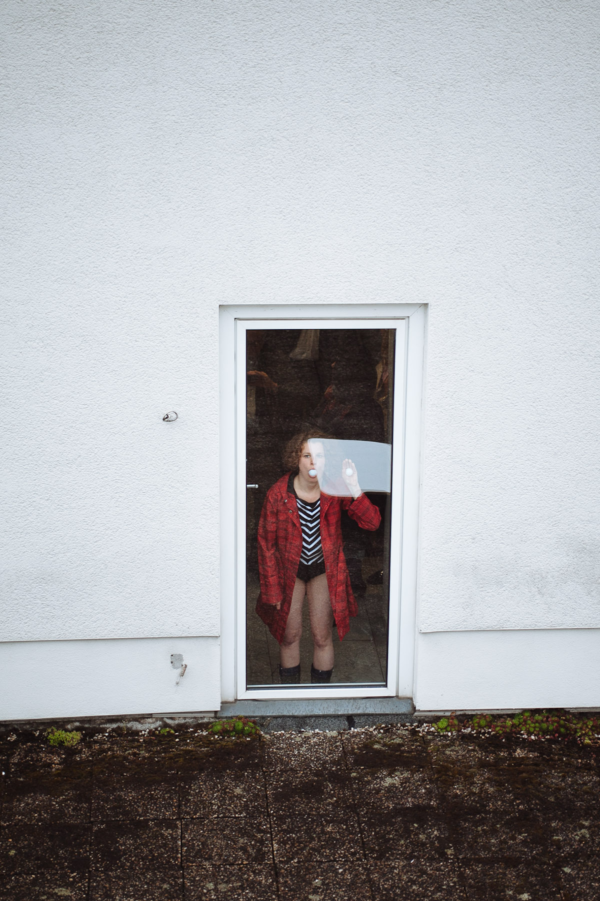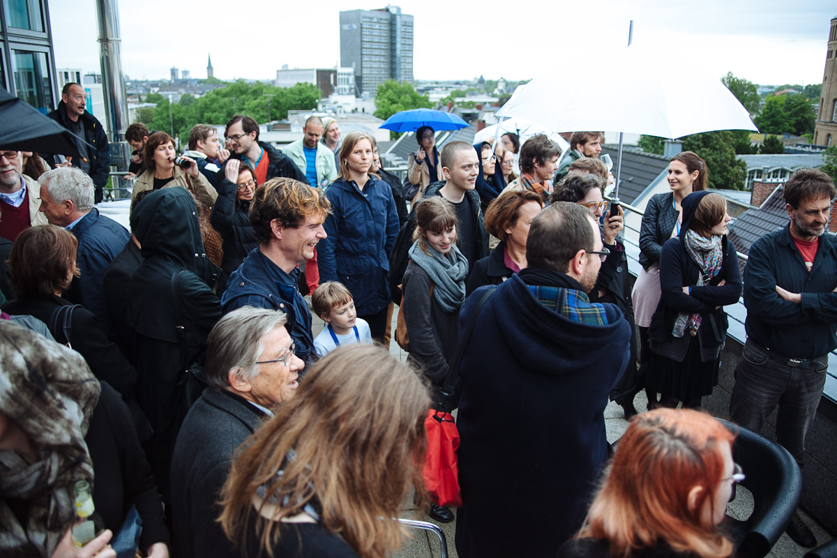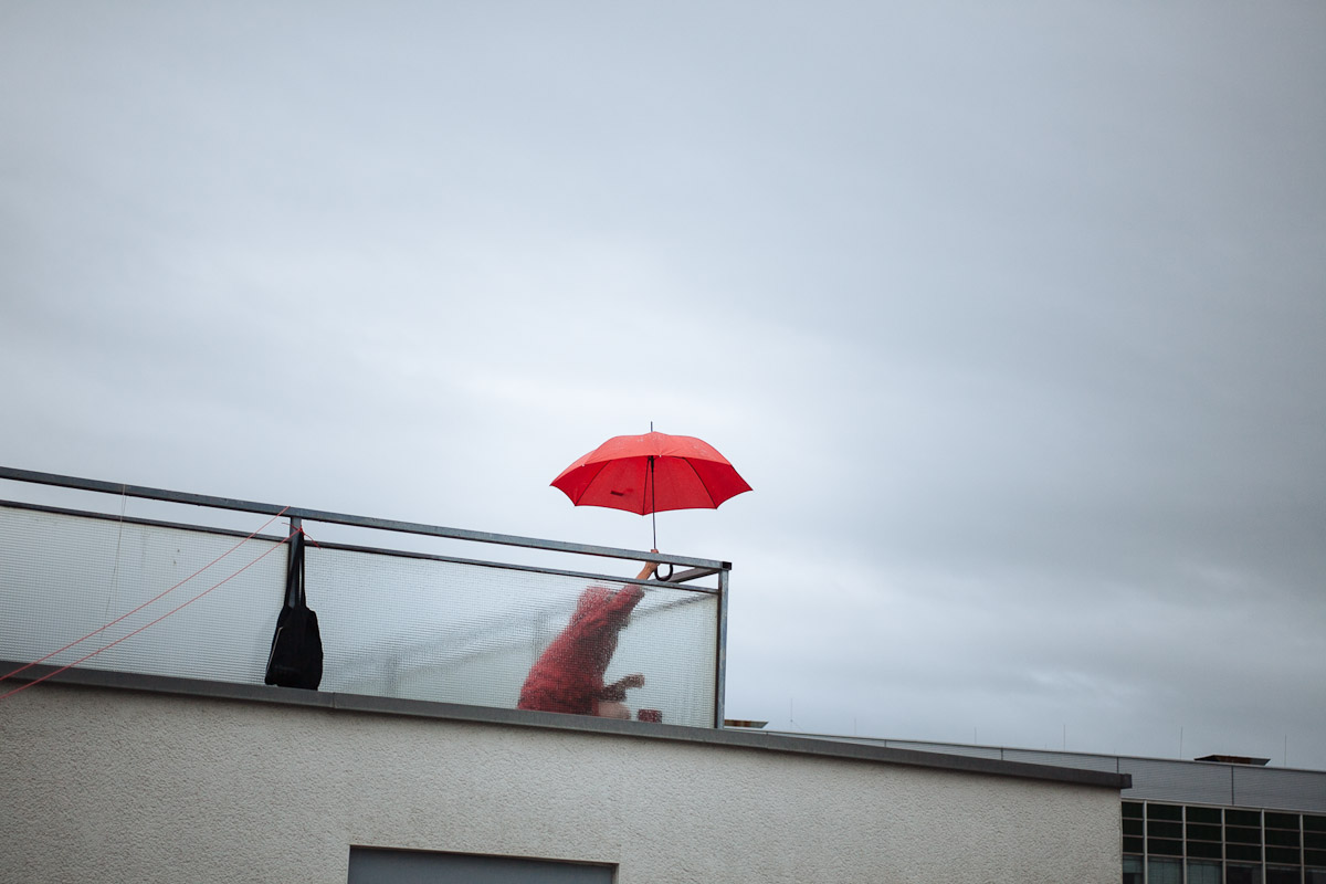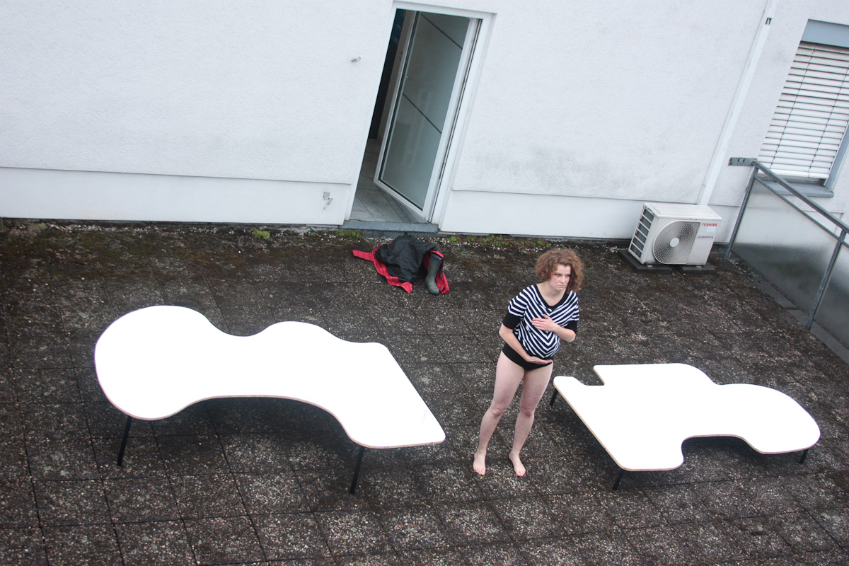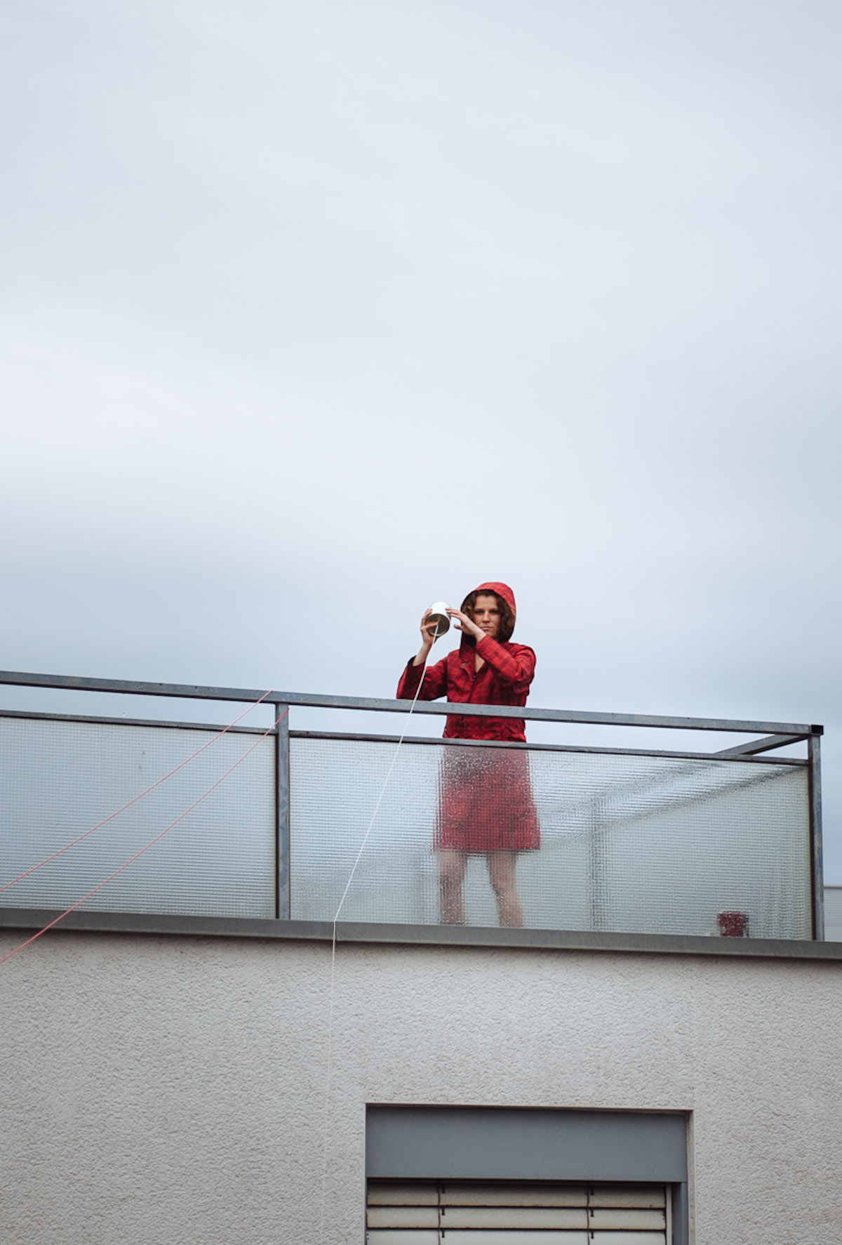 Performance on the opposite building. Communication through a tin can string telephone which does not work over the distance. Playing Tic Tac Toe with the audience using table tennis balls.