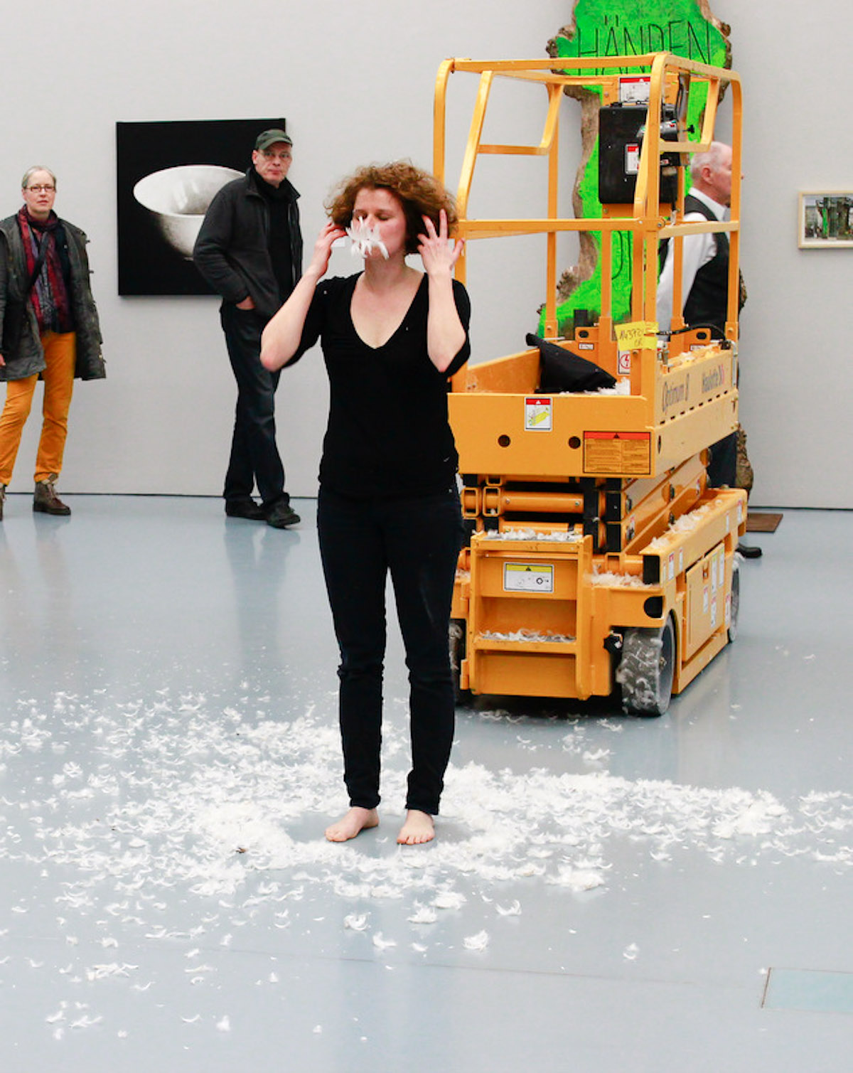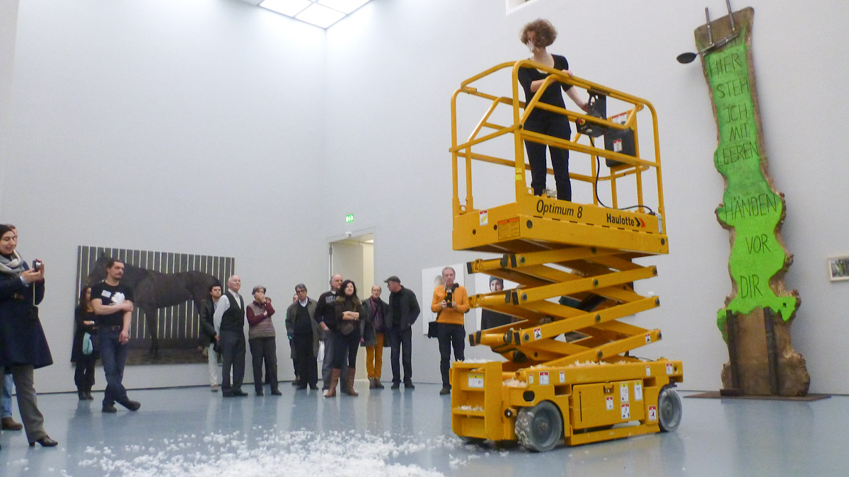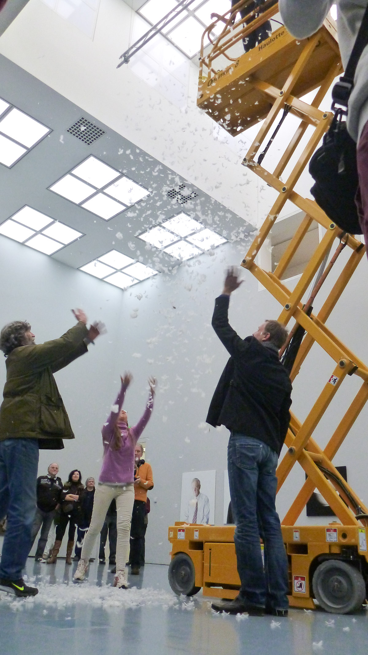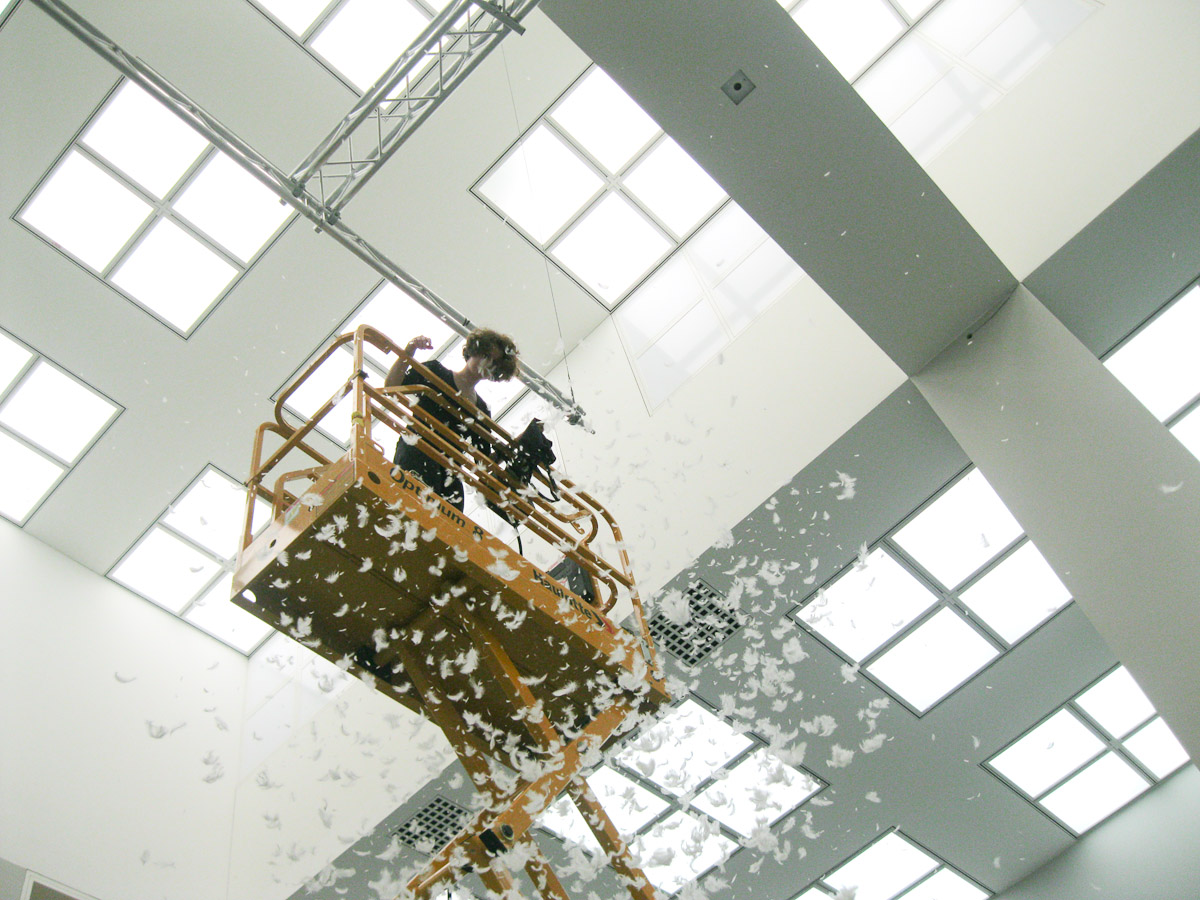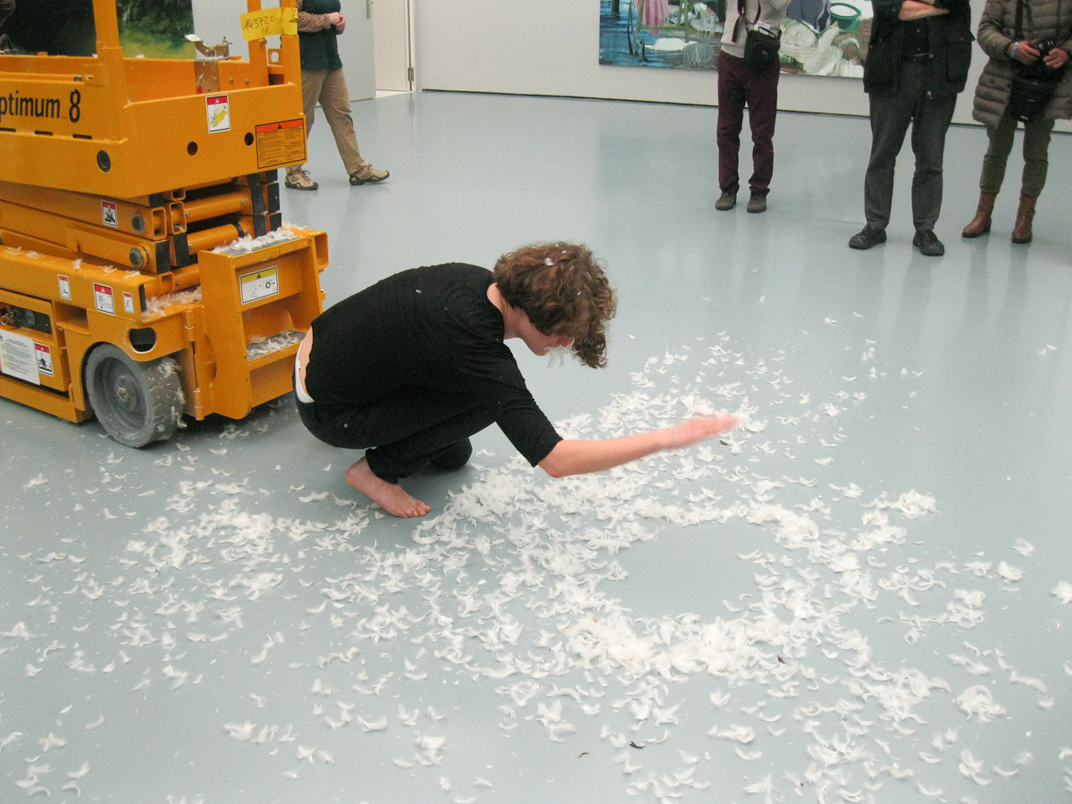 DIE GROSSE Kunstausstellung NRW 2014 Museum Kunstpalast Düsseldorf Working with Haulotte, the moving lifting ramp of the museum and feathers.