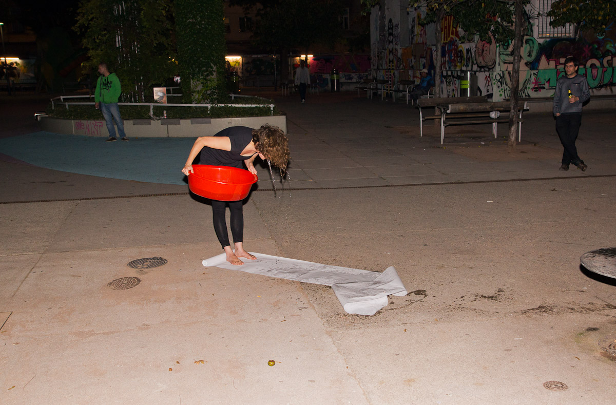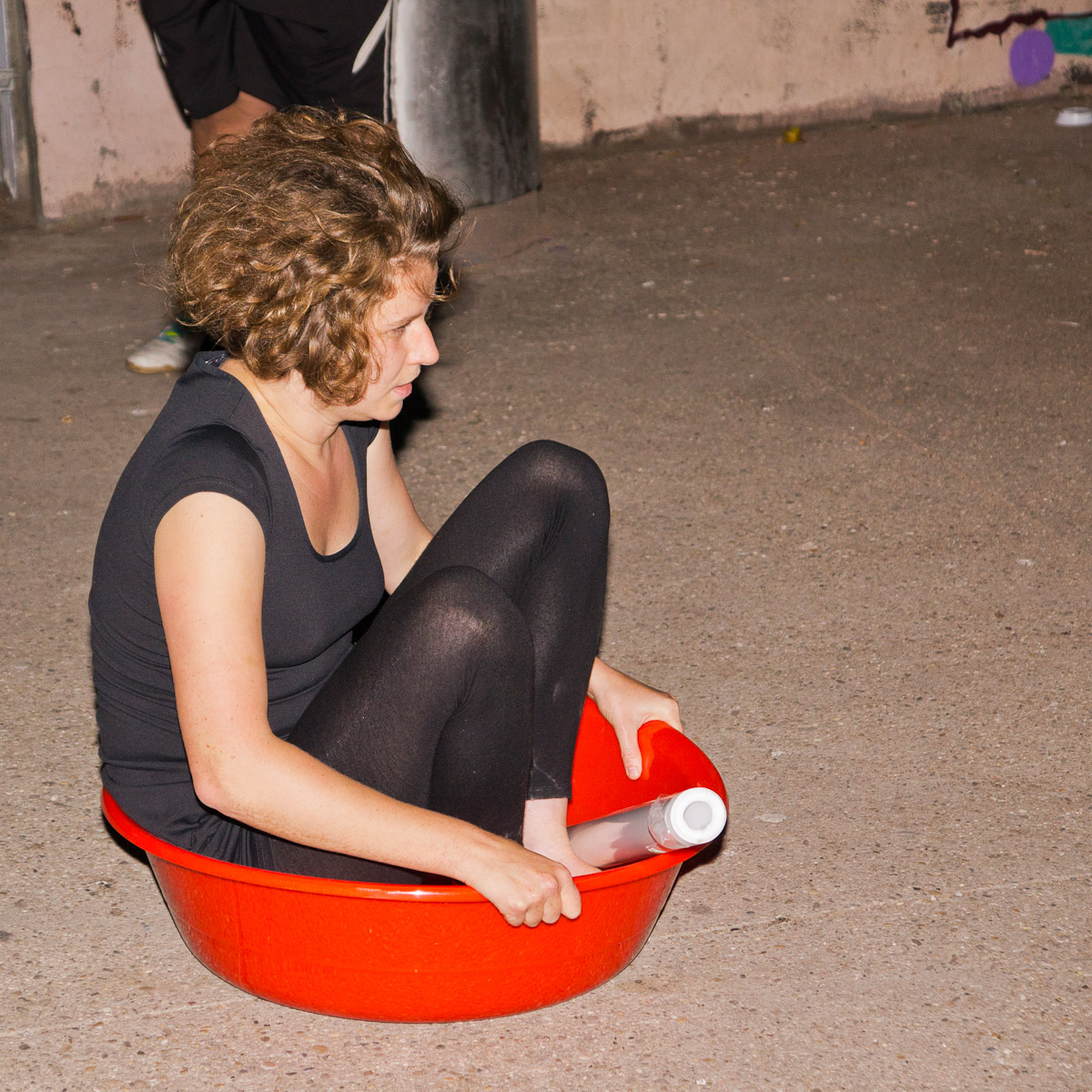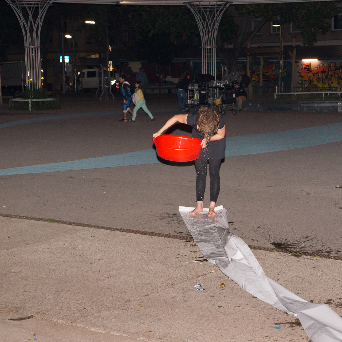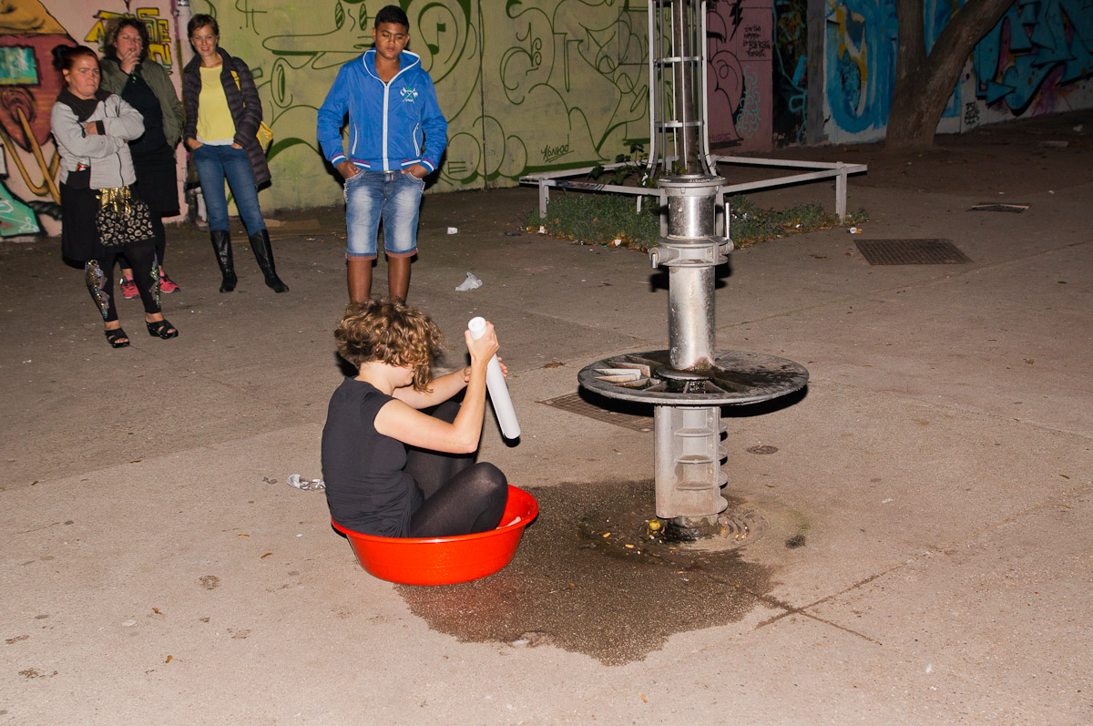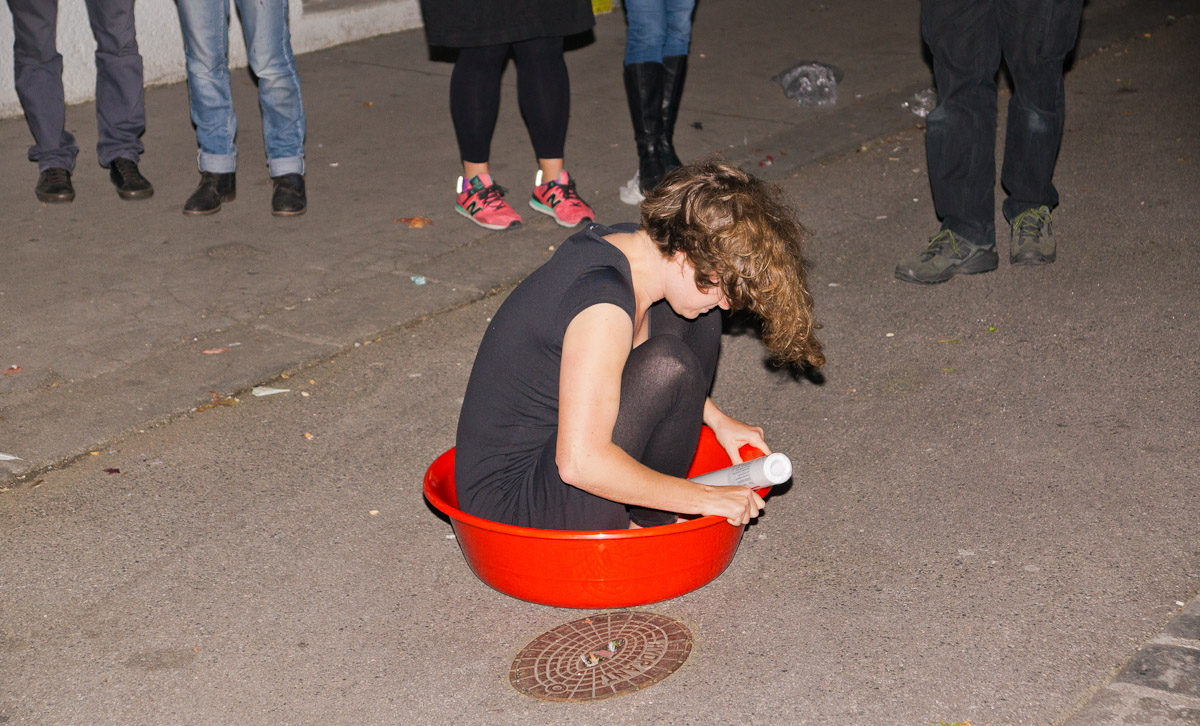 Opening performance of the exhibition Tolle-e-Wut, garde-á-vous? with a plastic bucket which moves me.