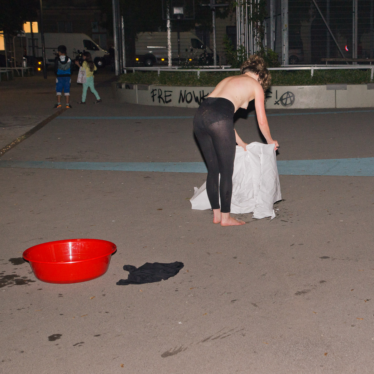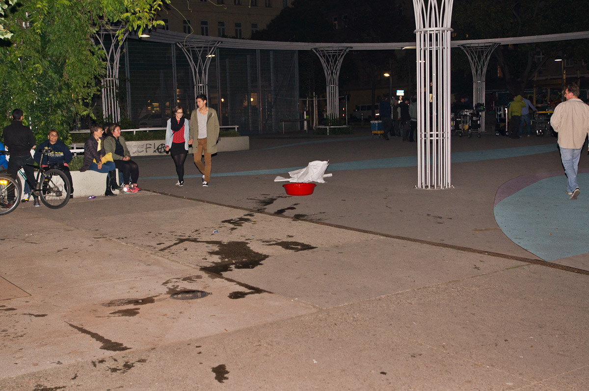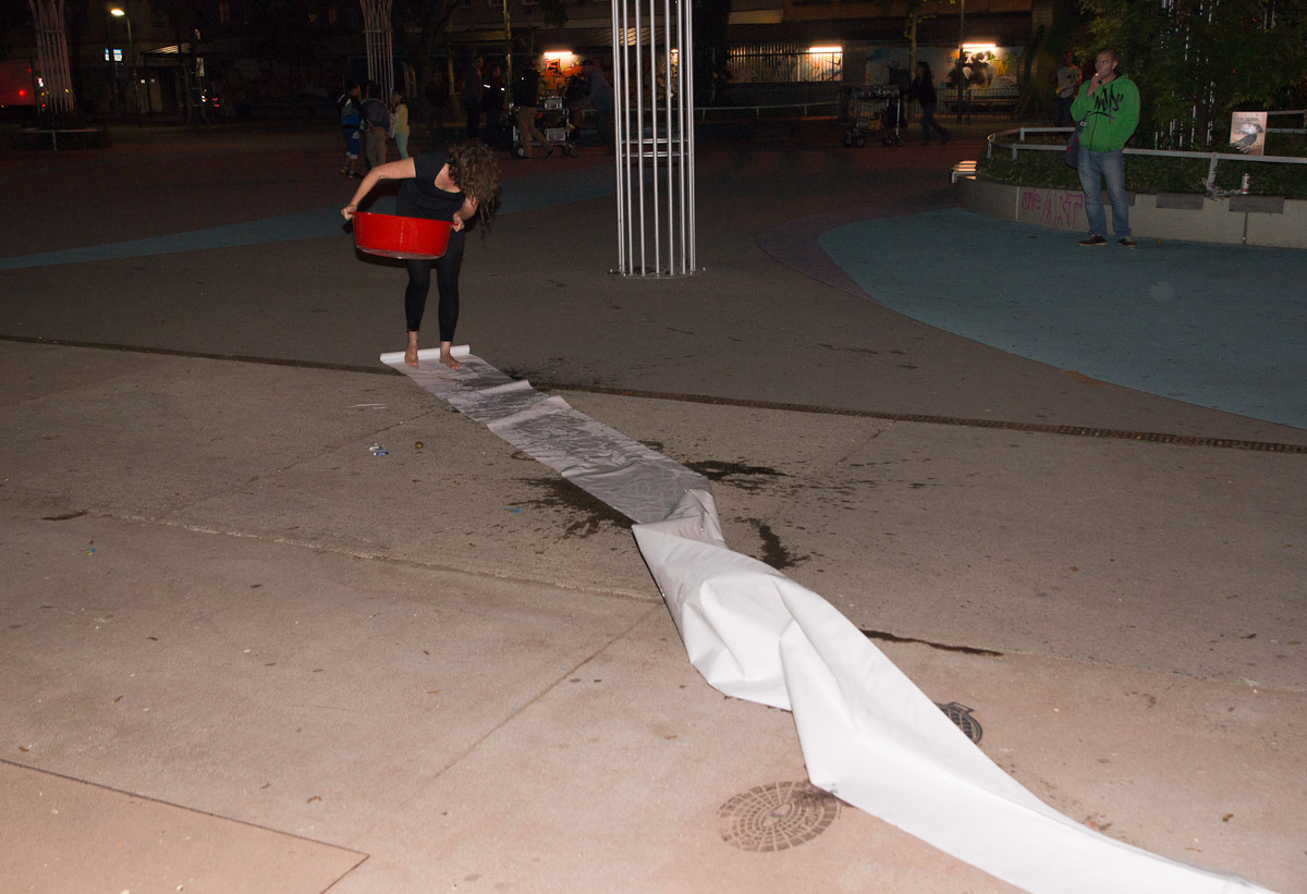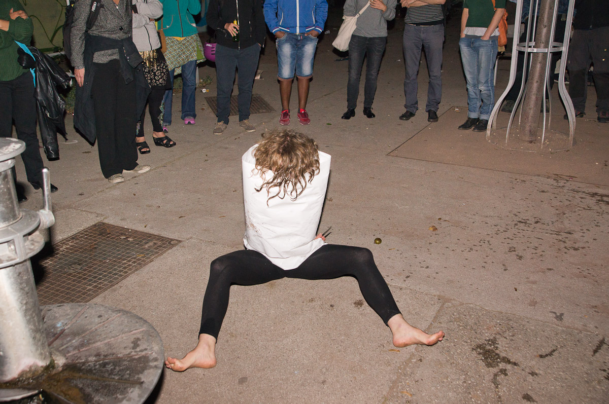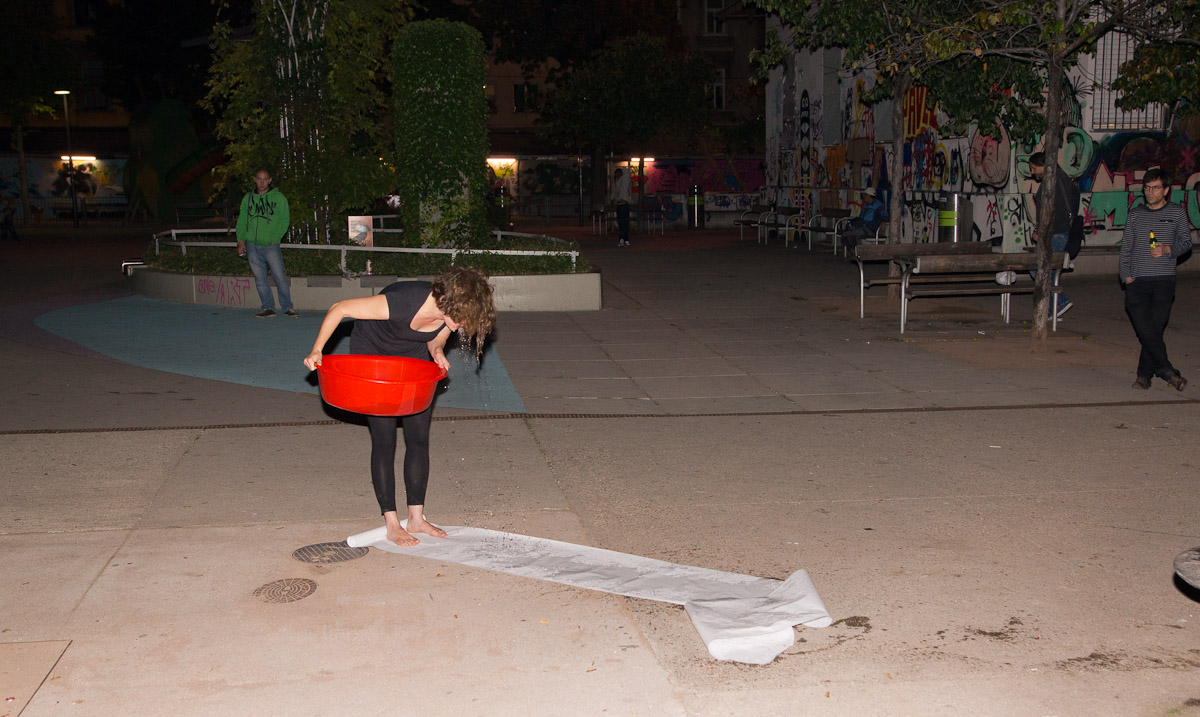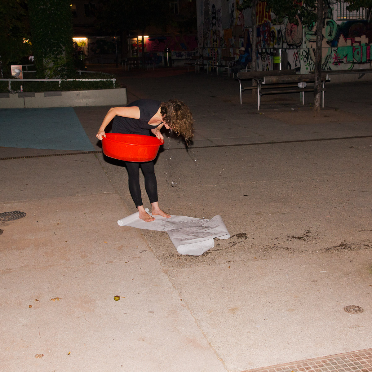Opening performance of the exhibition Tolle-e-Wut, garde-á-vous? with a plastic bucket which moves me.