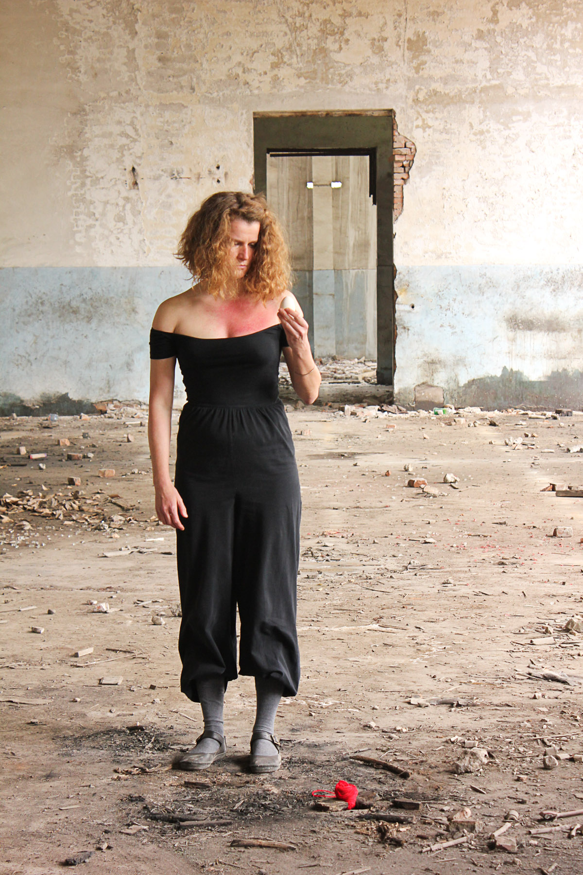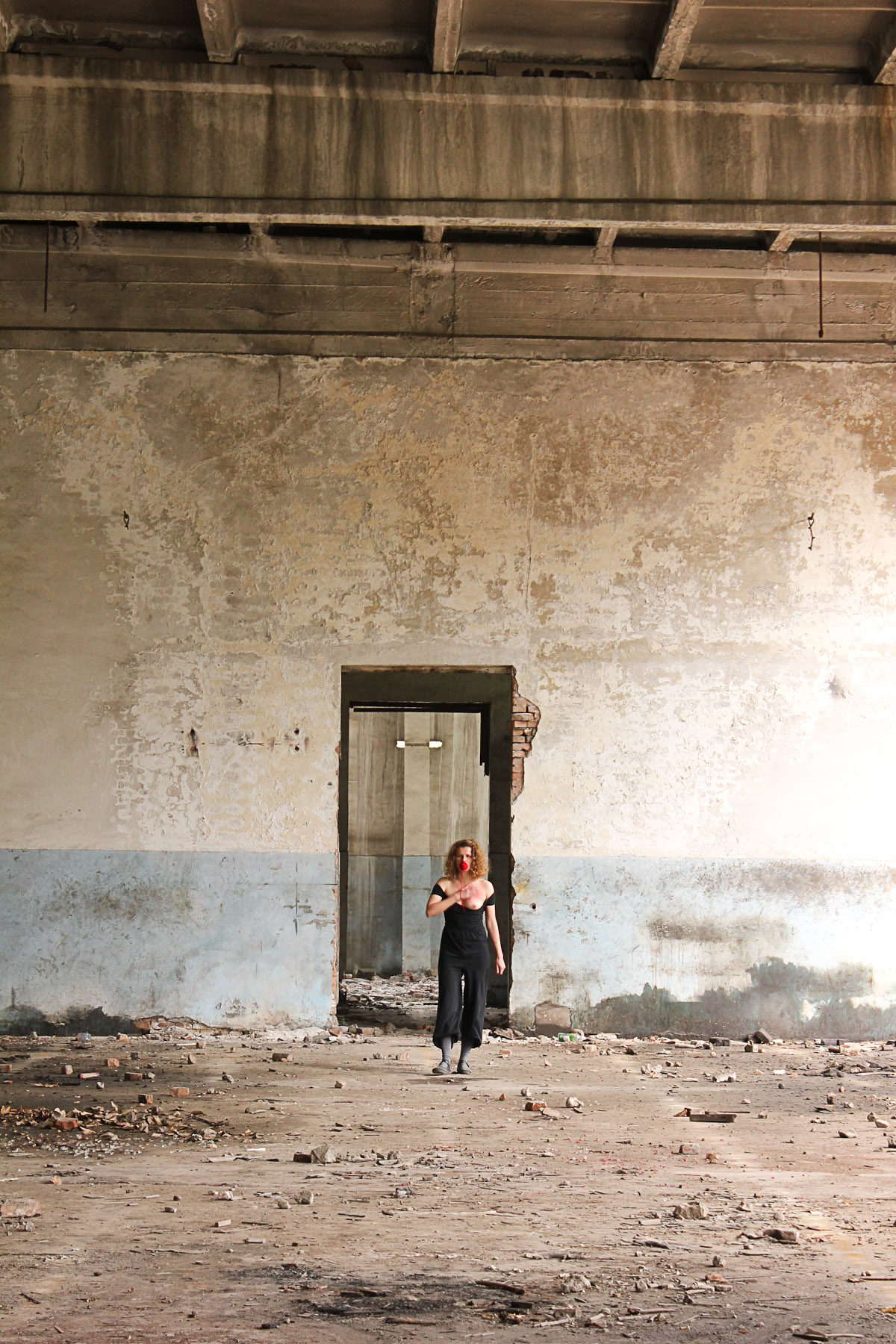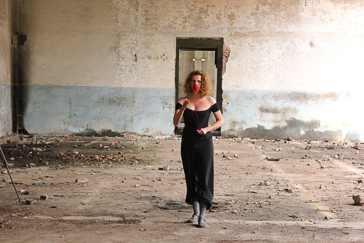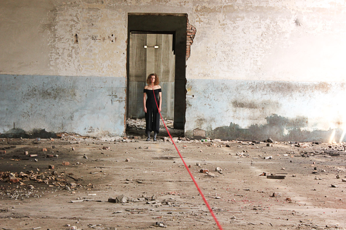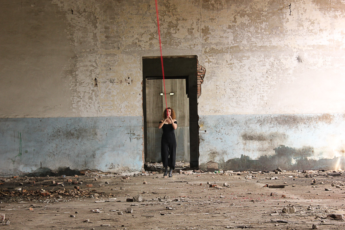 Red thread spanned through the old factory space. Rolling it tight around my tongue until the thread ends. Beat with my right hand my left breast, walking backwards.