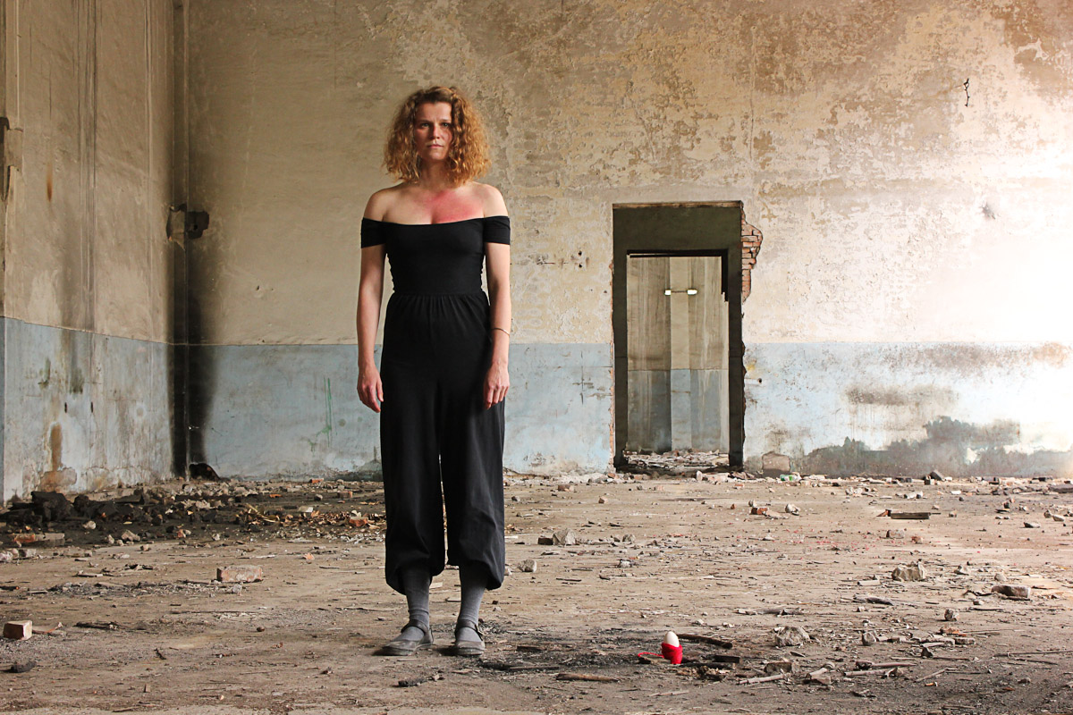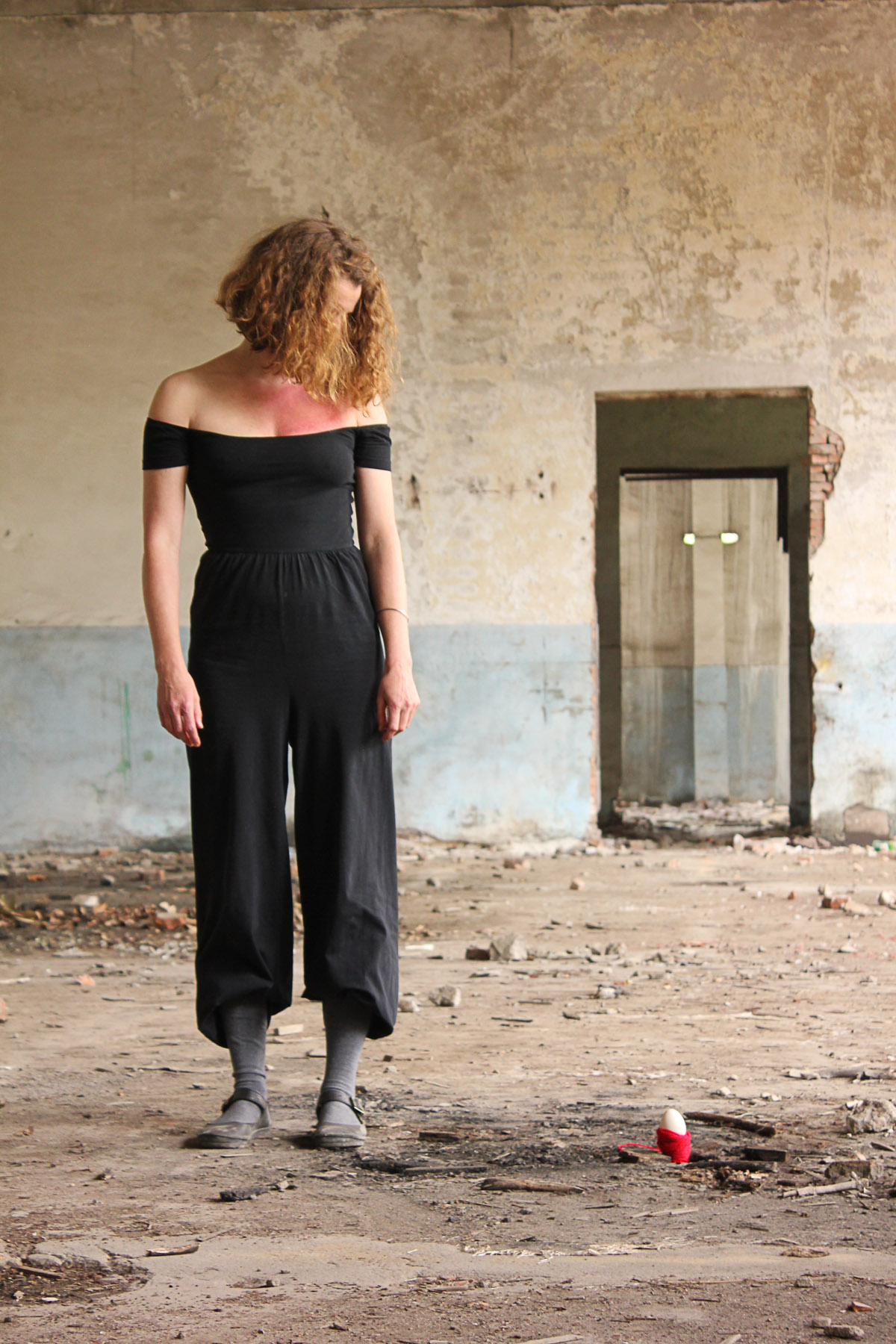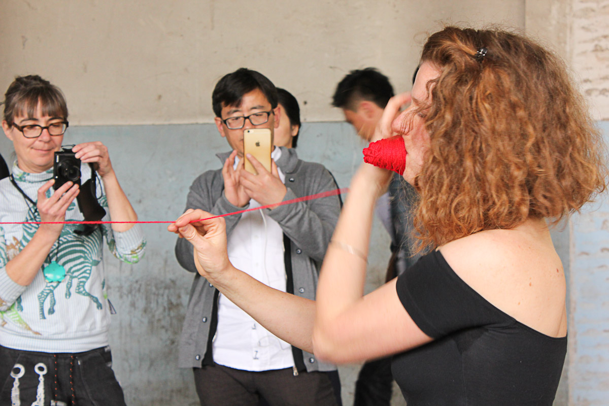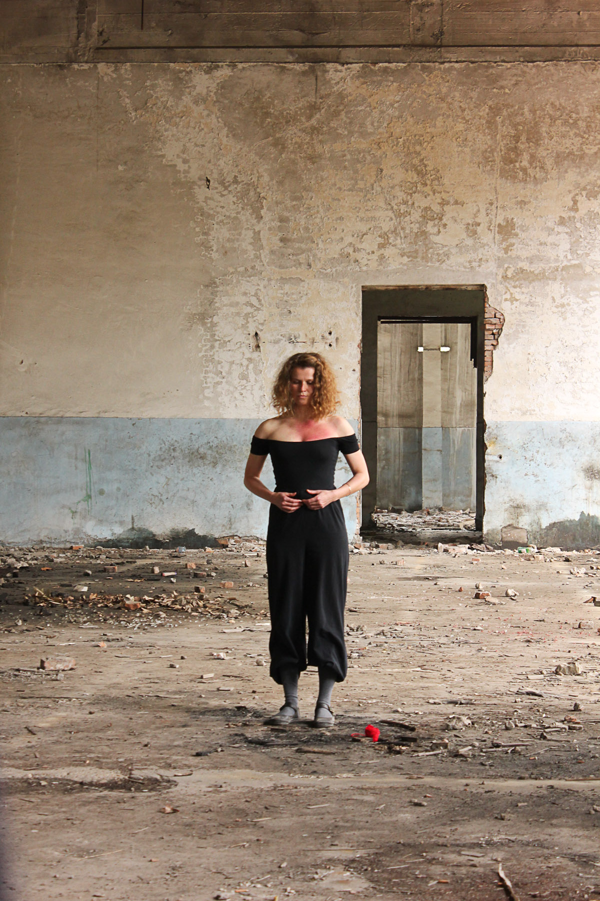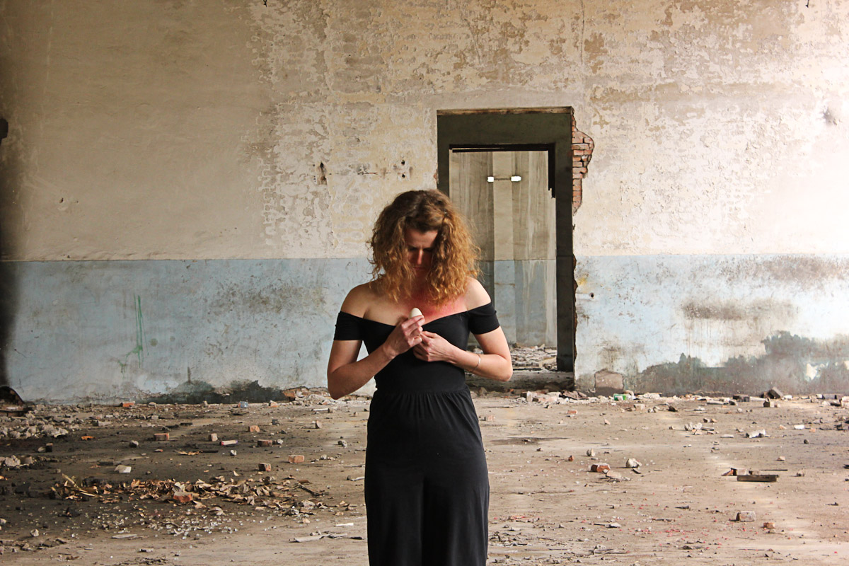 Red thread spanned through the old factory space. Rolling it tight around my tongue until the thread ends. Beat with my right hand my left breast, walking backwards.