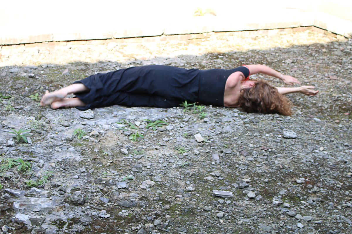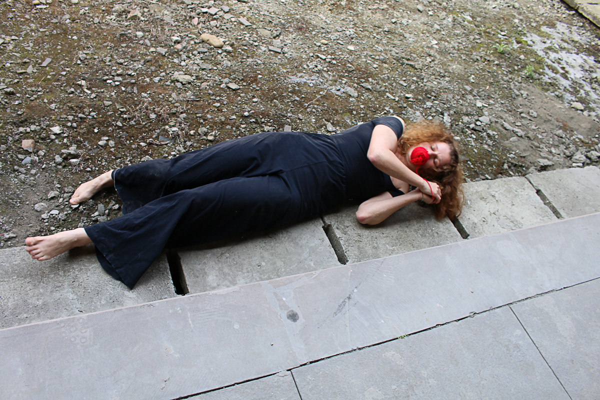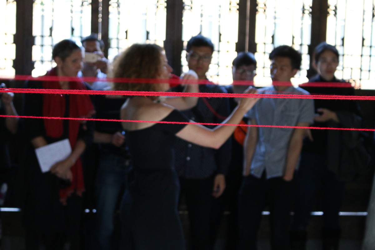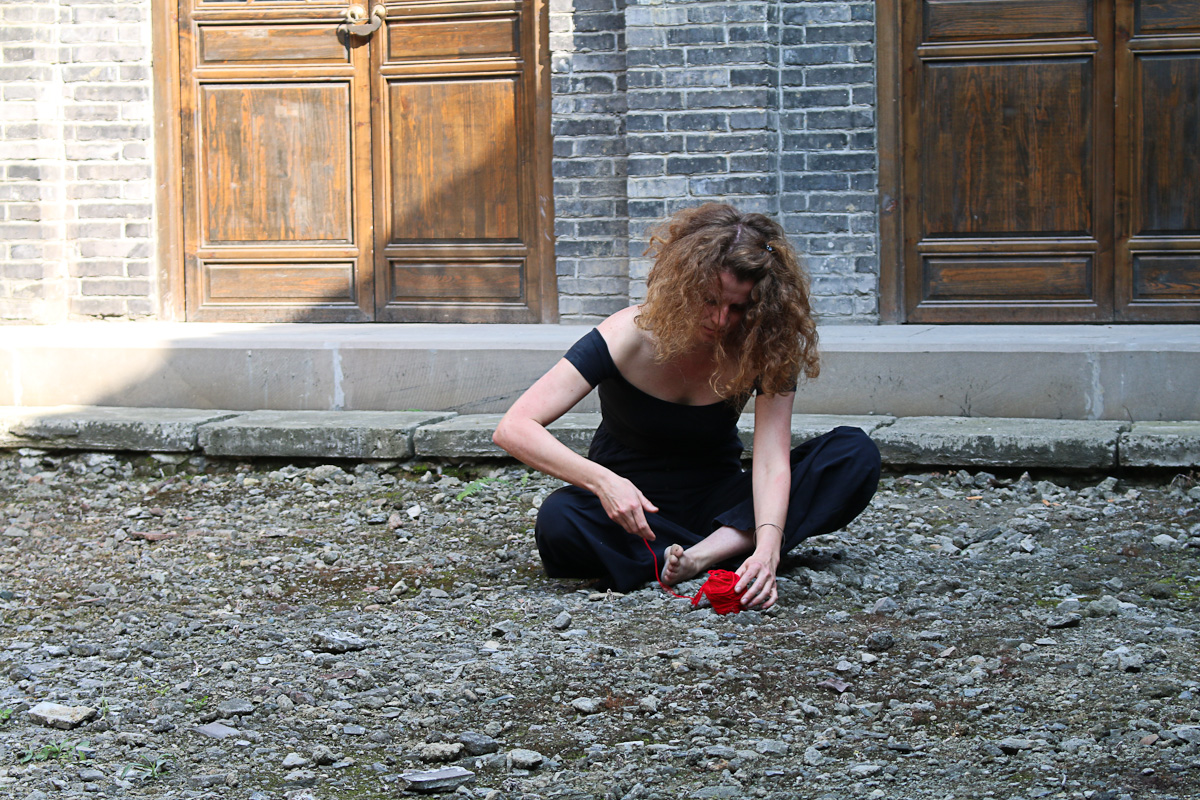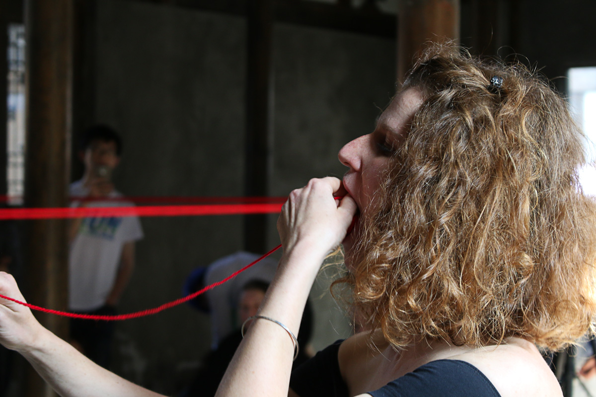 Unrolling the Red thread in an in between space. Rolling it tight around my tongue until the thread ends. Play with the squeeking doors. Roll myself in the courtyard back and forth.