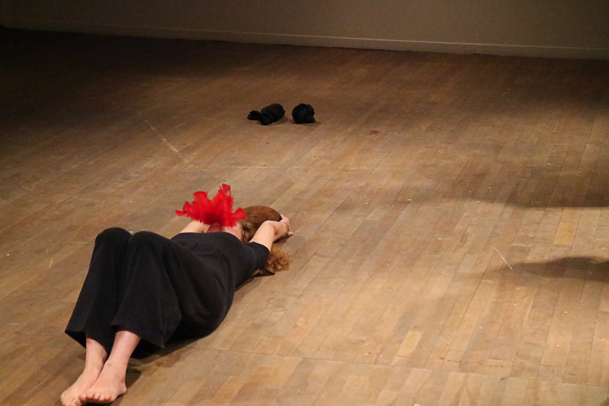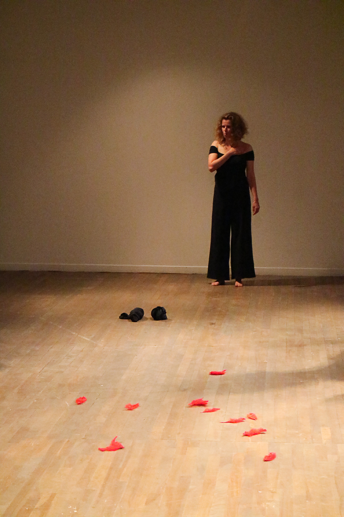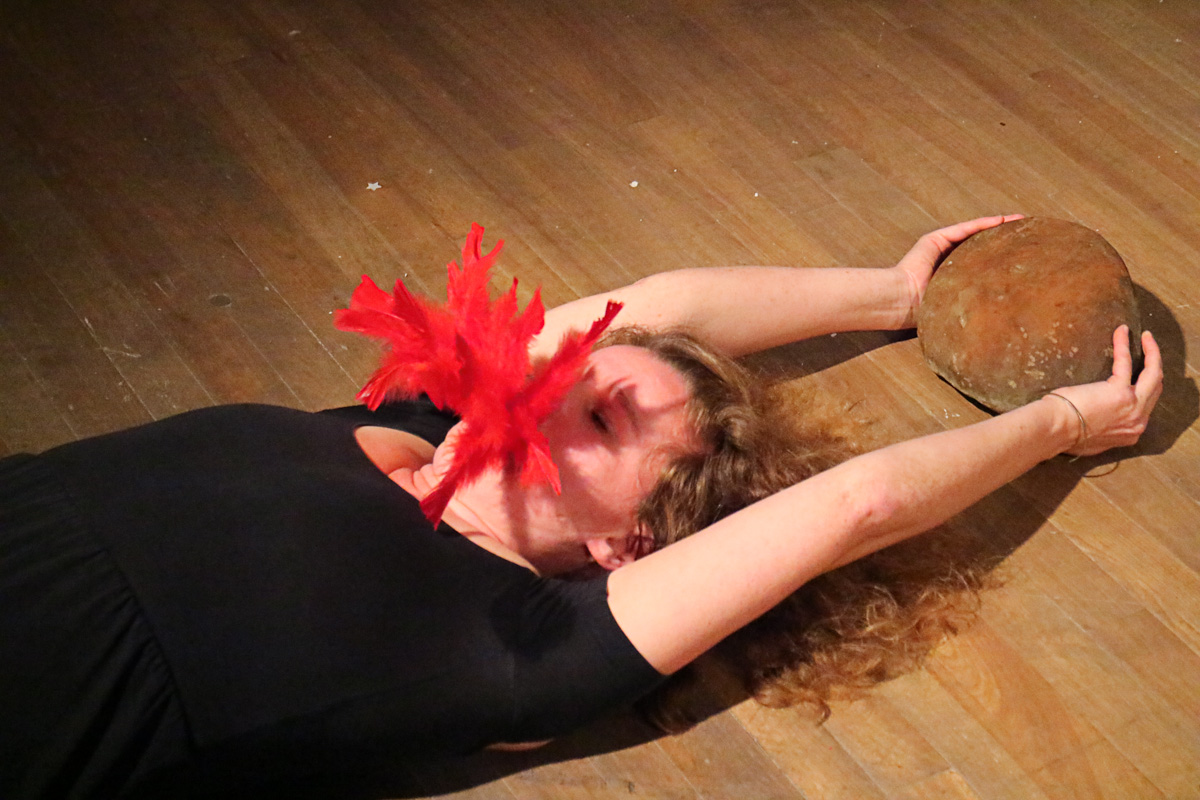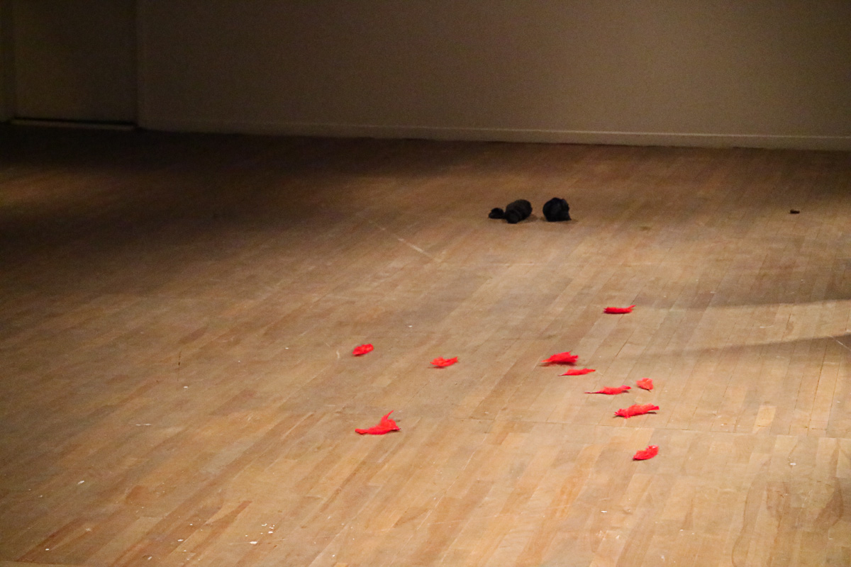 Materials which I used: A found big stone with which I crawled. Red feathers in my mouth which I lose and out of my mouth comes a black small tongue shaped stone.