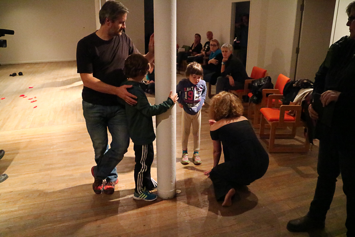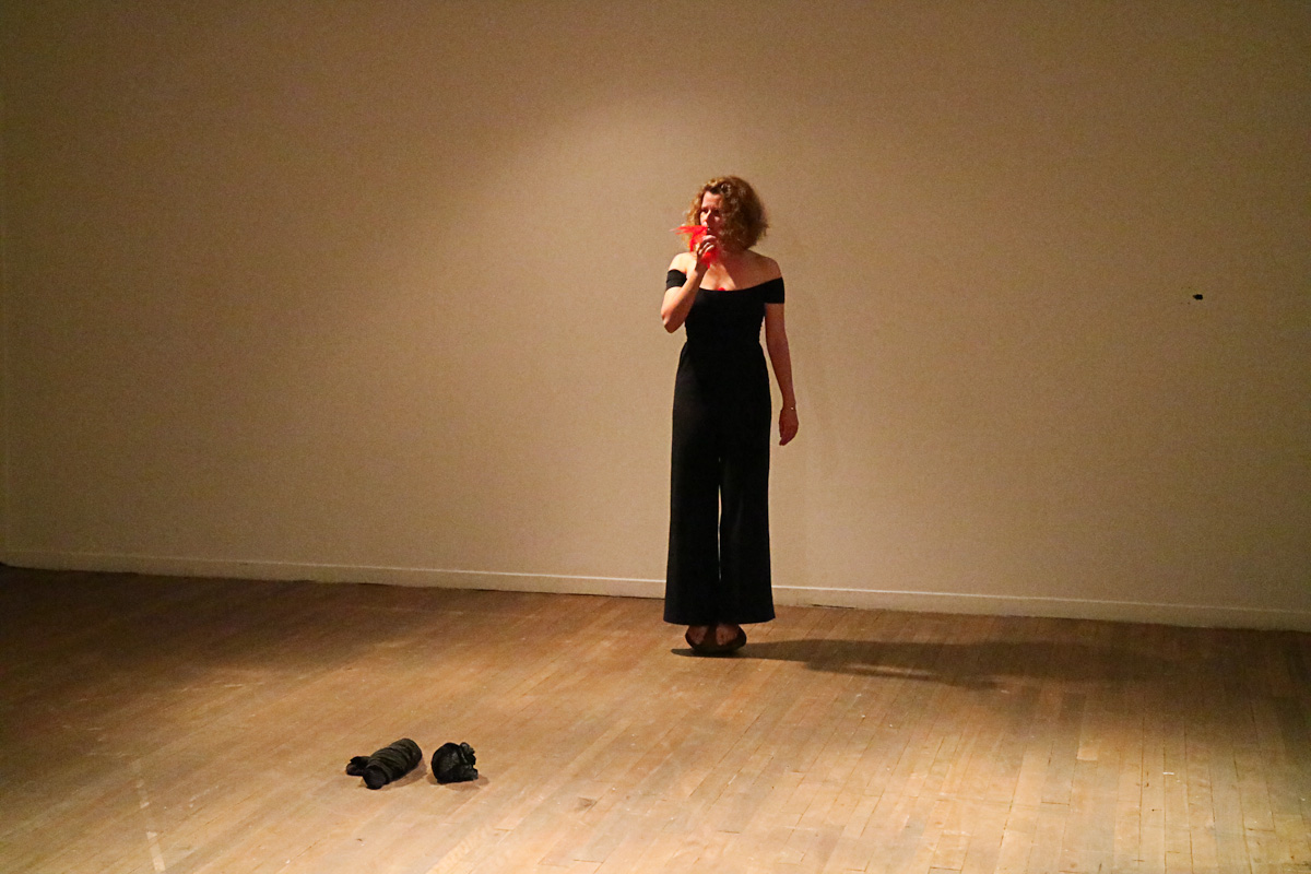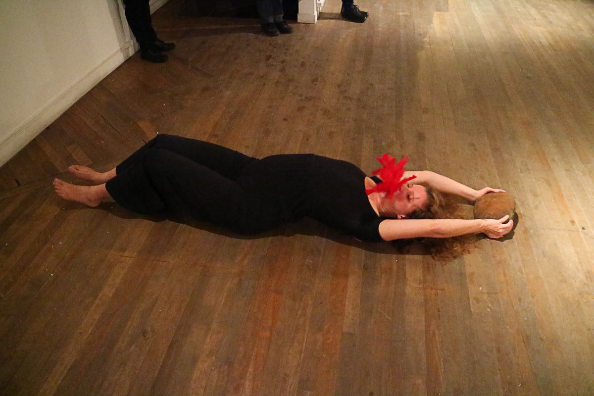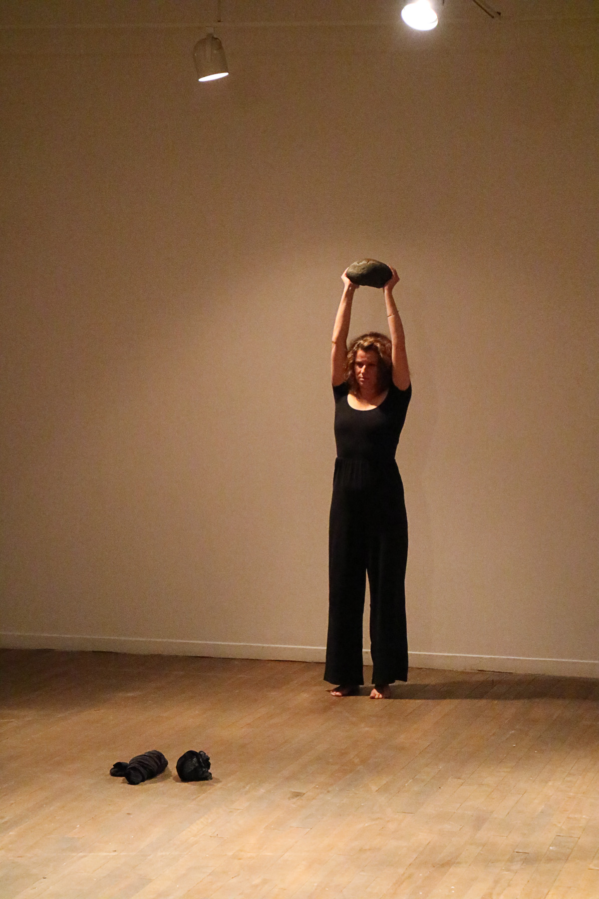 Materials which I used: A found big stone with which I crawled. Red feathers in my mouth which I lose and out of my mouth comes a black small tongue shaped stone.