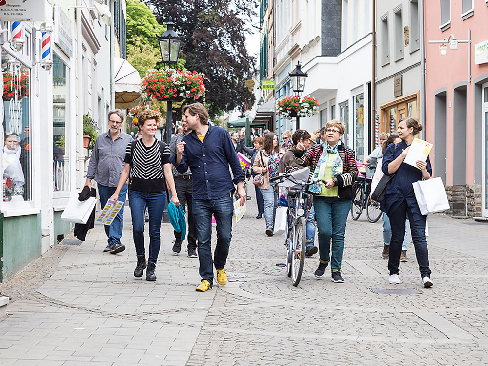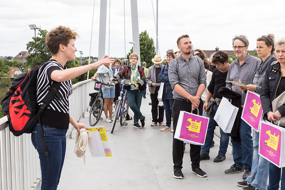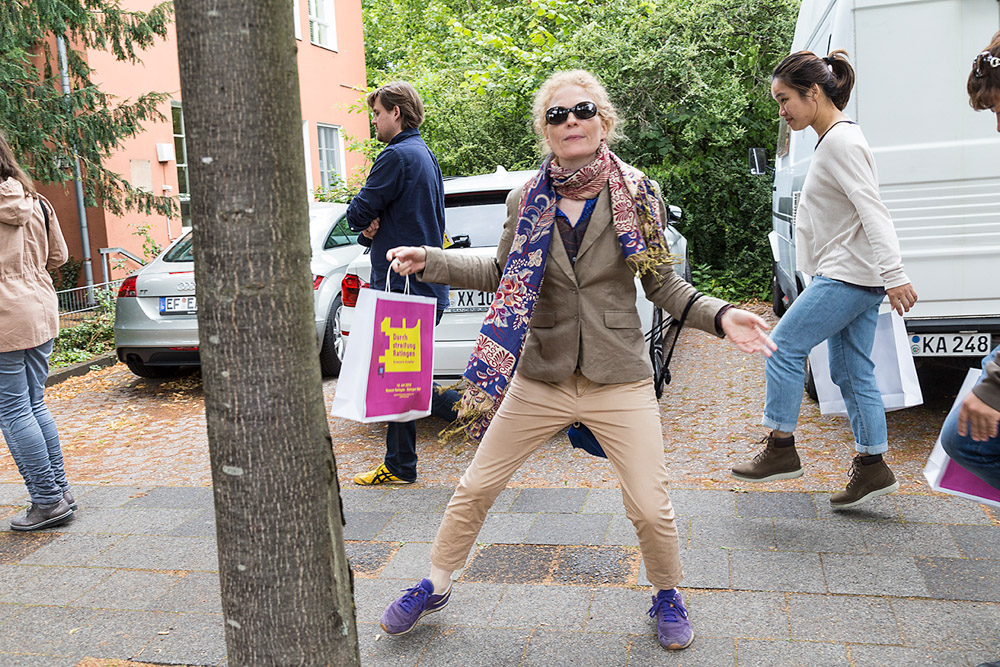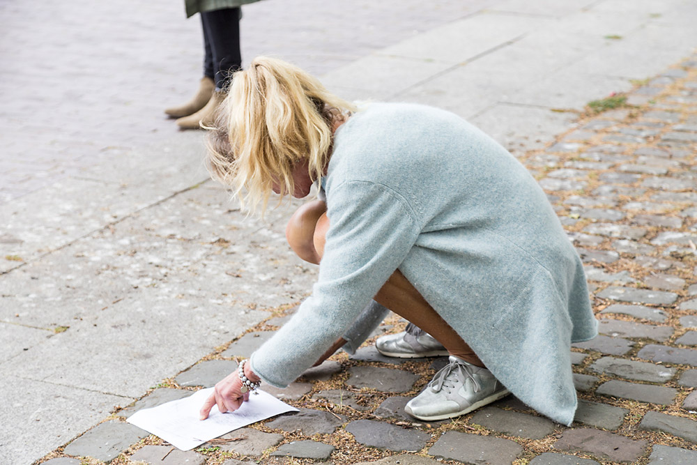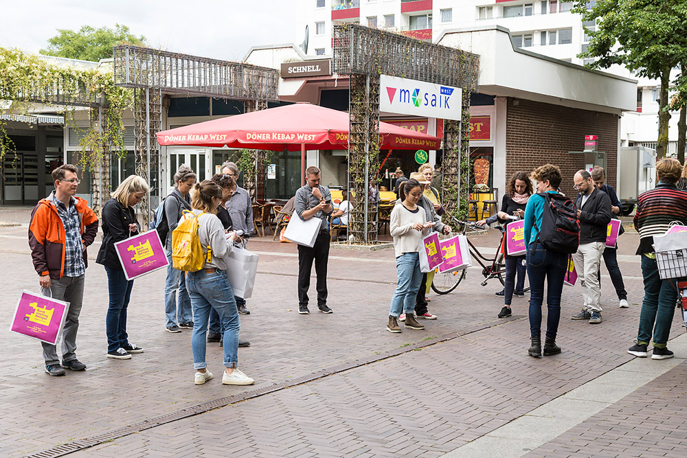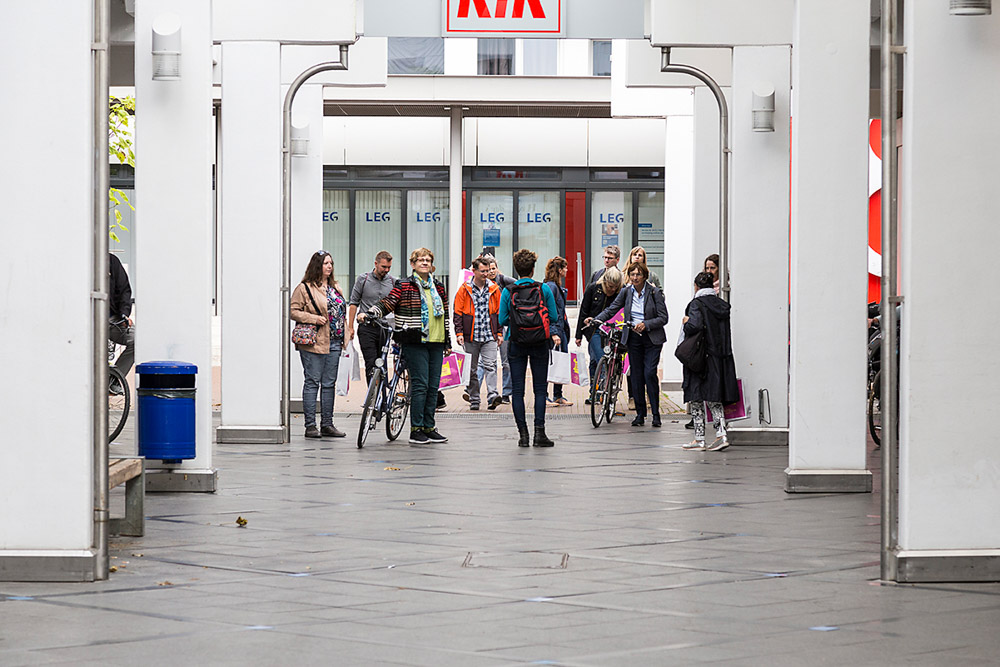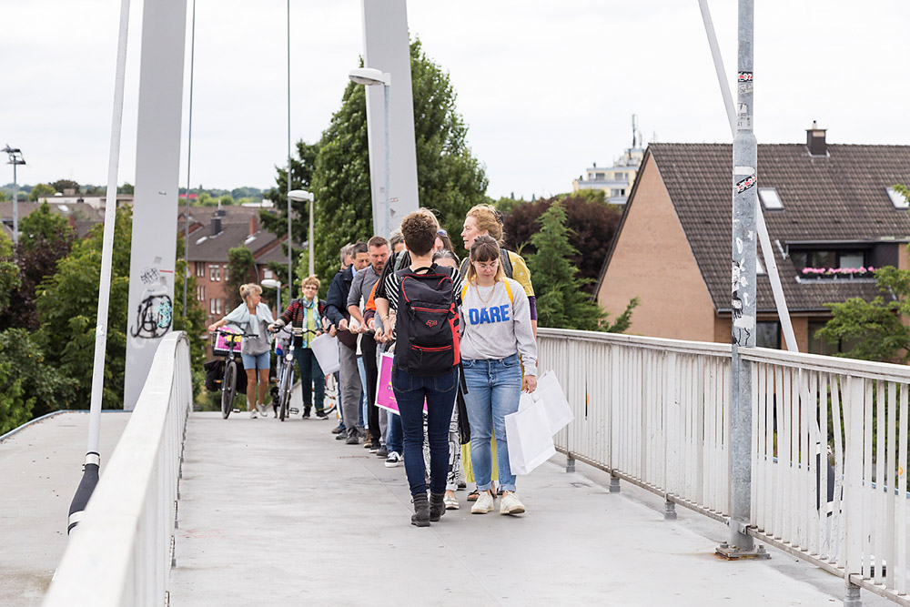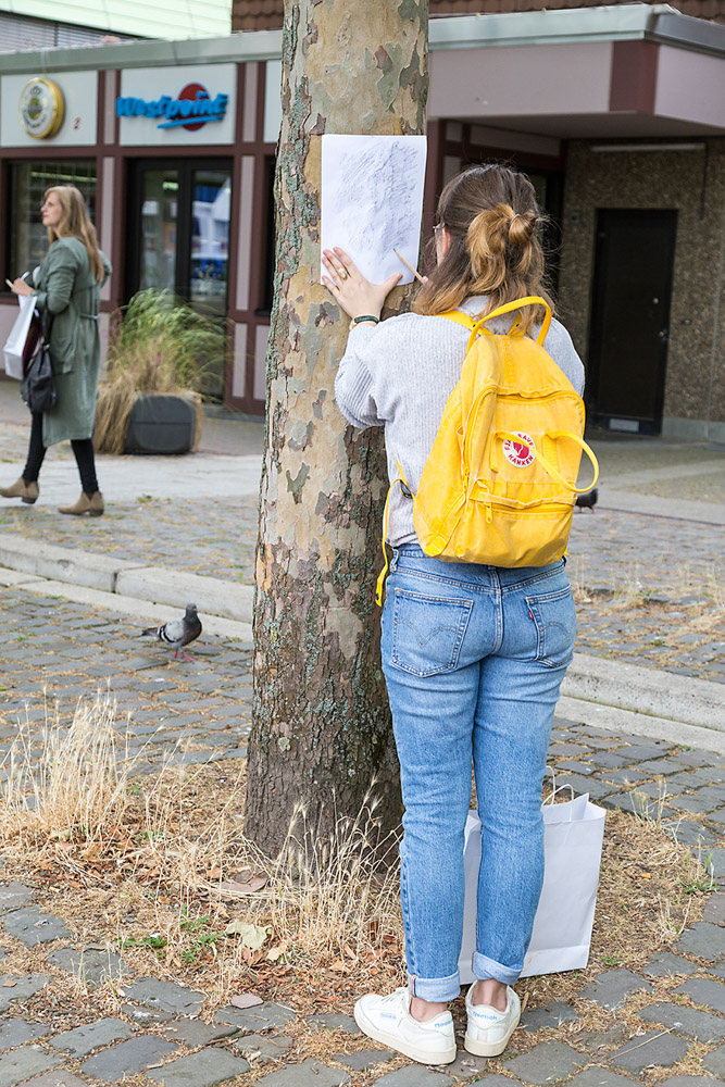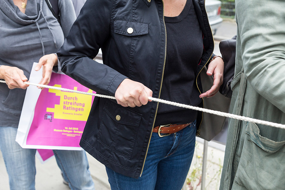 »Durchstreifung Ratingen« – als Fremde dringt die Künstlerin Evamaria Schaller in den Kosmos der Innenstadt ein und verbindet diese mit Ratingen-West durch ein Erlebnis des gemeinsamen Erkundens. Zusammen erforschen wir (Un-)Bekanntes in der ei- genen Stadt. Wir werden zu performativen Akteuren in einem Alltags-Stück, das sich jeden Tag in immer unterschiedlichen Facetten abspielt, uns daher weiter begleitet und mit einer Erfahrung bereichert, die wir an andere weitergeben können.
