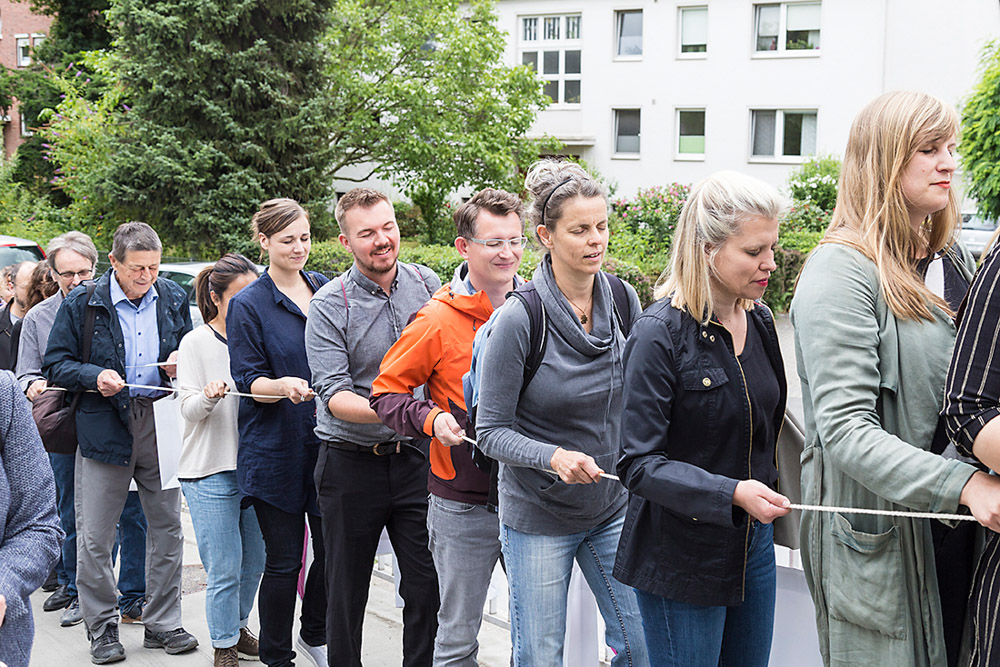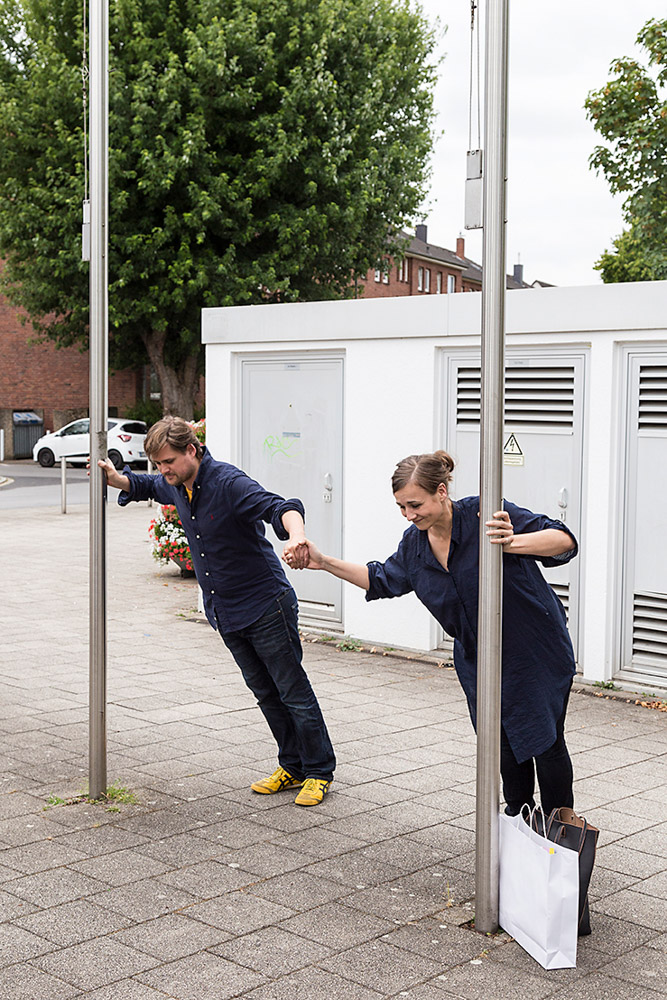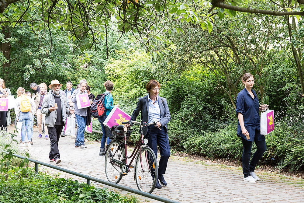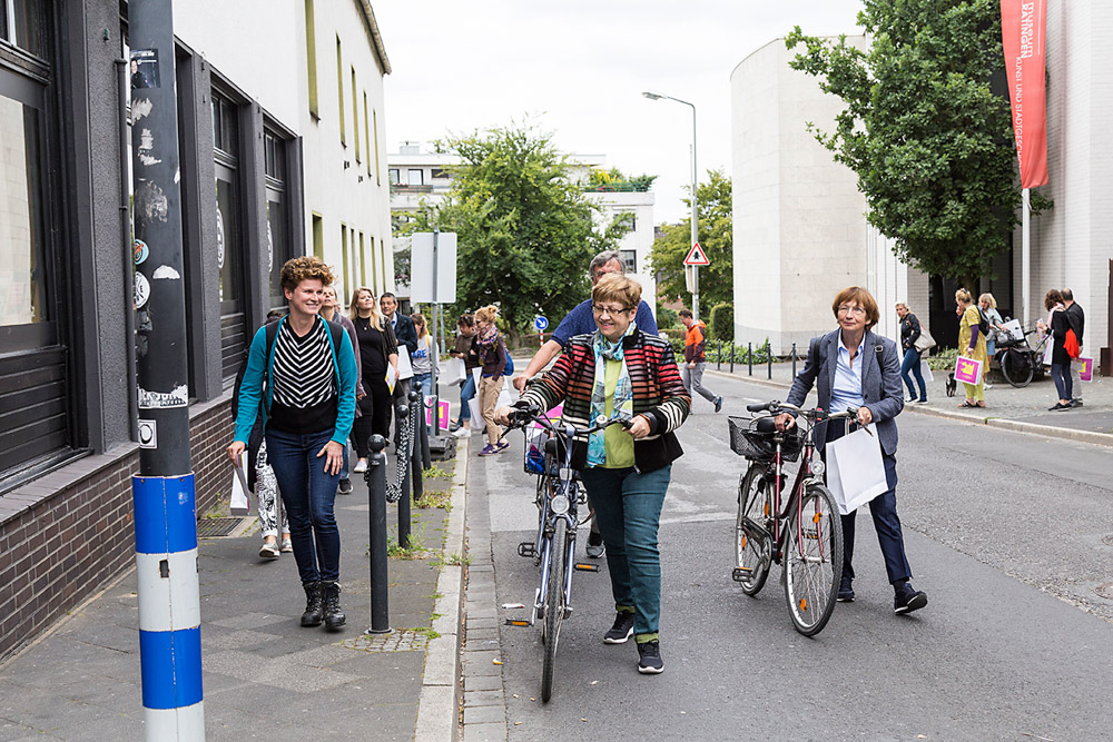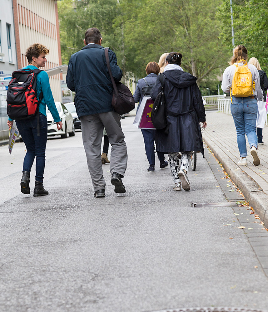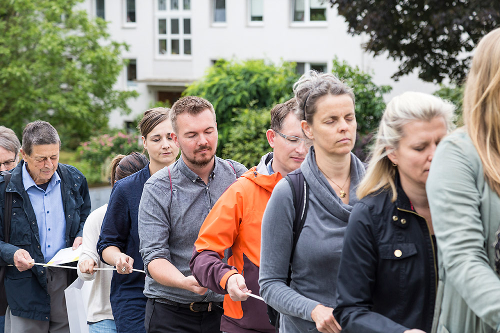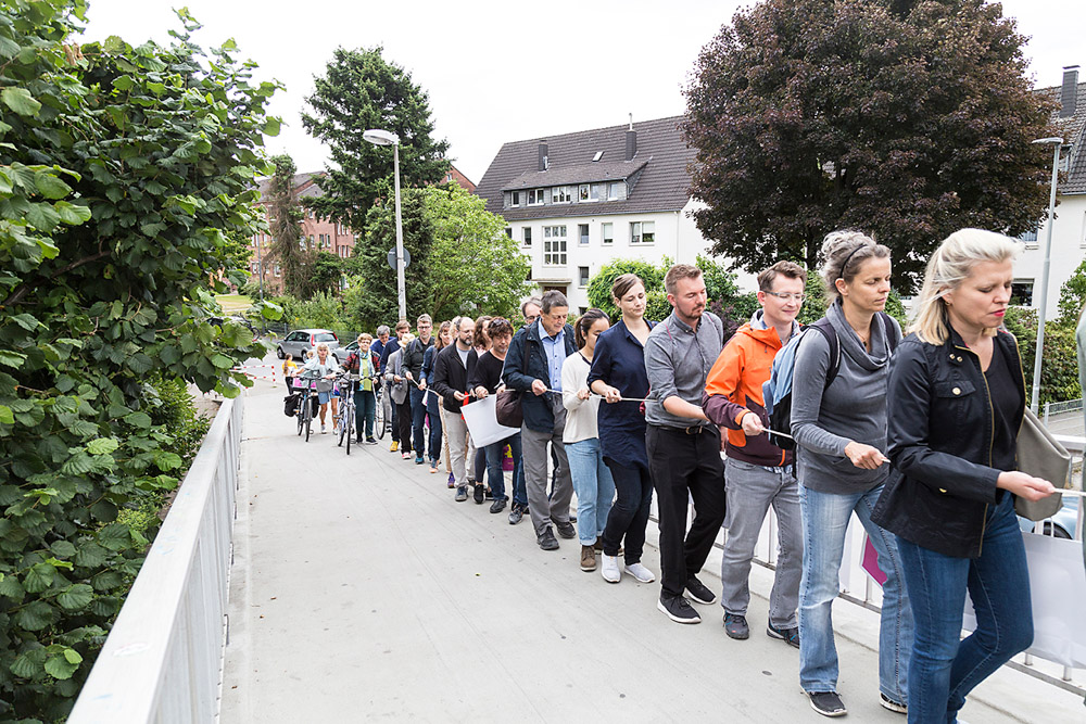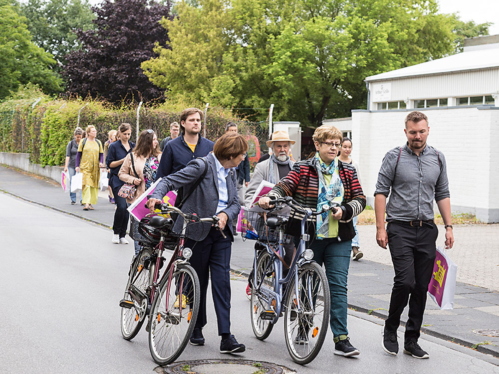 »Durchstreifung Ratingen« – als Fremde dringt die Künstlerin Evamaria Schaller in den Kosmos der Innenstadt ein und verbindet diese mit Ratingen-West durch ein Erlebnis des gemeinsamen Erkundens. Zusammen erforschen wir (Un-)Bekanntes in der ei- genen Stadt. Wir werden zu performativen Akteuren in einem Alltags-Stück, das sich jeden Tag in immer unterschiedlichen Facetten abspielt, uns daher weiter begleitet und mit einer Erfahrung bereichert, die wir an andere weitergeben können.