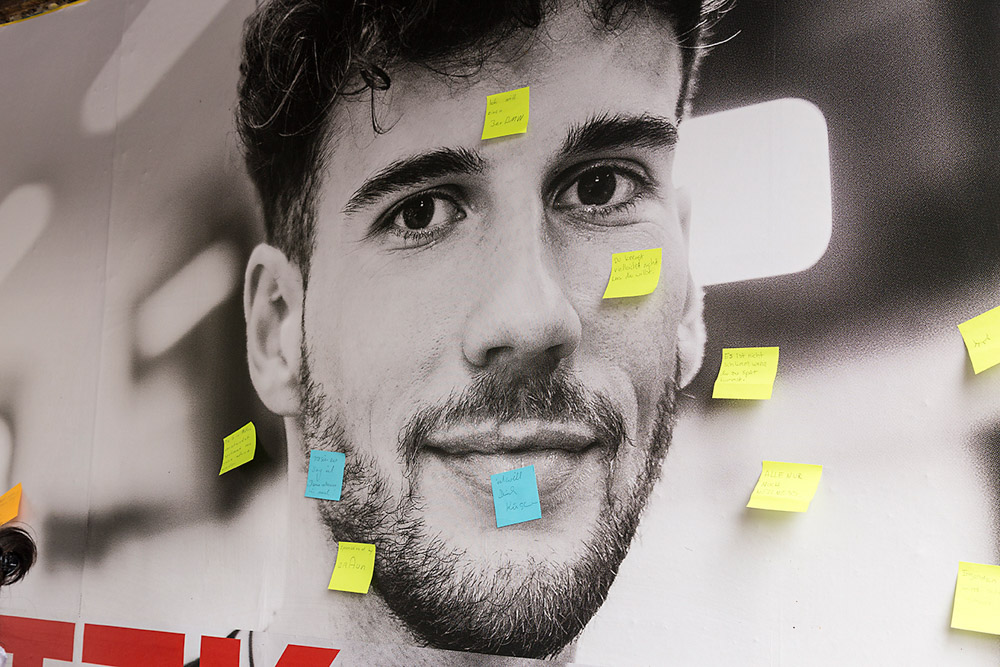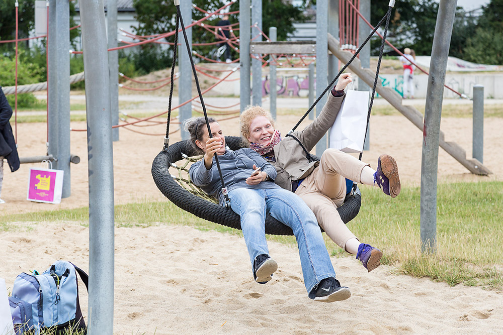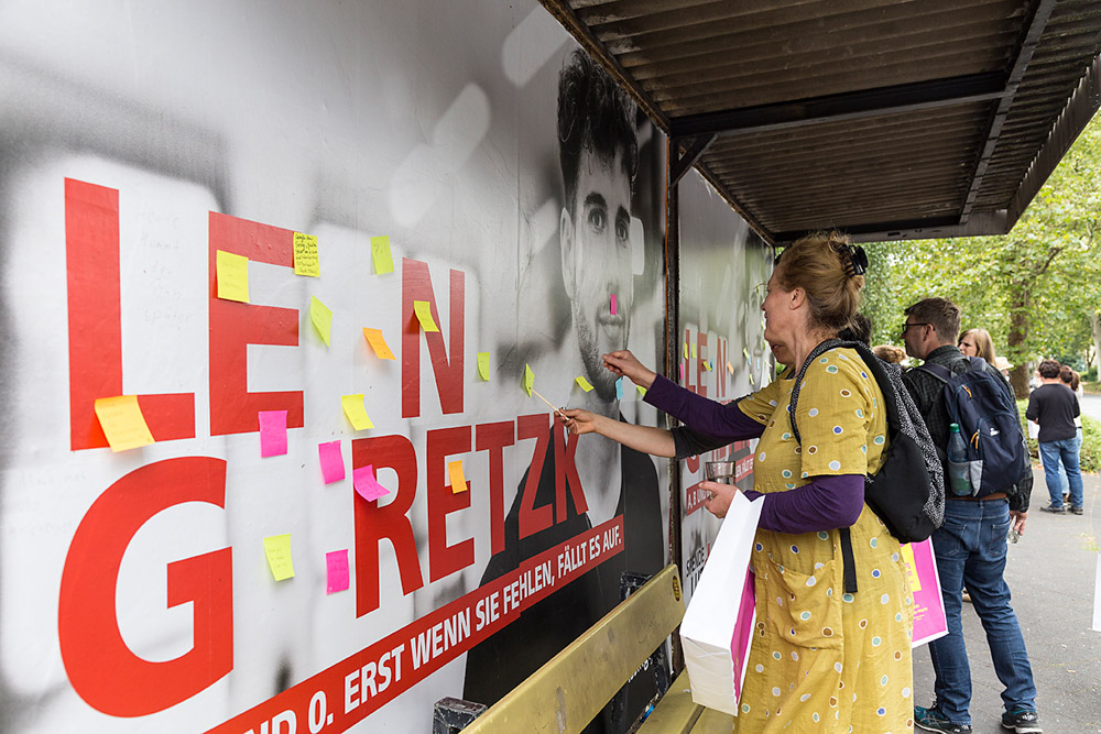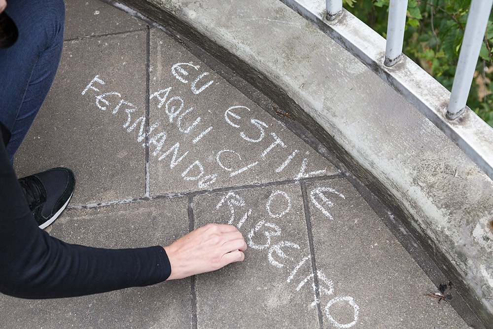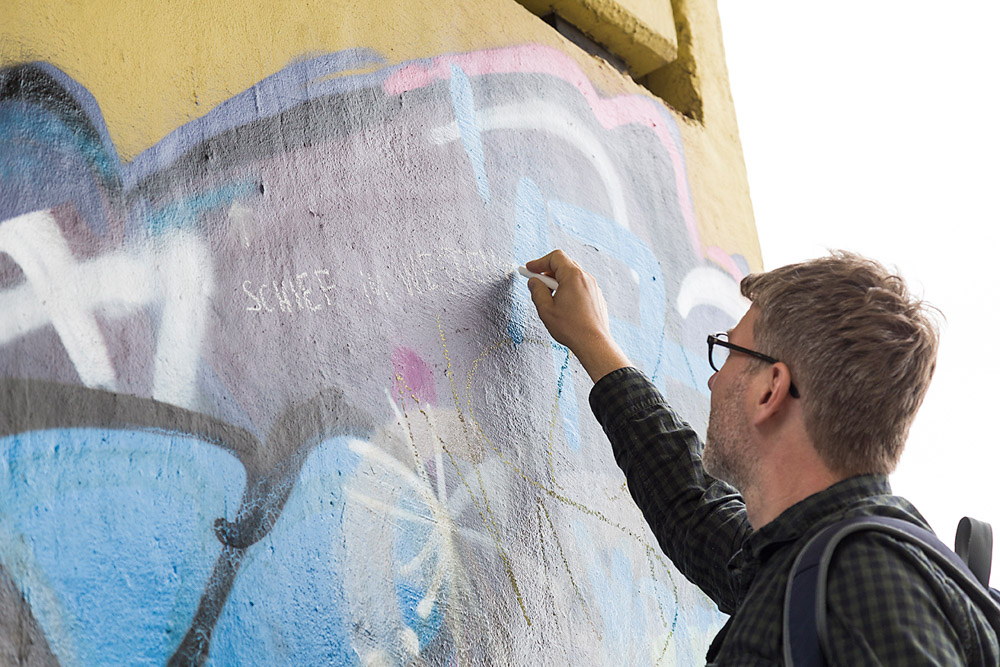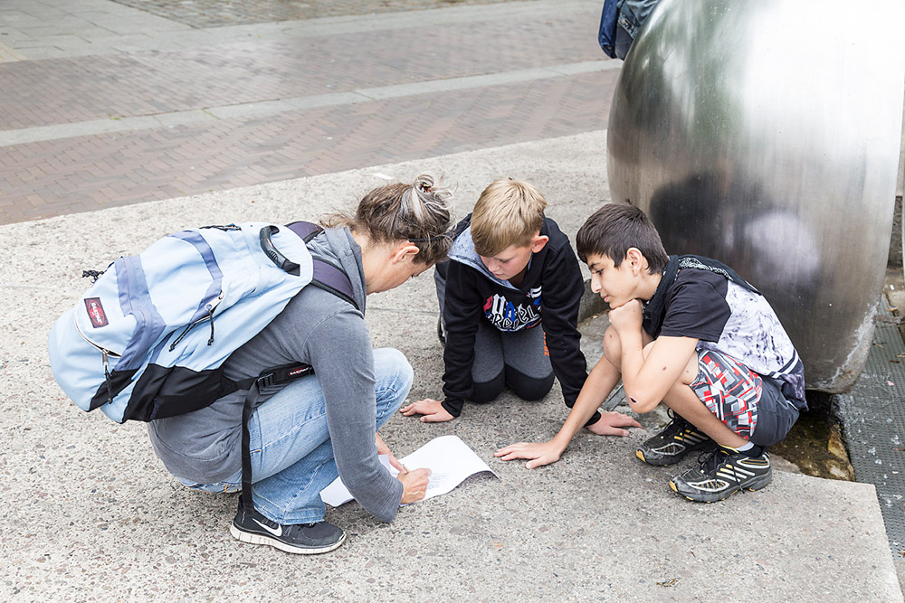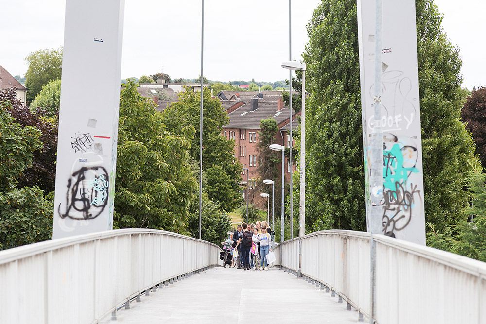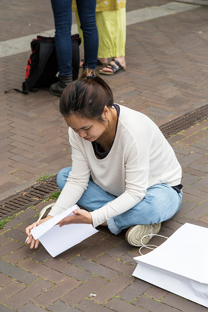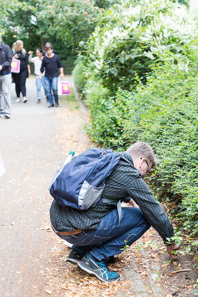 »Durchstreifung Ratingen« – als Fremde dringt die Künstlerin Evamaria Schaller in den Kosmos der Innenstadt ein und verbindet diese mit Ratingen-West durch ein Erlebnis des gemeinsamen Erkundens. Zusammen erforschen wir (Un-)Bekanntes in der ei- genen Stadt. Wir werden zu performativen Akteuren in einem Alltags-Stück, das sich jeden Tag in immer unterschiedlichen Facetten abspielt, uns daher weiter begleitet und mit einer Erfahrung bereichert, die wir an andere weitergeben können.