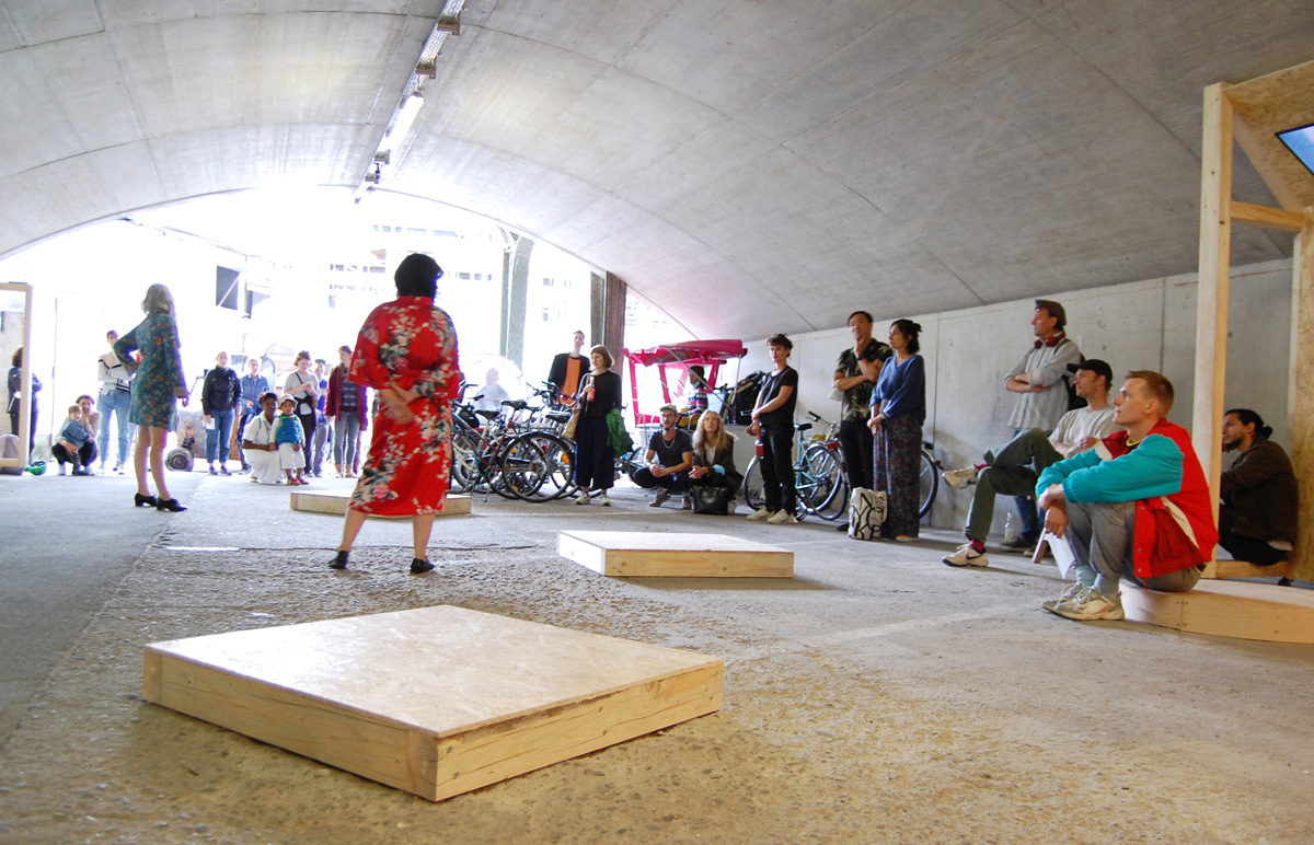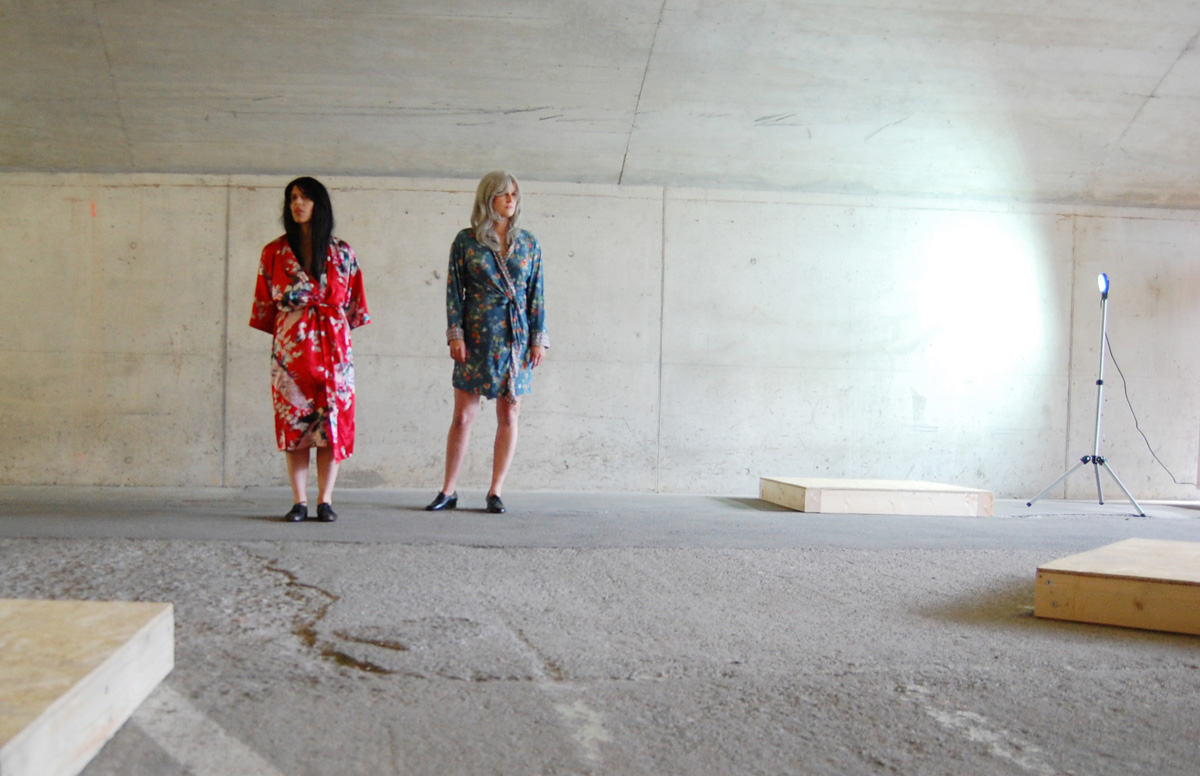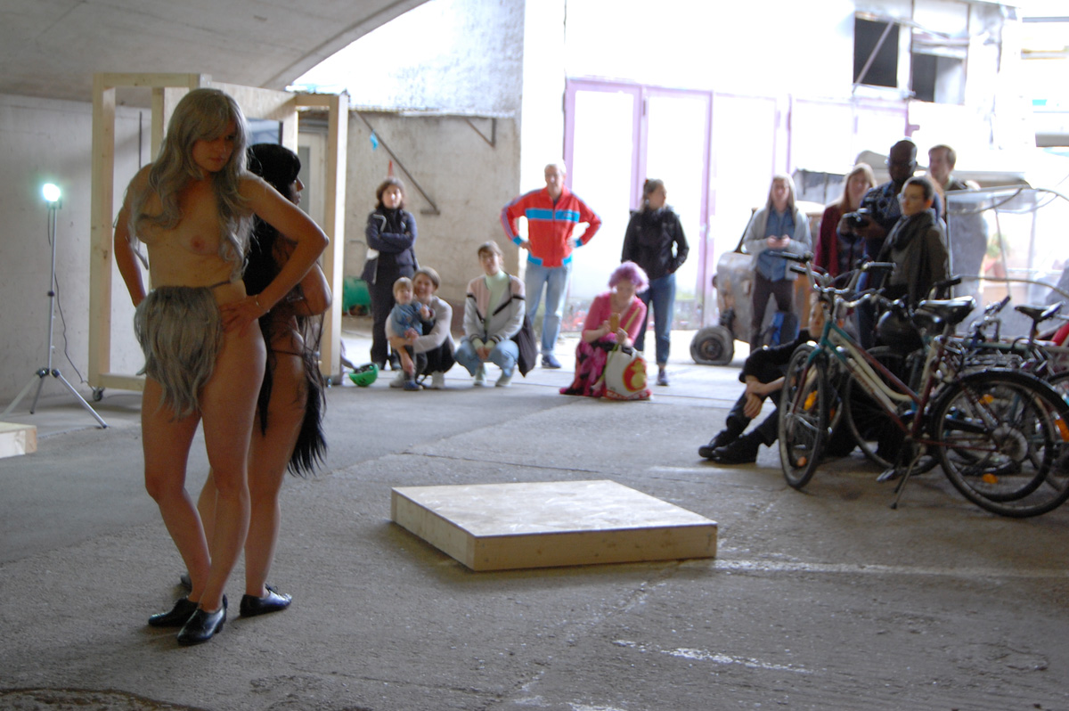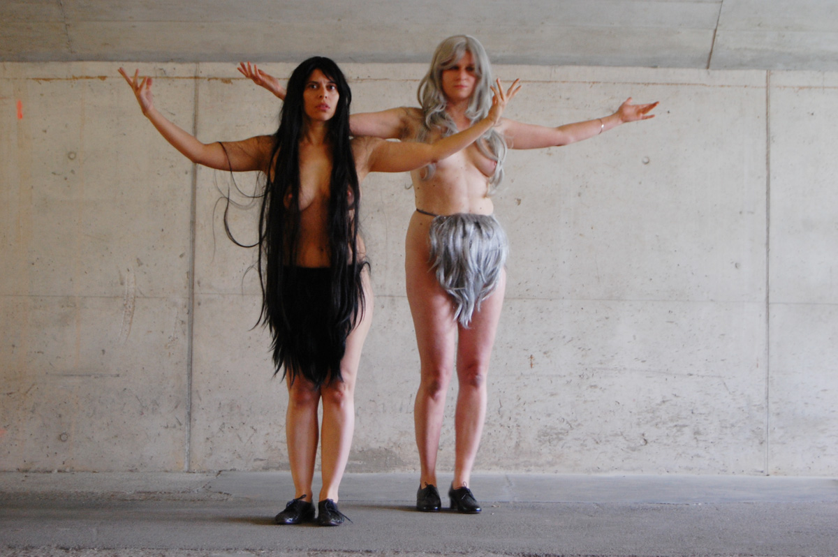 'The performance "pussybeard" by Reut Shemesh & Evamaria Schaller plays with elements of transformation between goddess and human. A seemingly folkloric rite of stomping feet and vibrating flesh embracing poses of animal(e)istic beings.